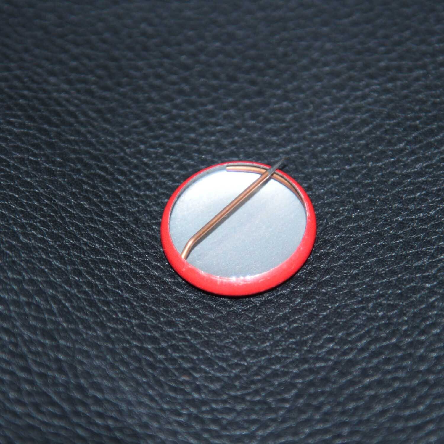 服に刺したあと針を少し曲げながらバッジの縁に先端を引っ掛けます。