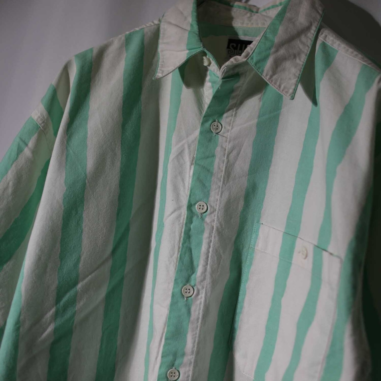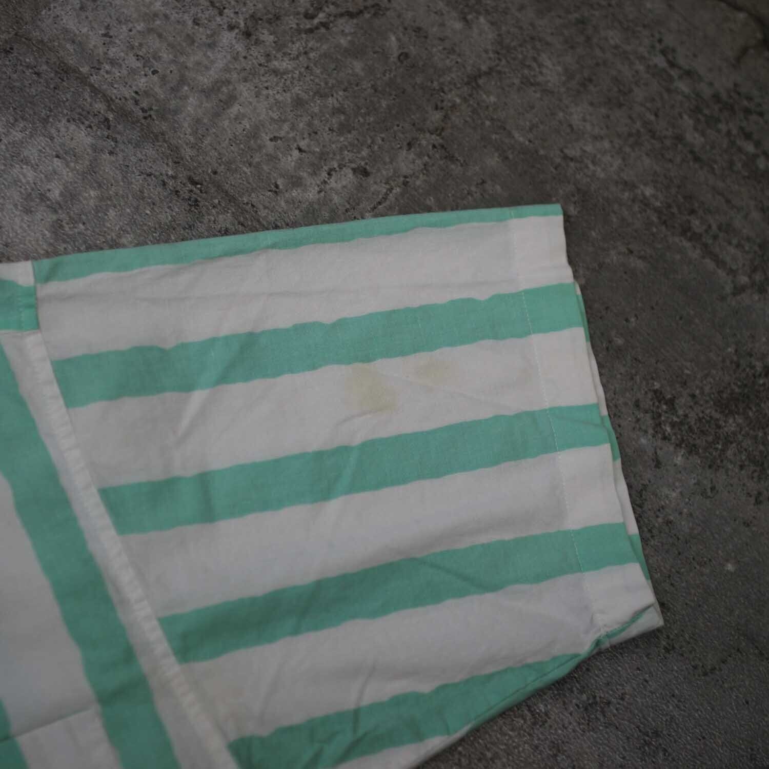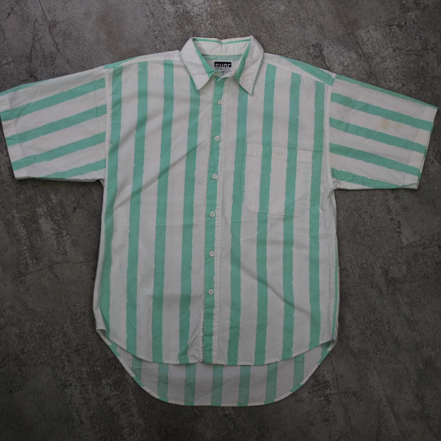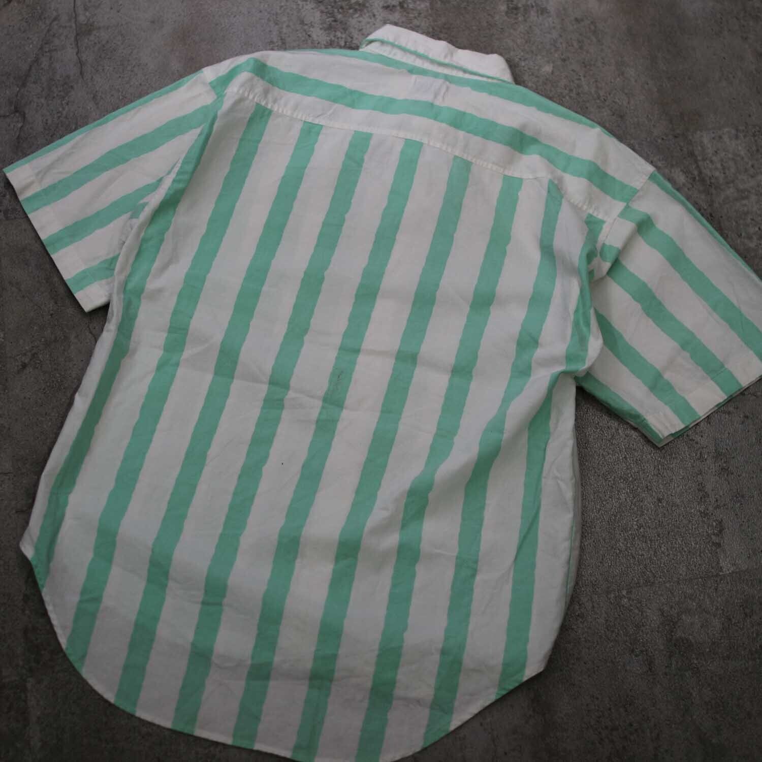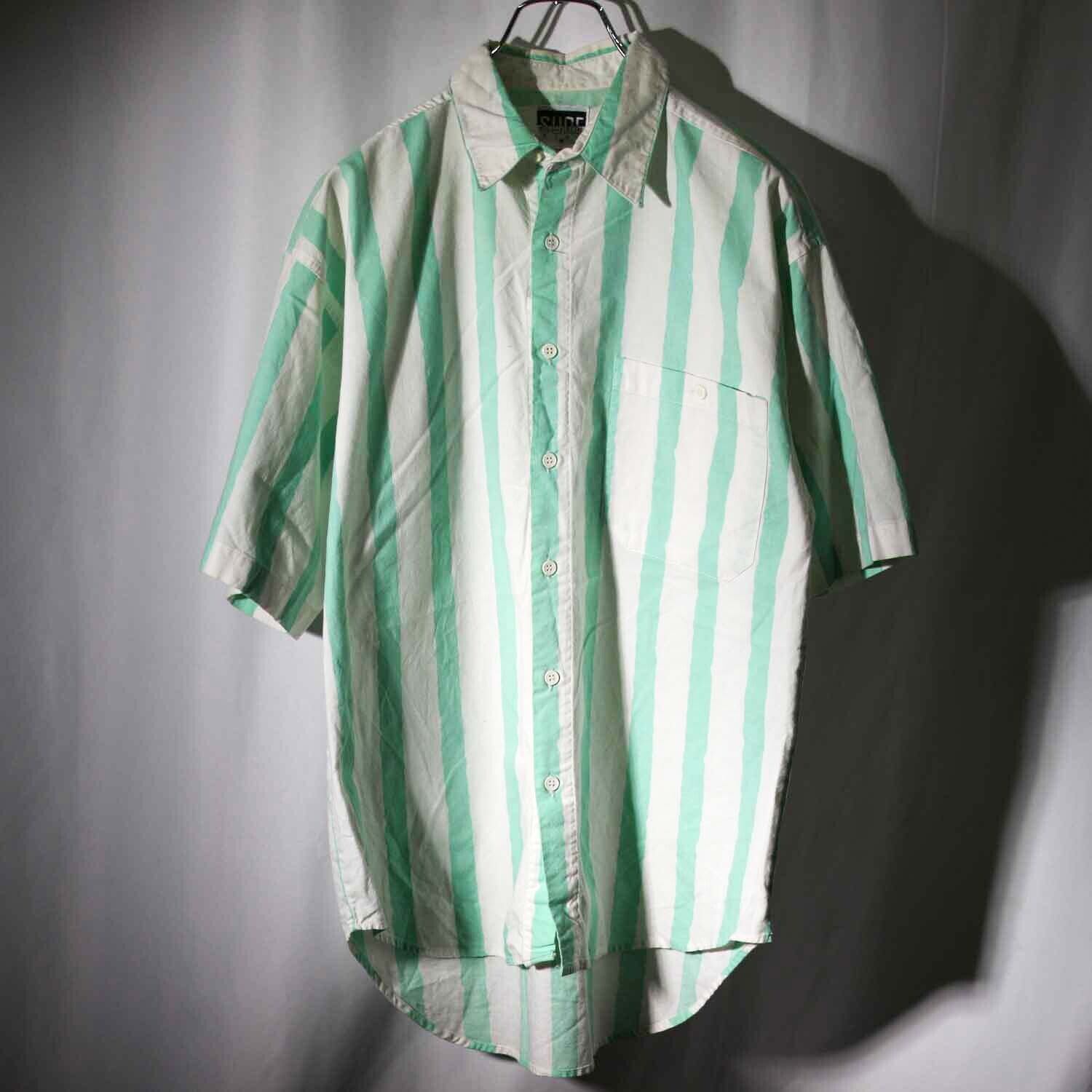 90s「SURF GEAR」 GREEN STRIPE s/s shirts Msize サーフギア サーフ 半袖シャツ コットン グリーン ストライプ 古着【furugi-1634】
