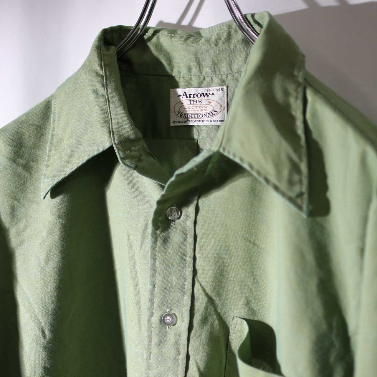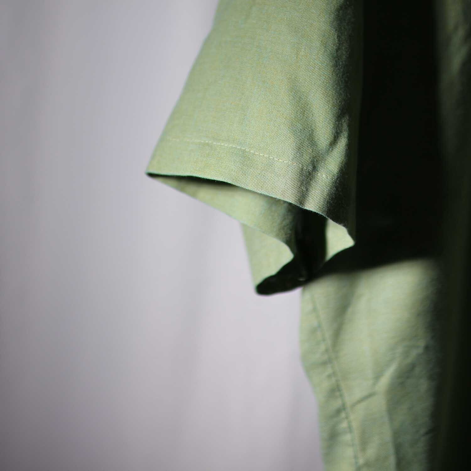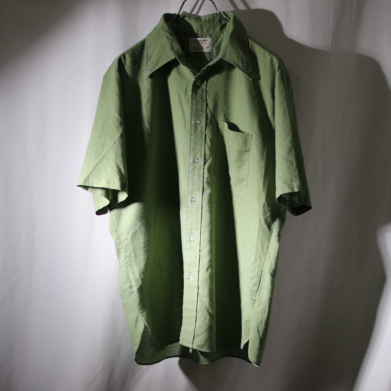 70s vintage 「ARROW」 s/s shirts 玉虫カラー アロー ヴィンテージ 半袖シャツ L ポリエステル パーマ・アイロン デクトン生地 グリーン 古着【furugi-1635】