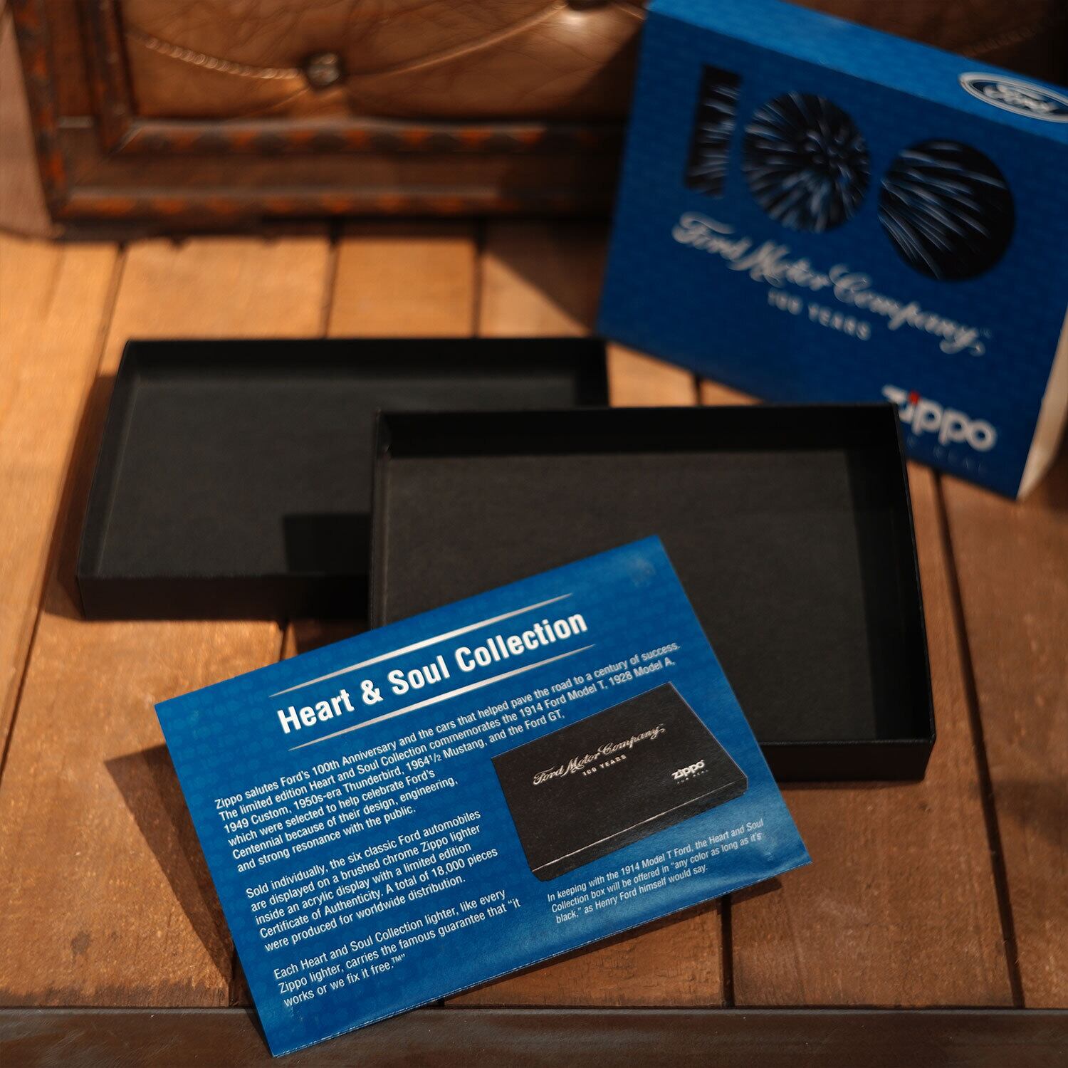 6台のフォードのクラシックカーは、ブラッシュクローム仕上げの Zippoライター にプリントされ、アクリル製のディスプレイに収められています。限定版の証明書が付属します。全世界で合計18,000個が製造されました。