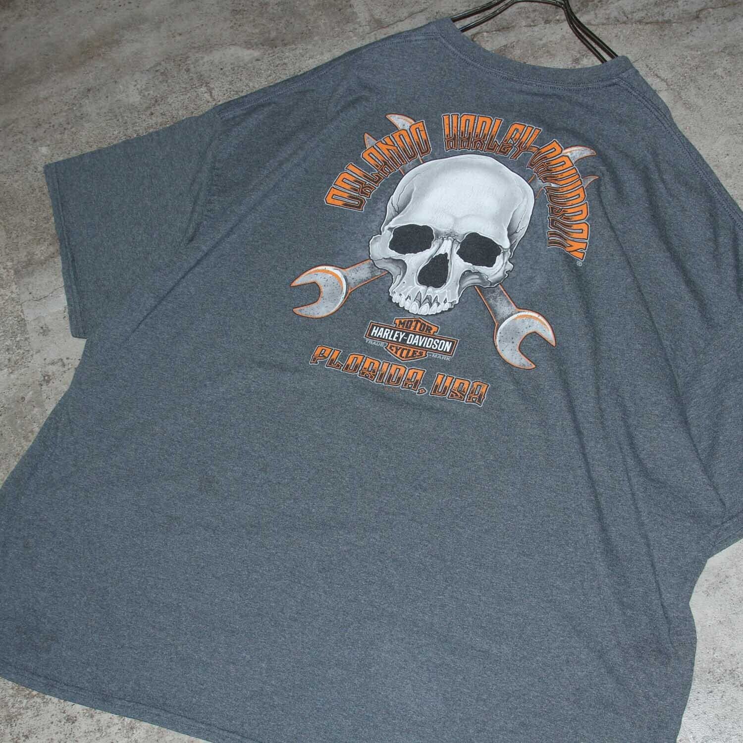 古着 2017s 良デザイン 5XL Harley-Davidson 半袖Tシャツ ハーレーダビッドソン モーター 車 バイク コットン グレー オレンジ スカル【furugi-1566】