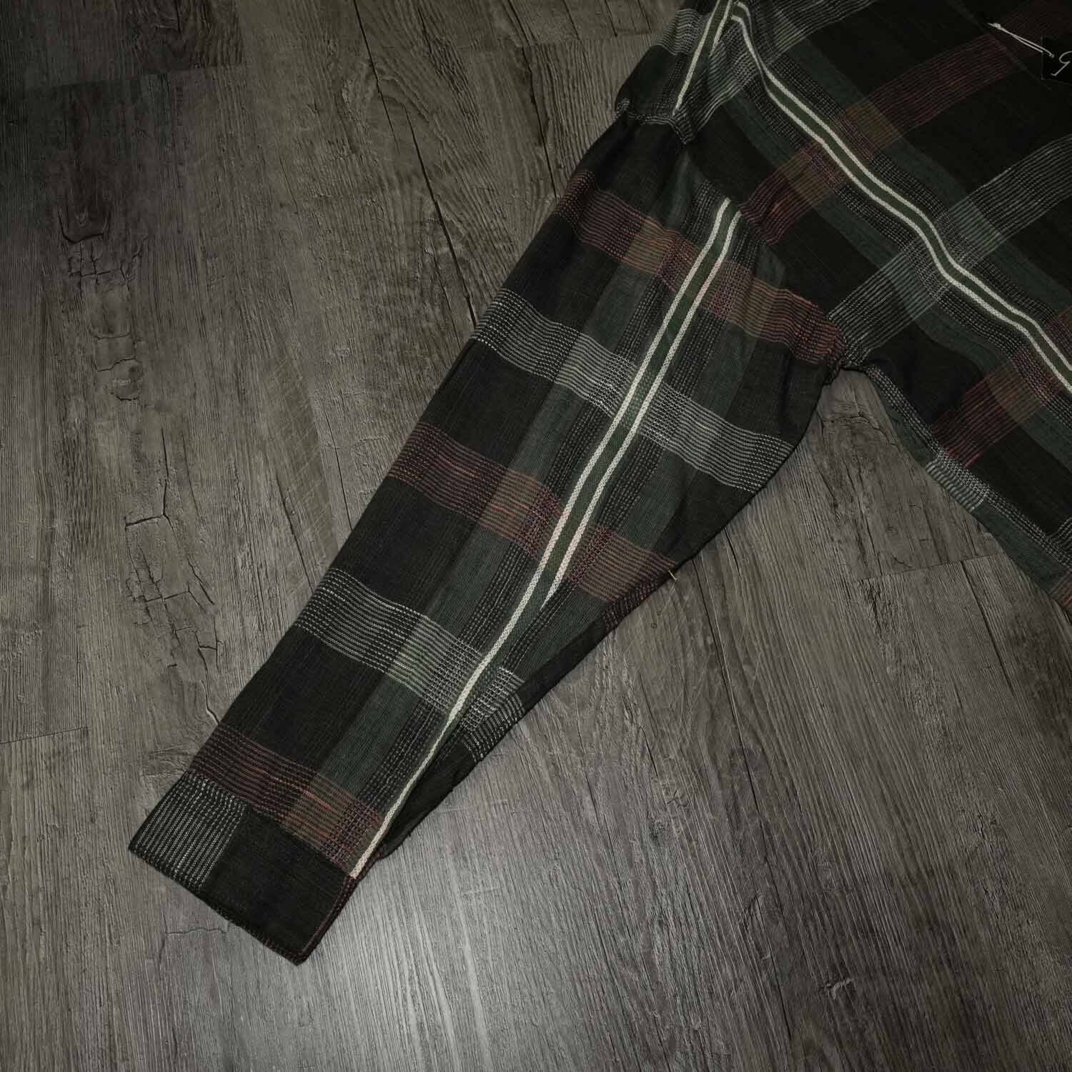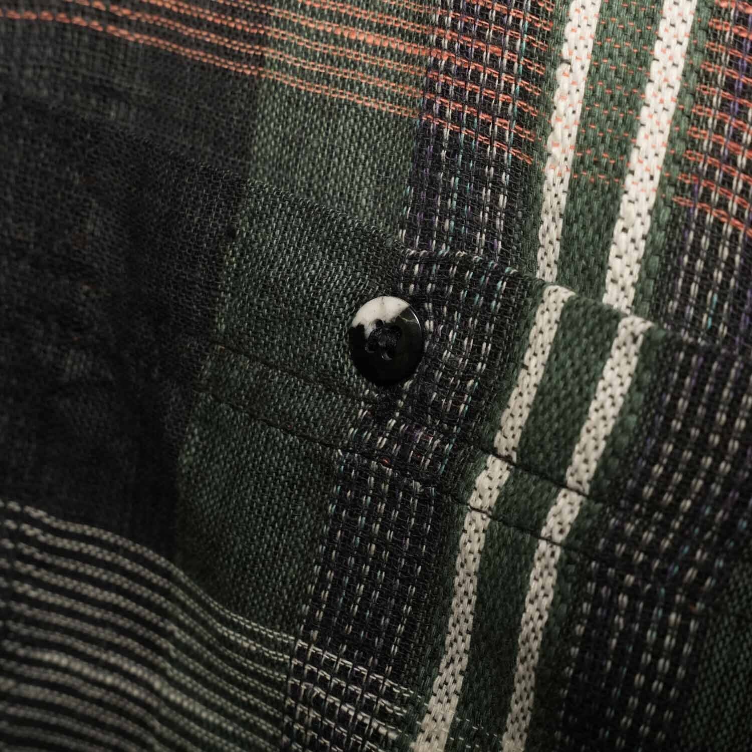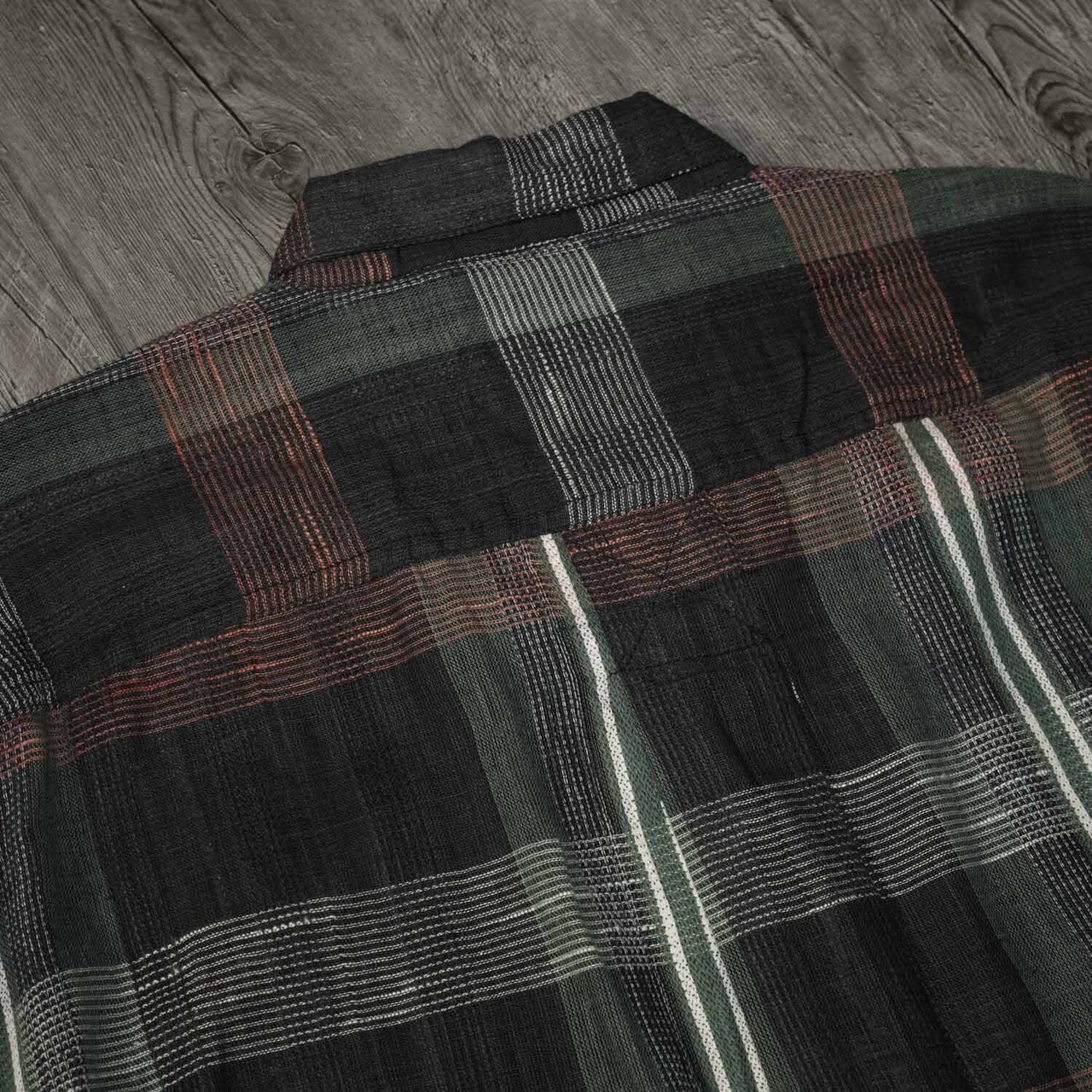 くすんだ色味のグリーンやブラウンのラインが交差する落ち着いたパターンが特徴。生地にはややスラブ感があり、ナチュラルで少しダッド感もあり、ヴィンテージライクな風合いが感じられます。