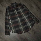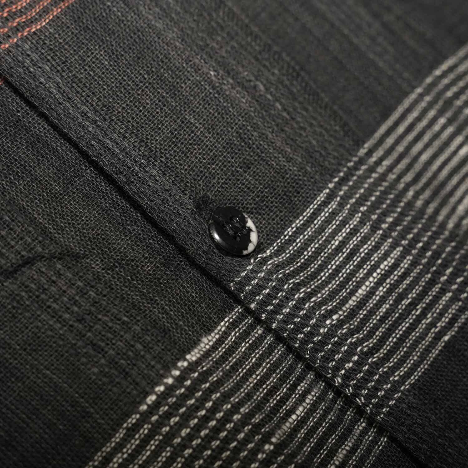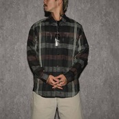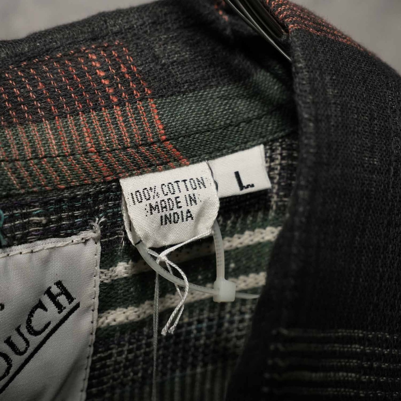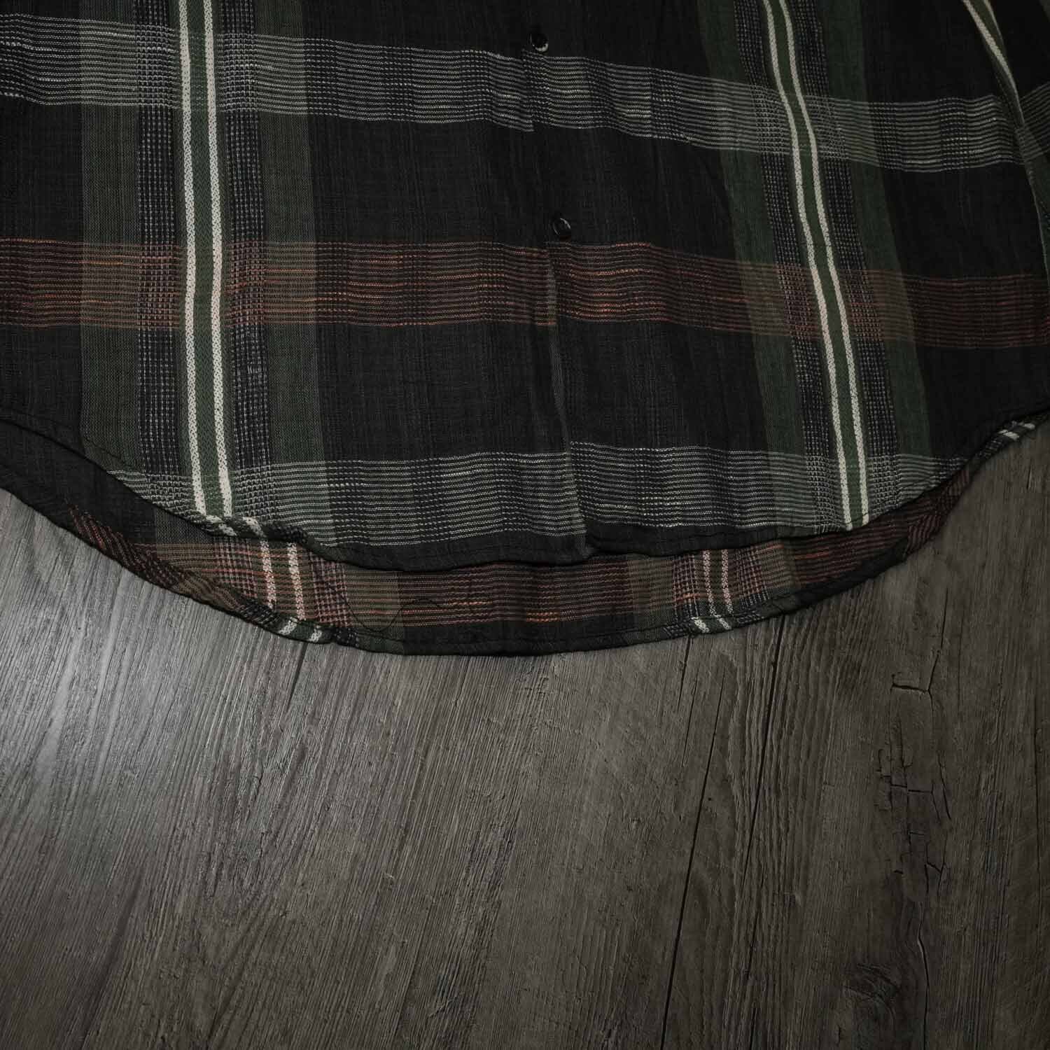 くすんだ色味のグリーンやブラウンのラインが交差する落ち着いたパターンが特徴。生地にはややスラブ感があり、ナチュラルで少しダッド感もあり、ヴィンテージライクな風合いが感じられます。