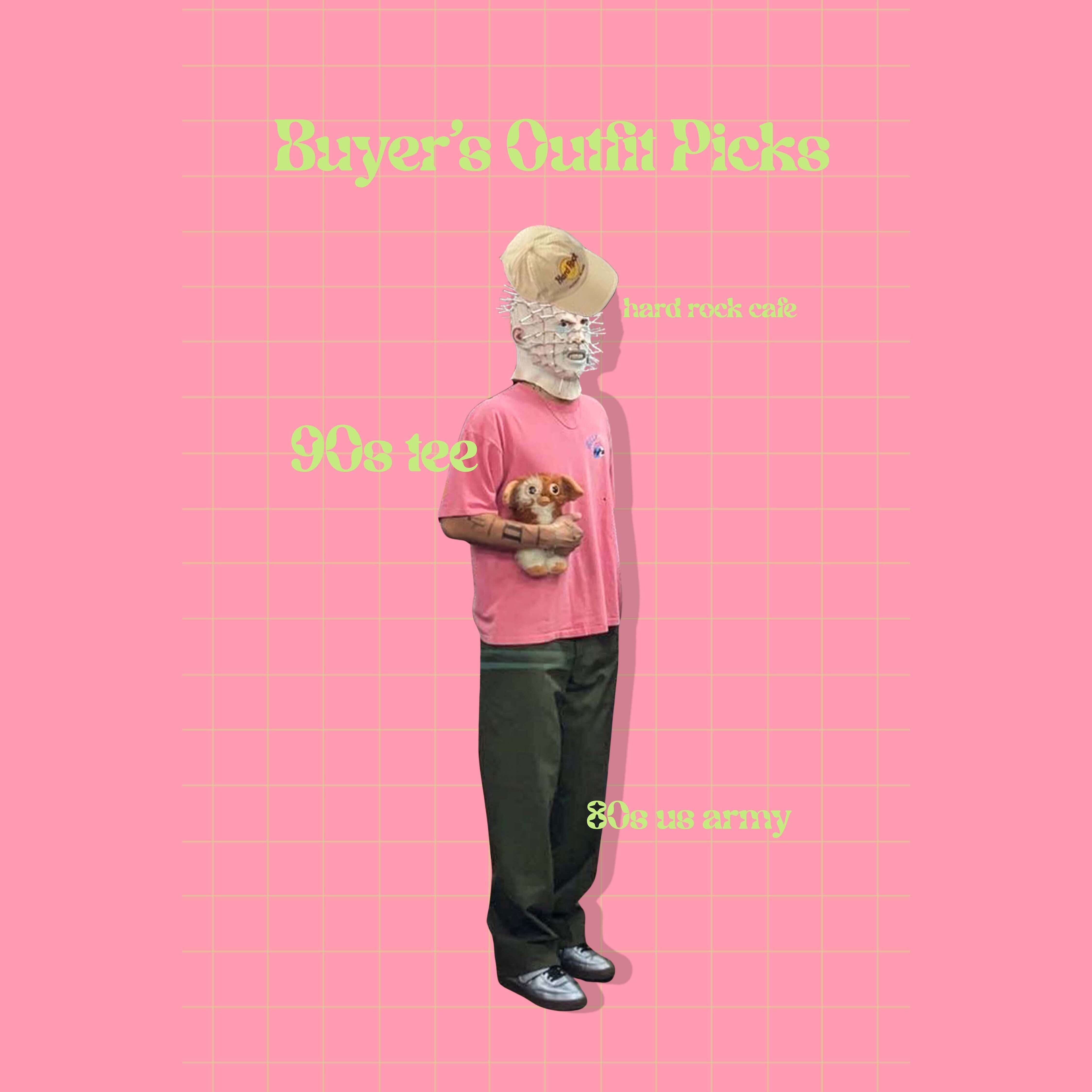 90sのスポーツアイテム〜militaryヴィンテージまで、クロスオーバーするジャンルを1つのコーデに落とし込んだ上級者BOX。ピンク×カーキが意外や相性が良く、コーデの核となっています。上に春っぽいカラーのリーバイス70sシャツを羽織って春先も使えるスタイリング!ハードロックカフェのキャップも気分に合わせて。