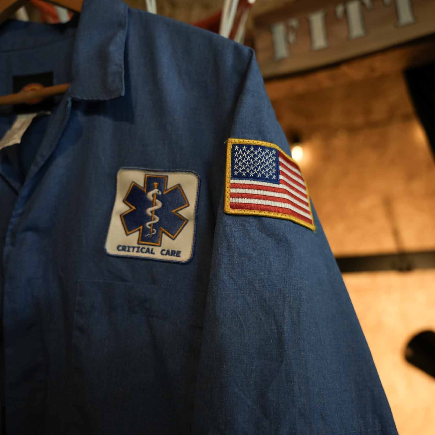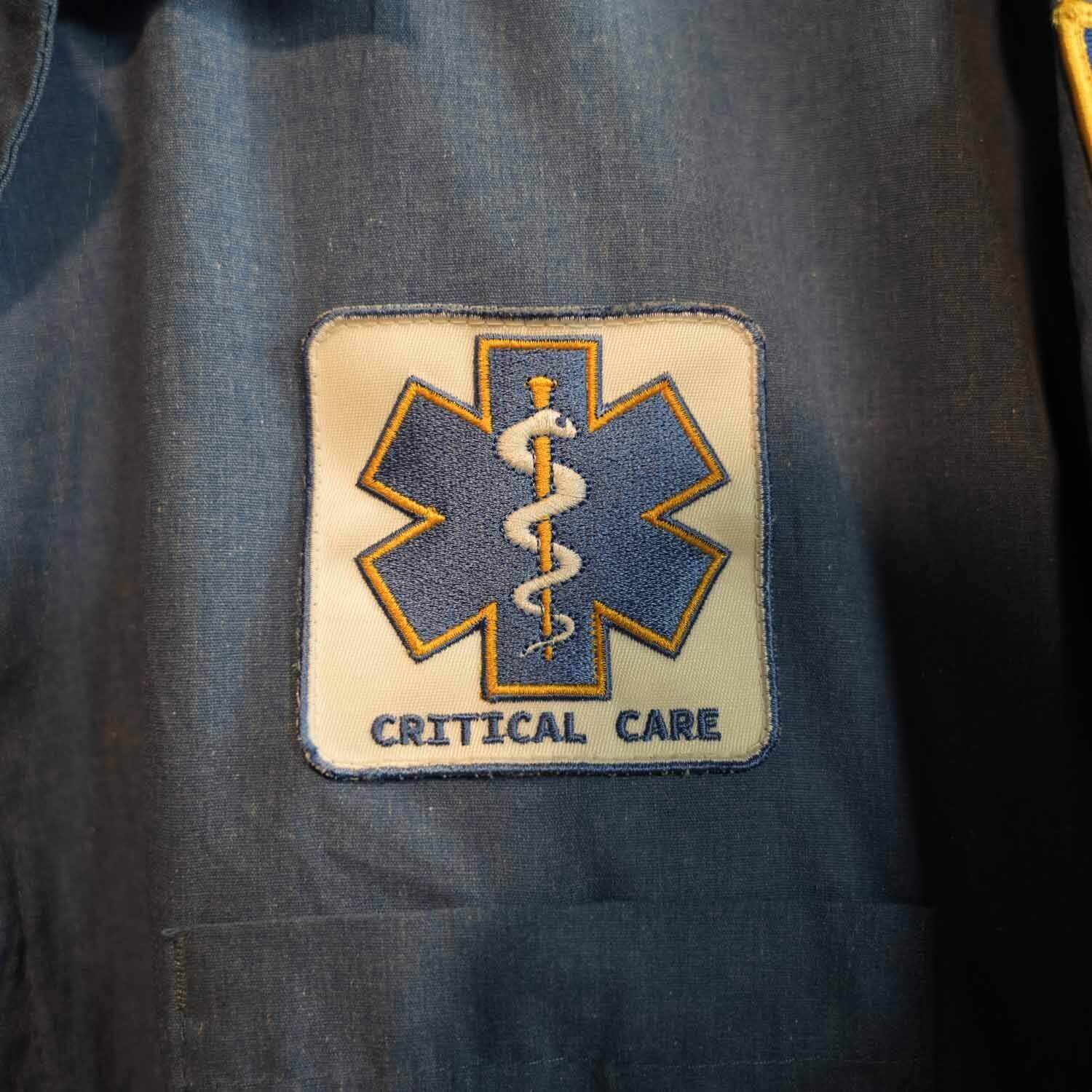 胸元には医療関係を示す「CRITICAL CARE(集中治療)」の刺繍ワッペン、右肩にはアメリカ国旗パッチが付いています。