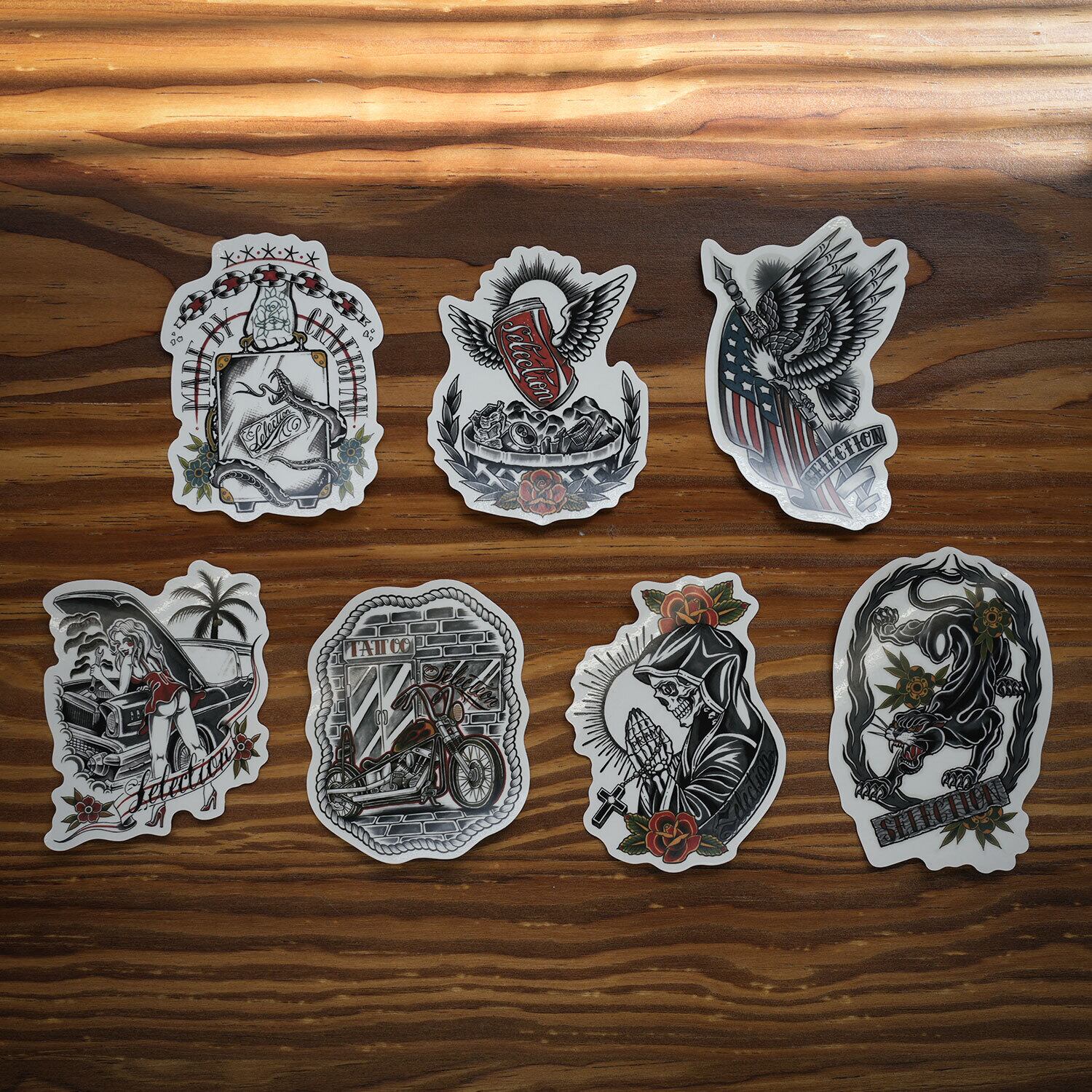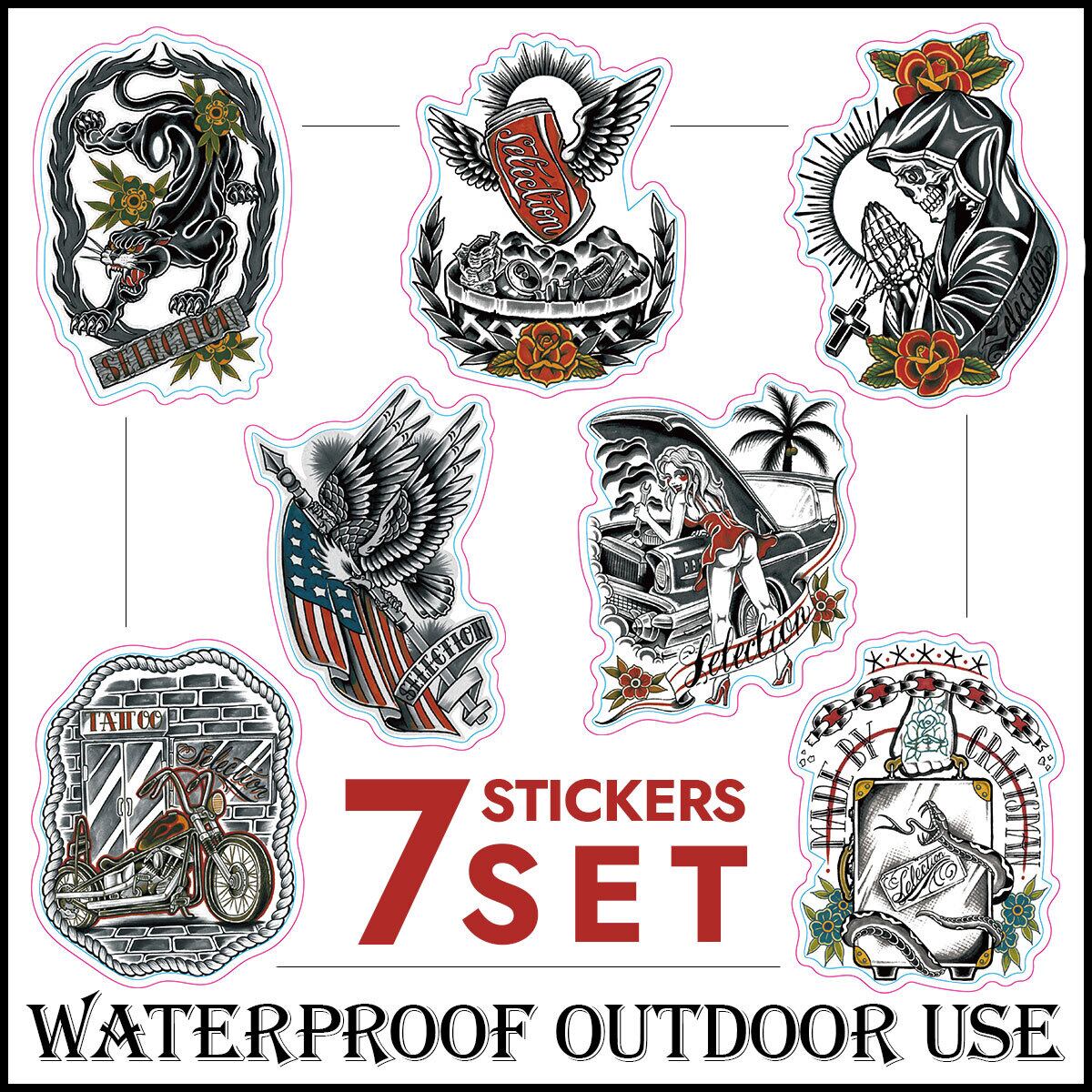 Fans of American culture and classic tattoo art; anyone who wants to add attitude to garage or outdoor gear; quick shop-window or fixture customization. Use each sticker solo or line them up for a cohesive look.