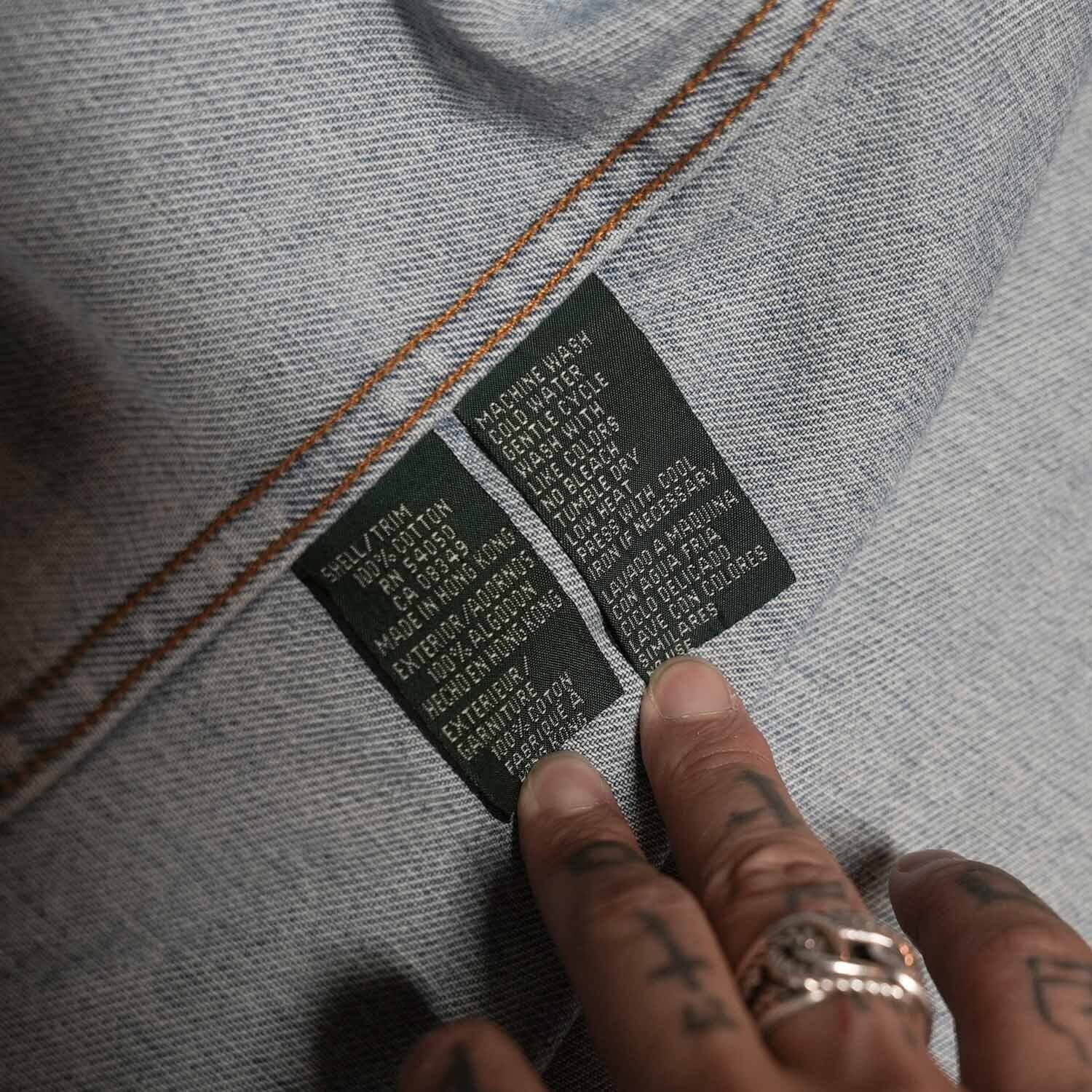 フロントは4ポケット仕様で、胸ポケットはフラップ付き、腰ポケットは大容量。しっかりとしたオンスのデニム生地を使用しており、タフな質感ながら着込むほどに柔らかく体に馴染んでいきます。MADE IN HONG KONG の表記がある点も、90年代アイテムらしい魅力のひとつ。