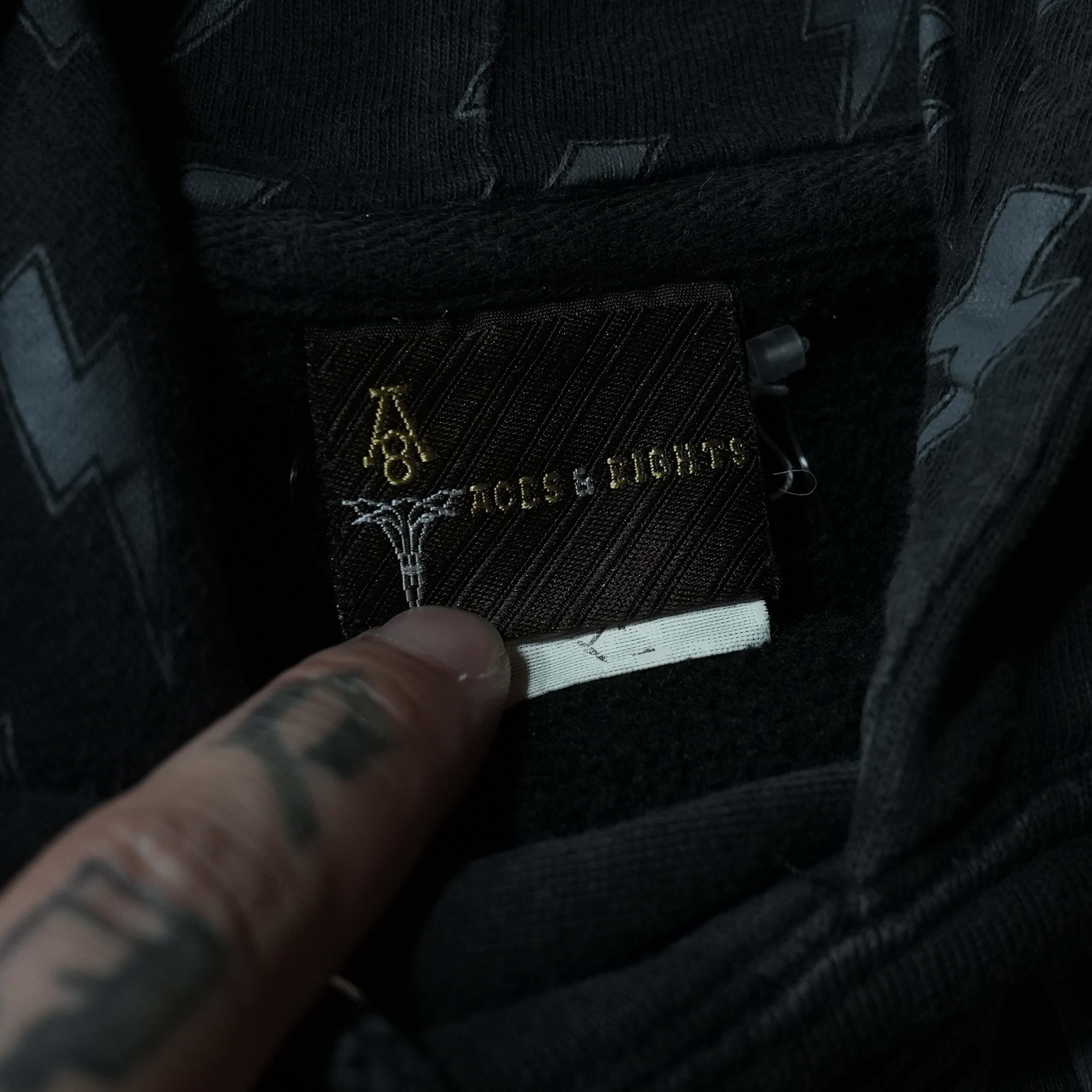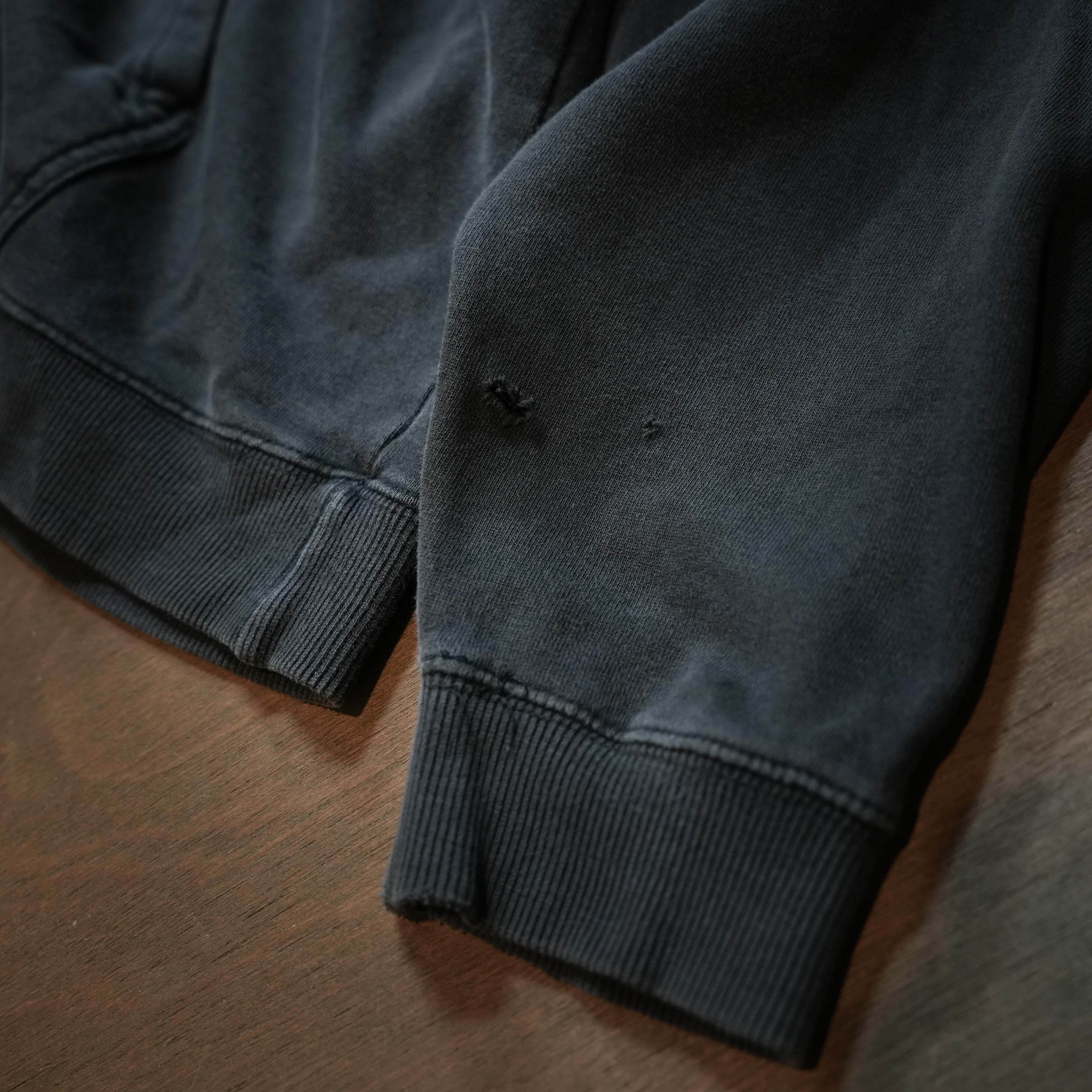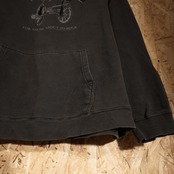 素材はコットン80%・ポリエステル20%のしっかりとしたスウェット生地。フード裏地にはライトニング柄がプリントされ、細部まで遊び心のあるデザインに仕上がっています。ブラックのボディにフェード感が加わり、古着ならではの風合いが魅力。ストリートスタイルからロックコーデまで幅広く活躍します。