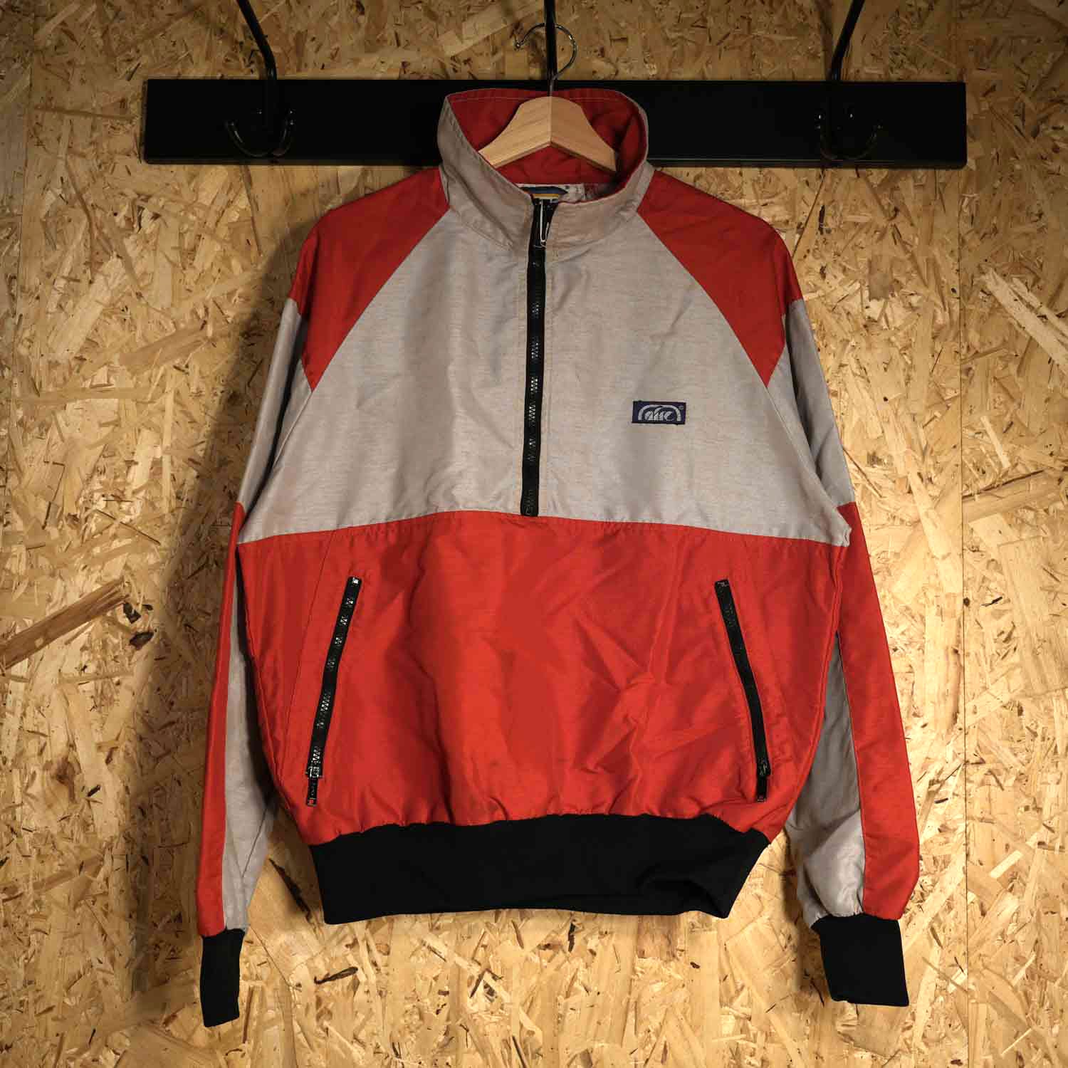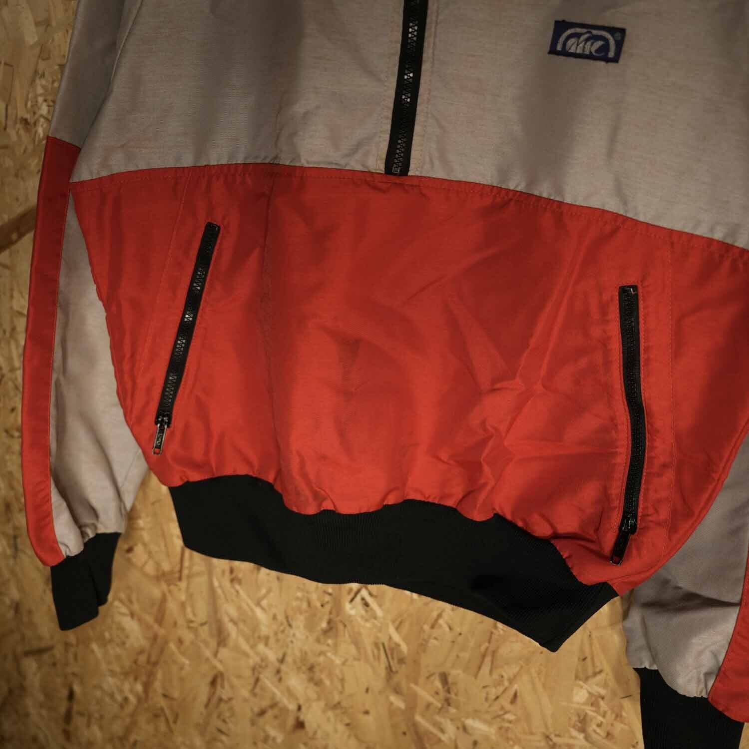 80〜90年代らしい鮮やかなレッドとグレーの切り替えデザインが特徴で、ストリートにも映える一枚です。ショート丈気味のシルエットとリブ仕様の裾が、今のファッションにマッチするトレンド感を演出します。