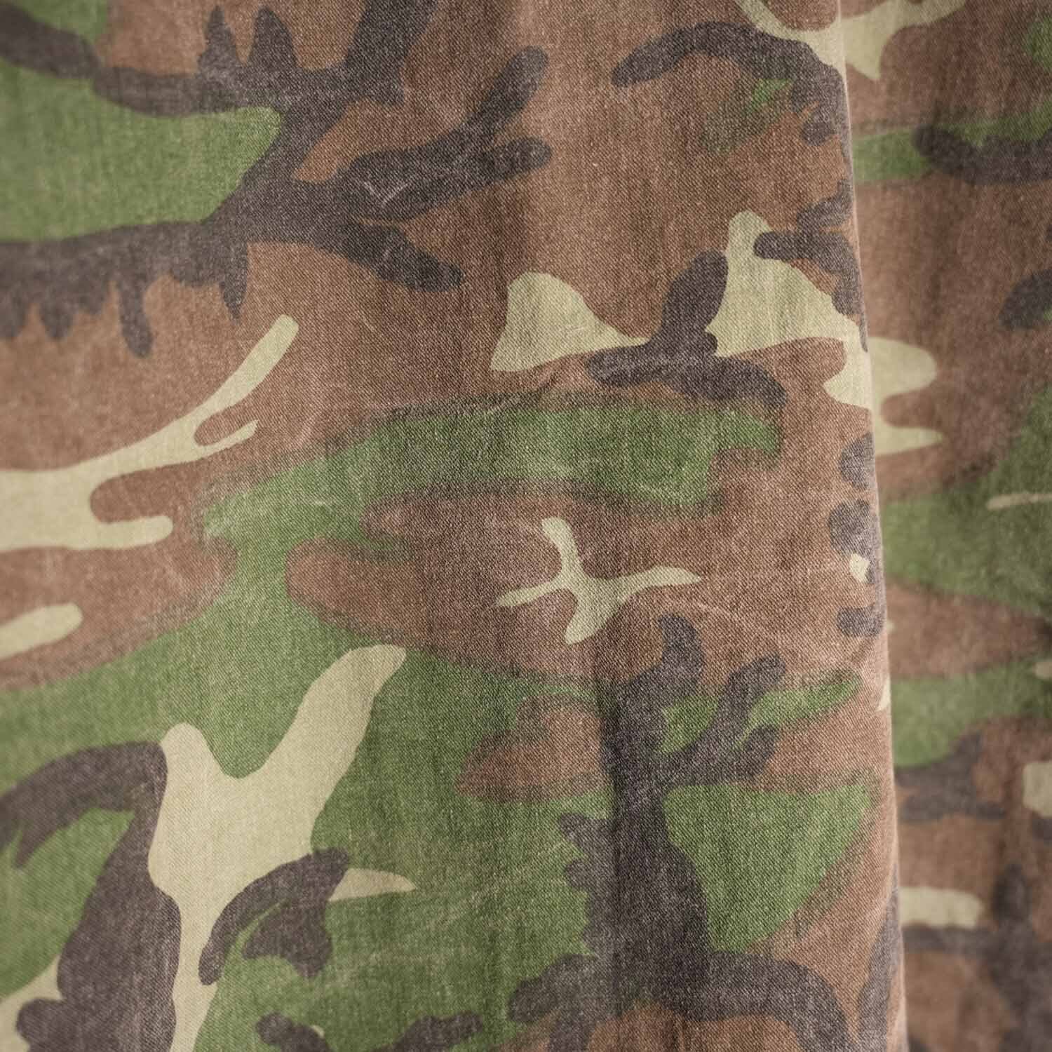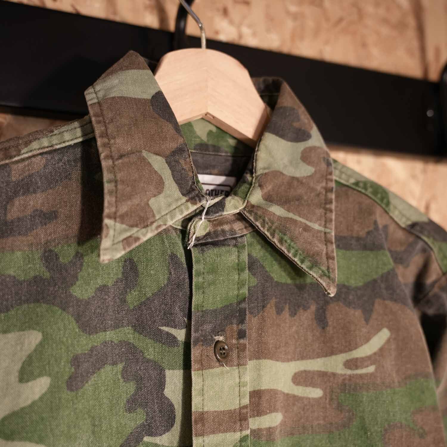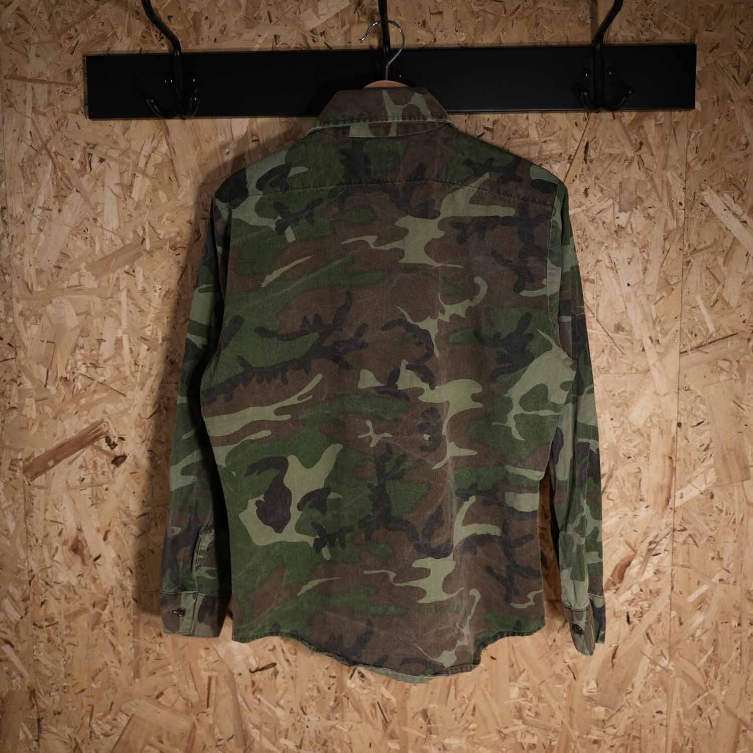 特徴は厚みのあるタフなコットン生地に、雰囲気抜群のウッドランドカモ柄。フロントは両胸にフラップポケットが付き、ワークシャツらしい実用性を備えています。長年の着用でしか出せないフェード感やアタリも魅力で、ヴィンテージならではの風合いを楽しめます。