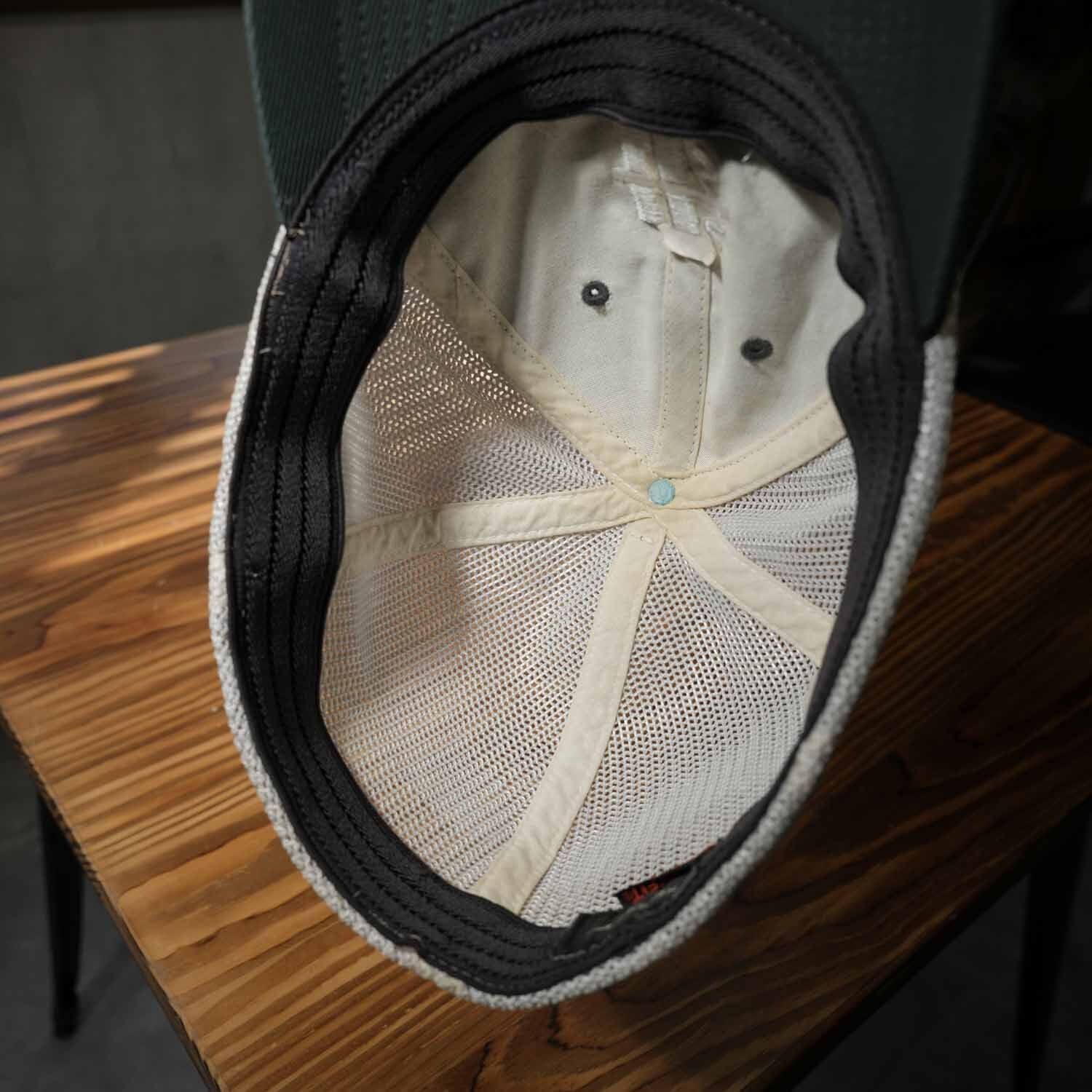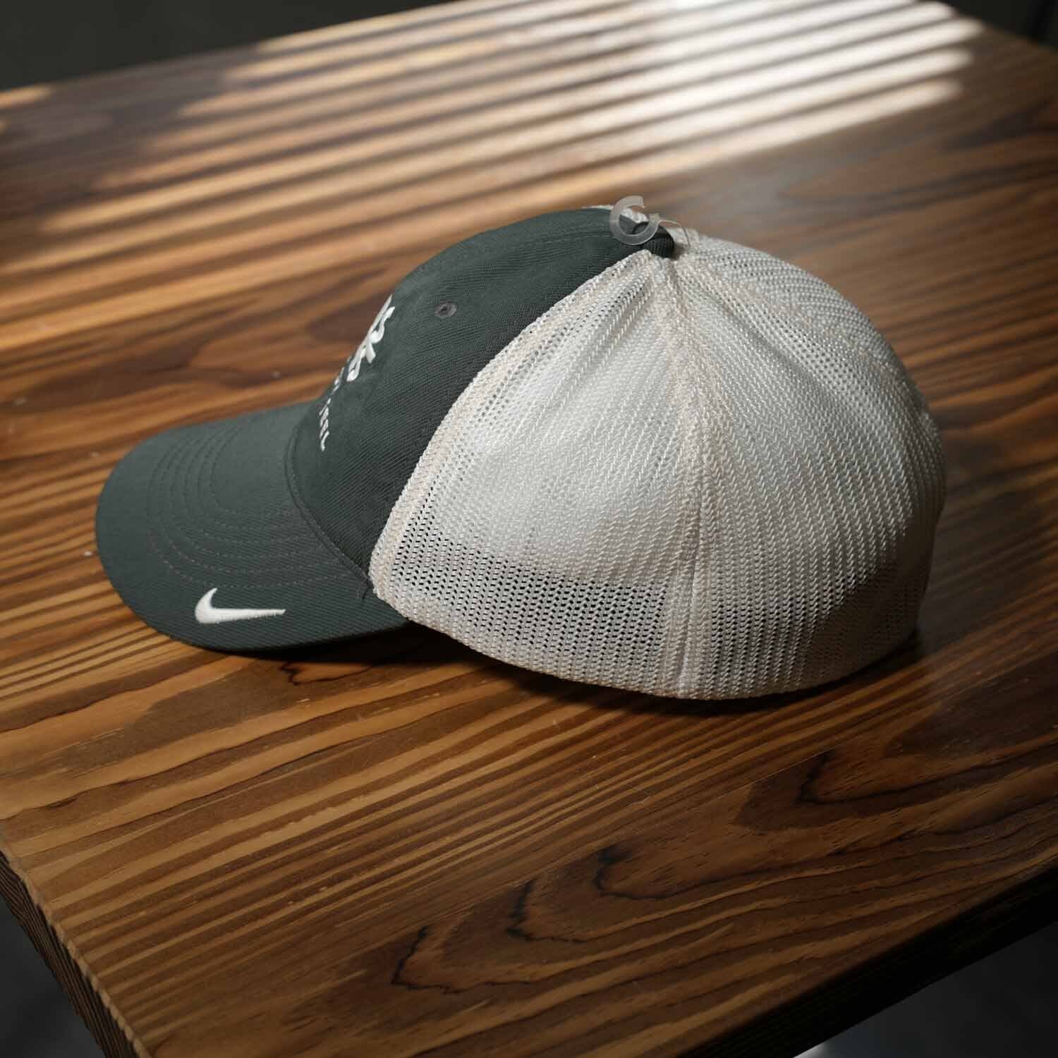 フロントは深みのあるグリーンにホワイト刺繍ロゴ、バックは通気性抜群のホワイトメッシュ仕様。サイドと背面にはさりげなくナイキのスウッシュが入り、ブランドの存在感を主張します。