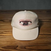 アメリカ南部・テネシー州に位置する人気観光地「グレートスモーキー山脈(GREAT SMOKY MOUNTAINS)」と、同地を代表する街「PIGEON FORGE」の名を冠したヴィンテージメッシュキャップ。フロントにはベア(熊)と森林をモチーフにしたプリントが施され、アメカジらしいワイルドな雰囲気を放ちます。フロントのロープ装飾も、70〜90年代のキャップに多く見られるディテールです。