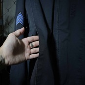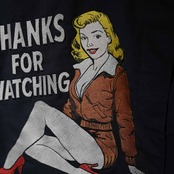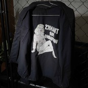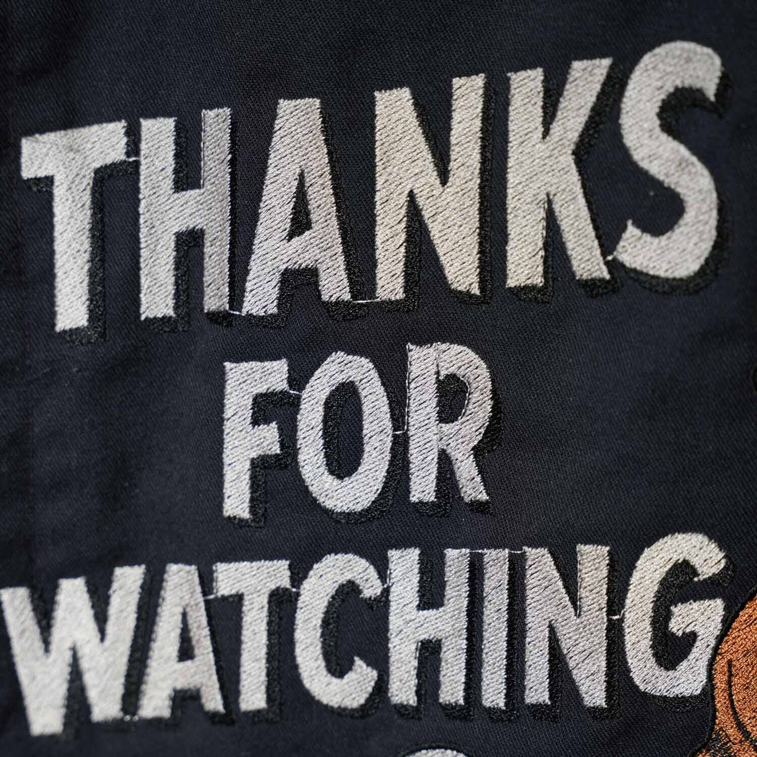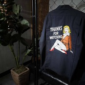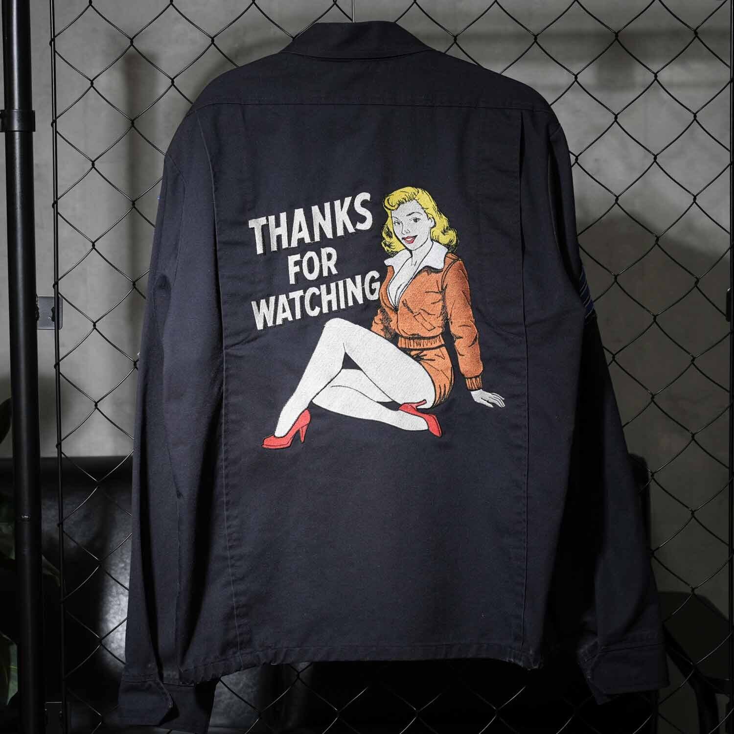 背面にはピンナップガールと「THANKS FOR WATCHING」のビッグ刺繍が施され、フロント袖には「VA POLICE」ワッペンや階級章パッチを配した存在感抜群の一着。ネイビーボディに映える刺繍とパッチは、アメカジやロックスタイルにも映えること間違いなしです。