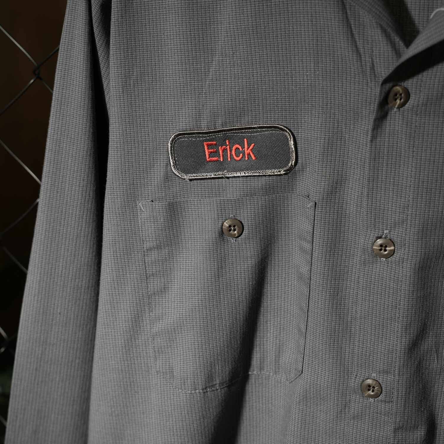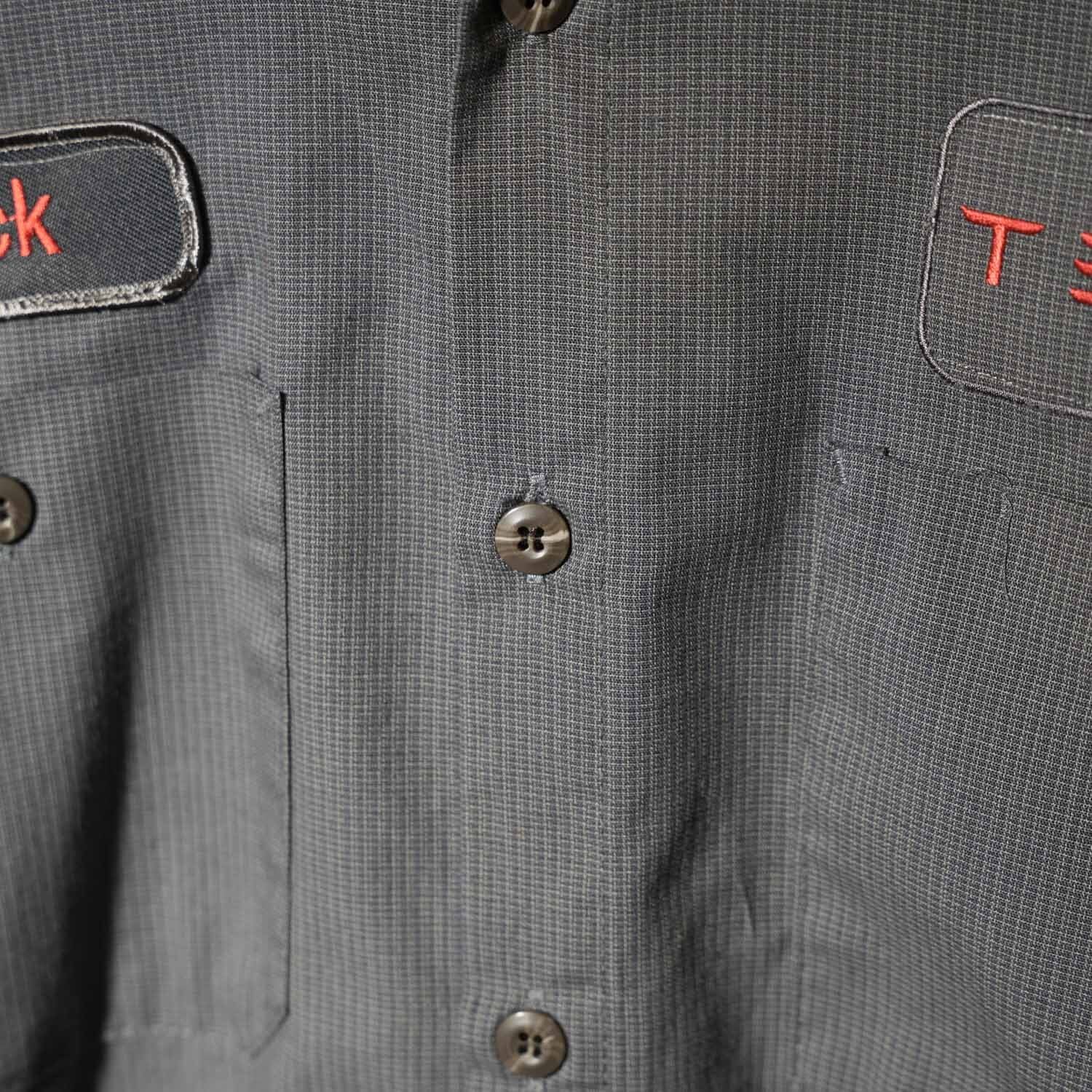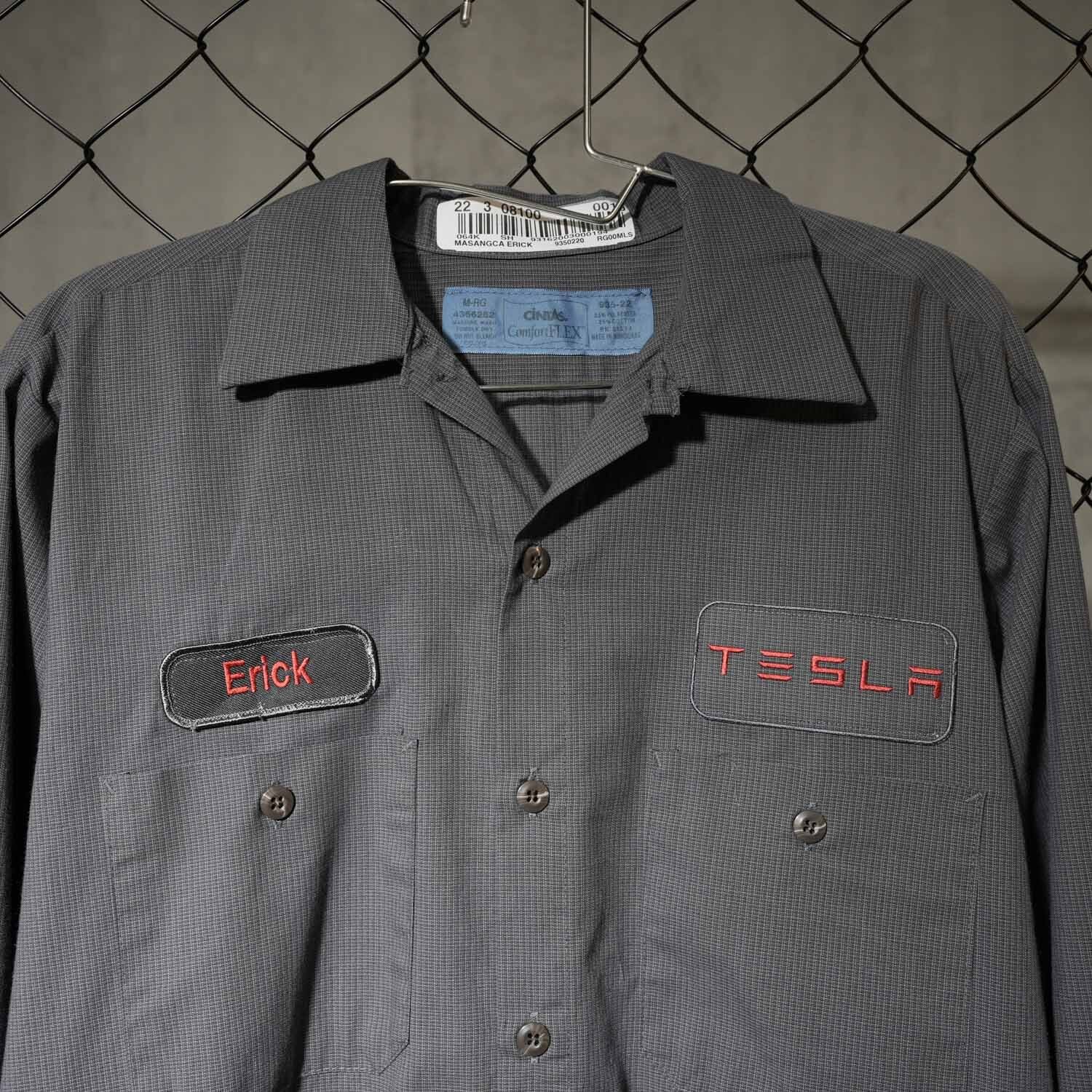Made from a smooth blend of 65% polyester and 35% cotton. It's durable enough for work and daily wear, lasting for years. The front retains the “TESLA” name patch and a personal name patch, giving it that authentic work shirt vibe.