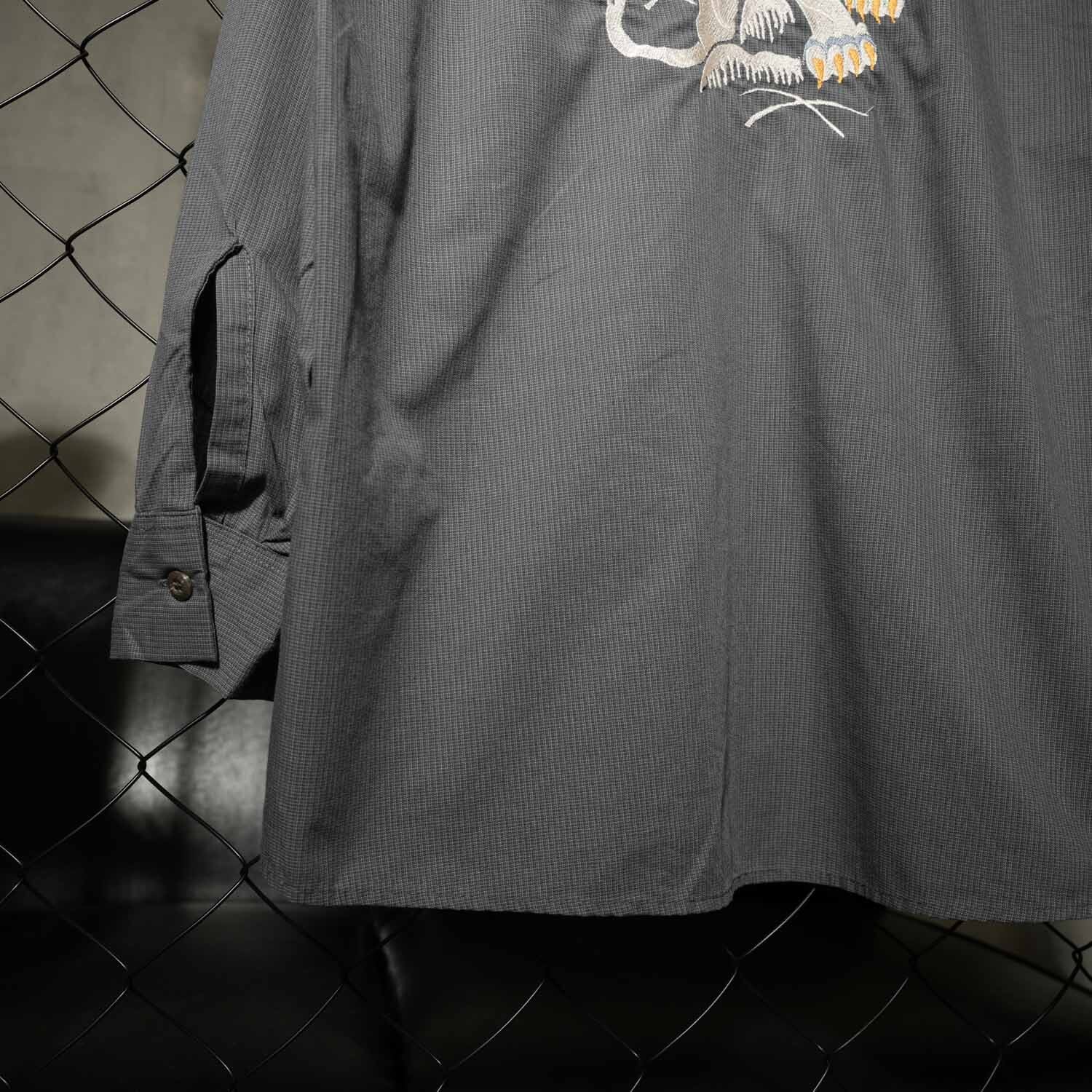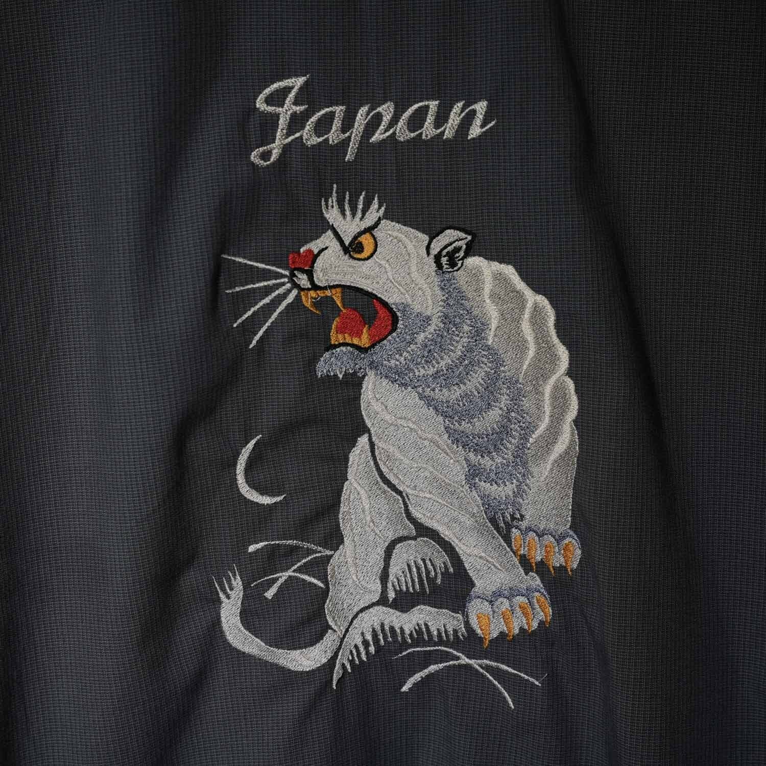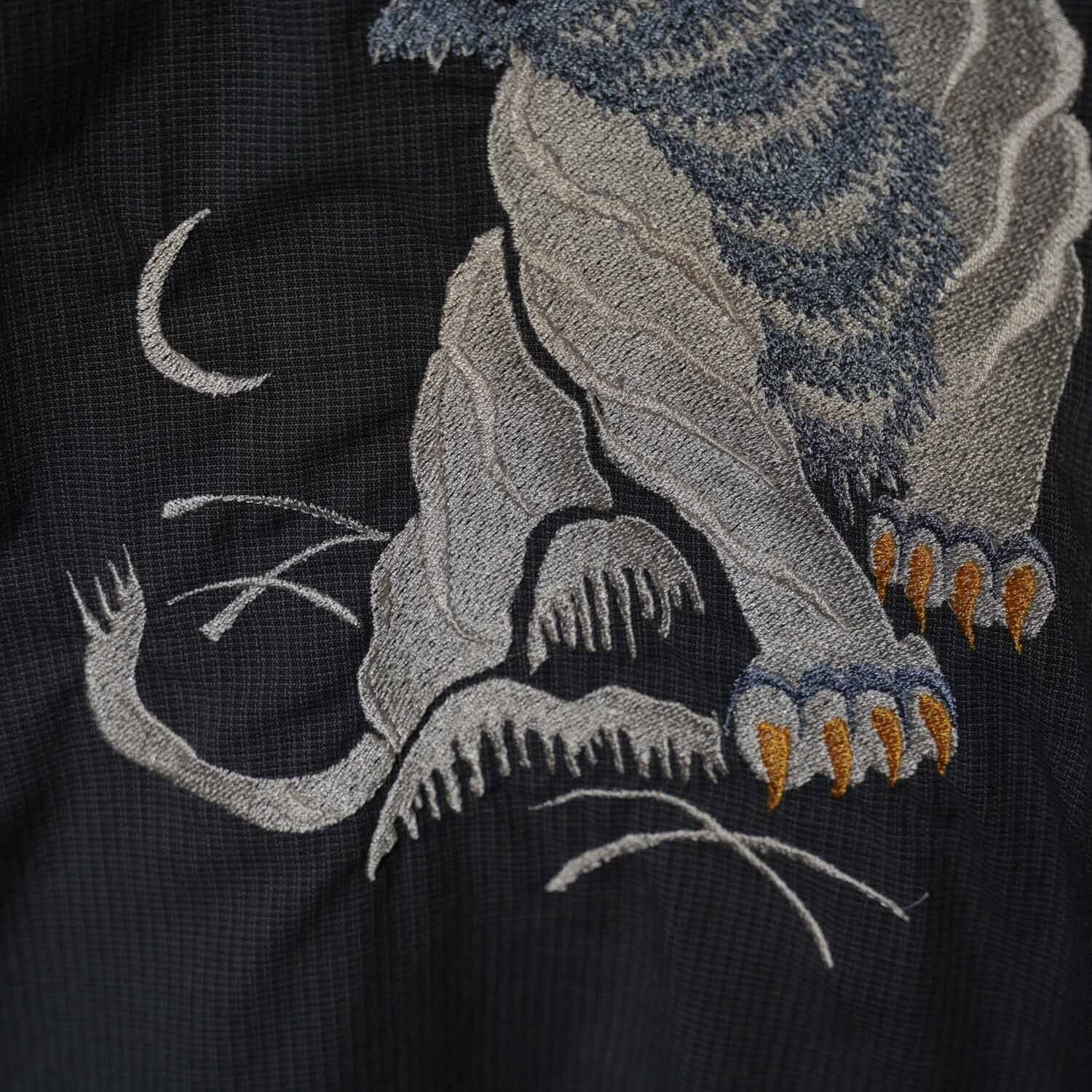 バックには存在感抜群の和虎刺繍が大胆にデザインされ、ヴィンテージ市場でも人気の高い意匠で、着るだけでインパクトのあるスタイリングが完成します。開襟スタイルなのもポイント高め。