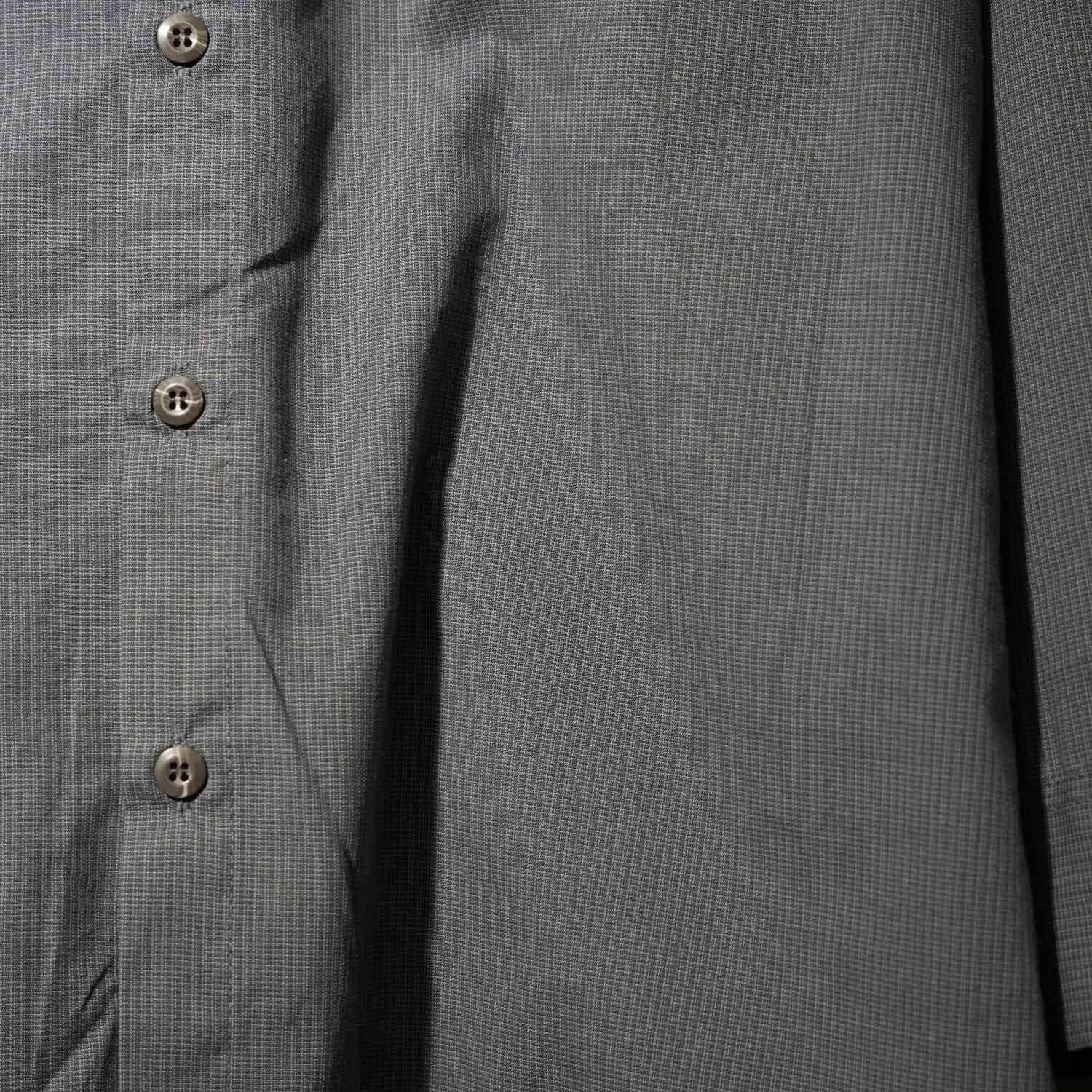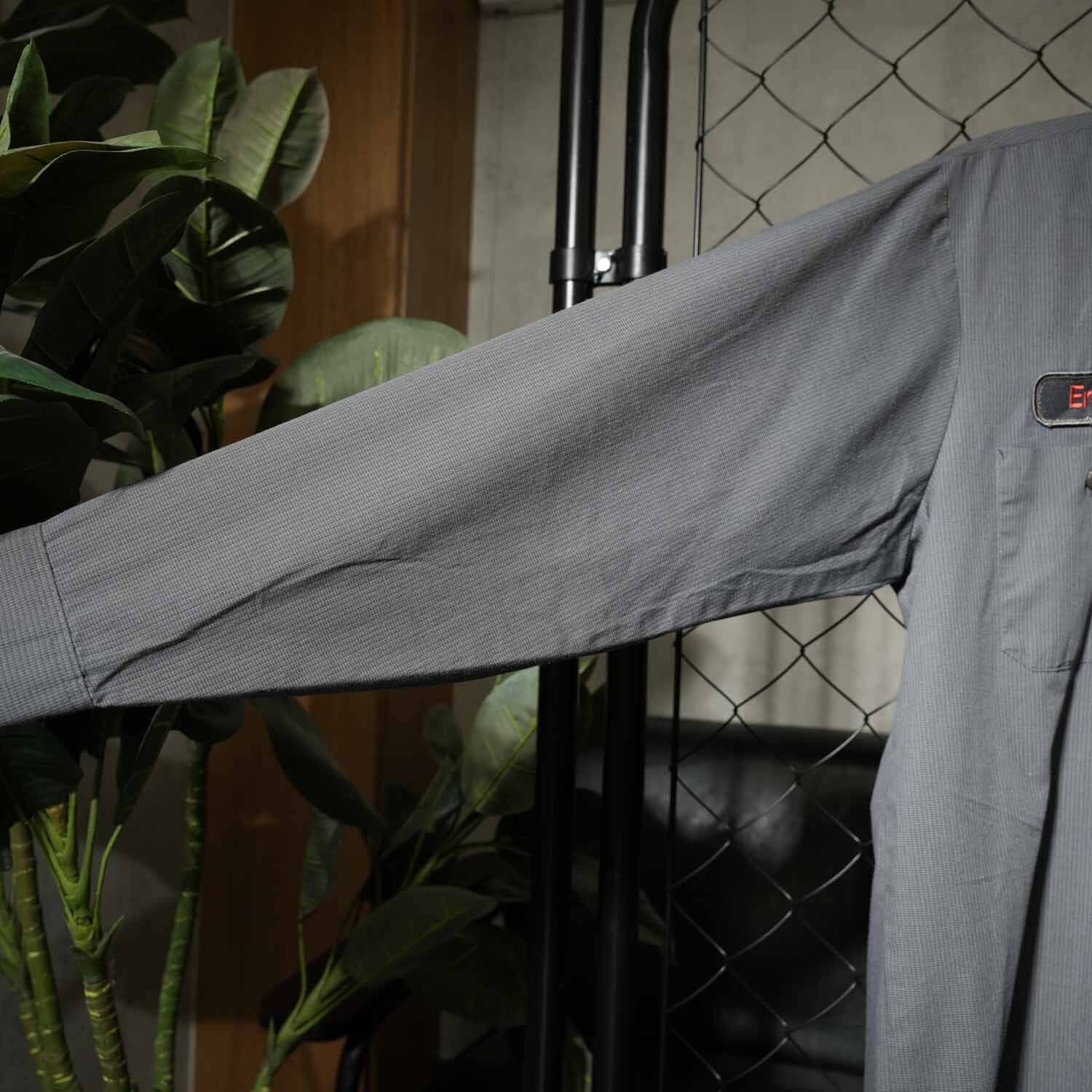 素材は ポリエステル65% × コットン35% のさらっとした混紡生地。ワークシーンからデイリーユースまで長く愛用できます。フロントには「TESLA」ネームと個人ネームのパッチが残り、ワークシャツならではのリアルな空気感を漂わせます。