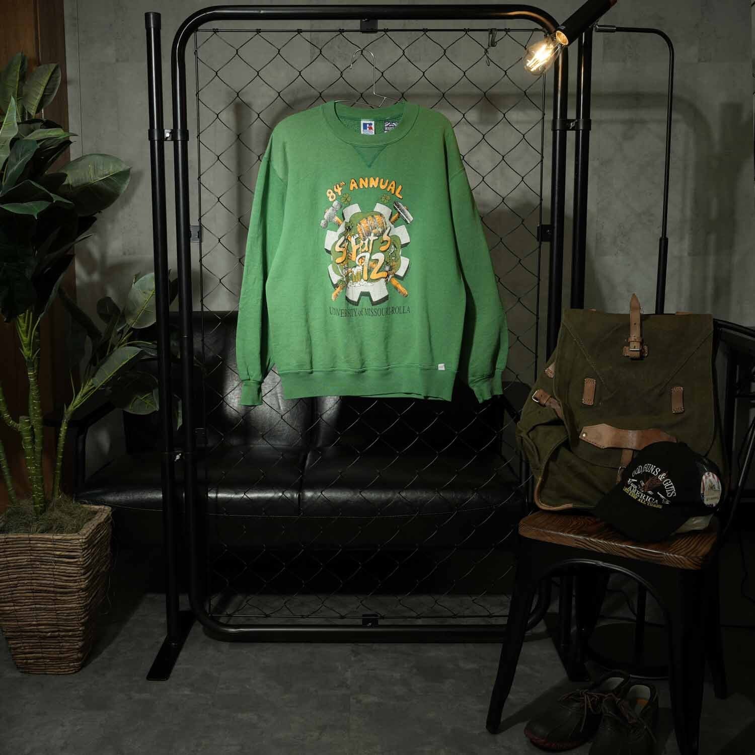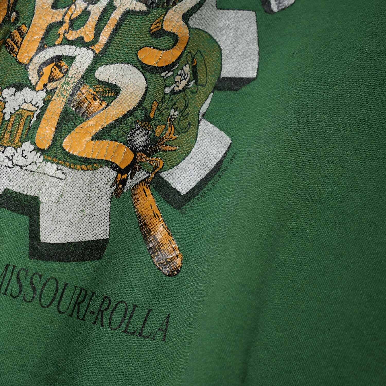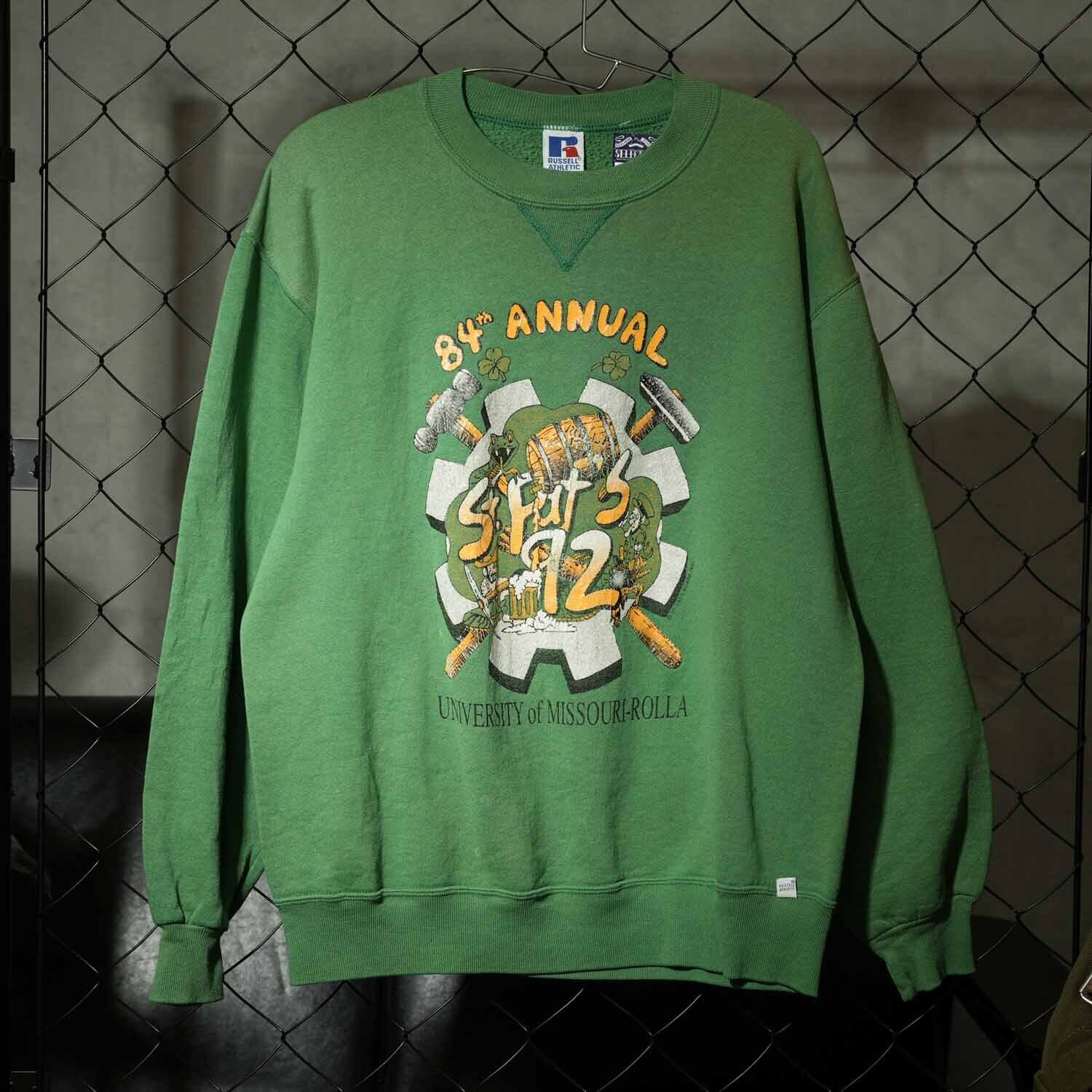 胸元には「84th ANNUAL St. Pat’s ’92(セントパトリックス祭)」を記念したカレッジプリントが施され、アメリカ・ミズーリ工科大学のイベントスウェットとして当時製作された一枚。現地の熱量をそのまま感じられるデザインは、アメカジファンやストリートスタイルにぴったりです。