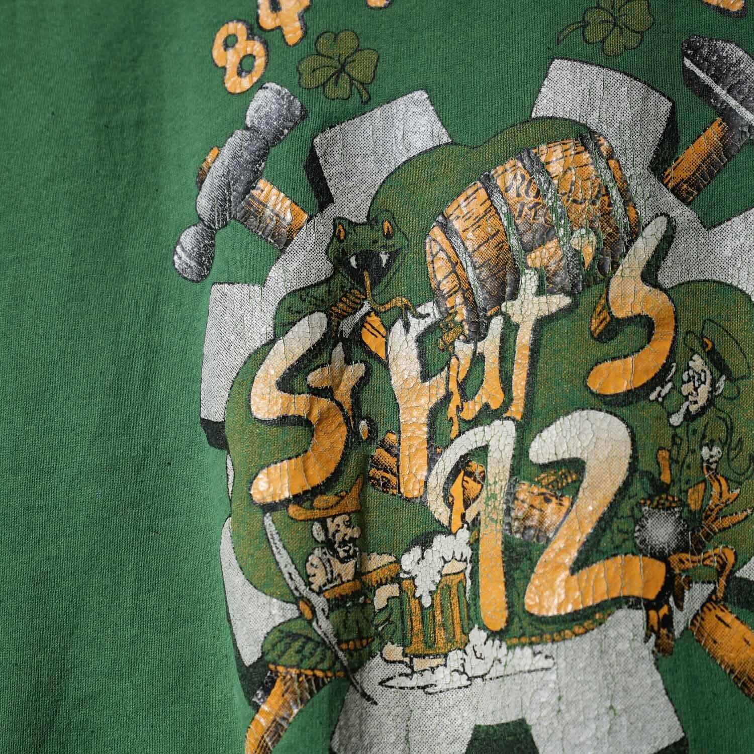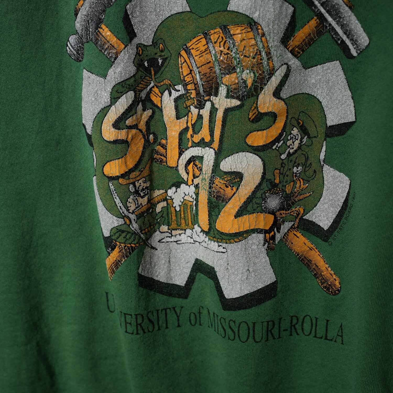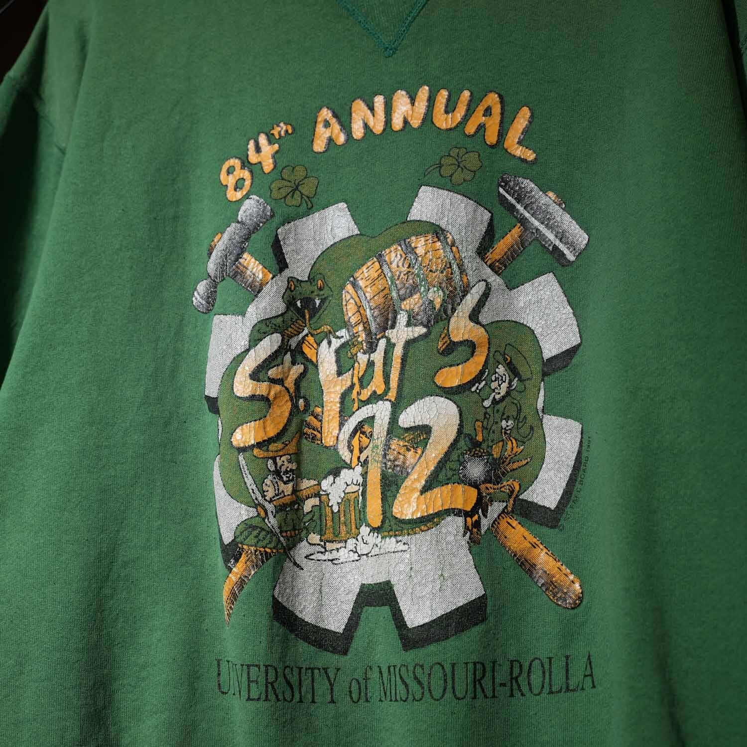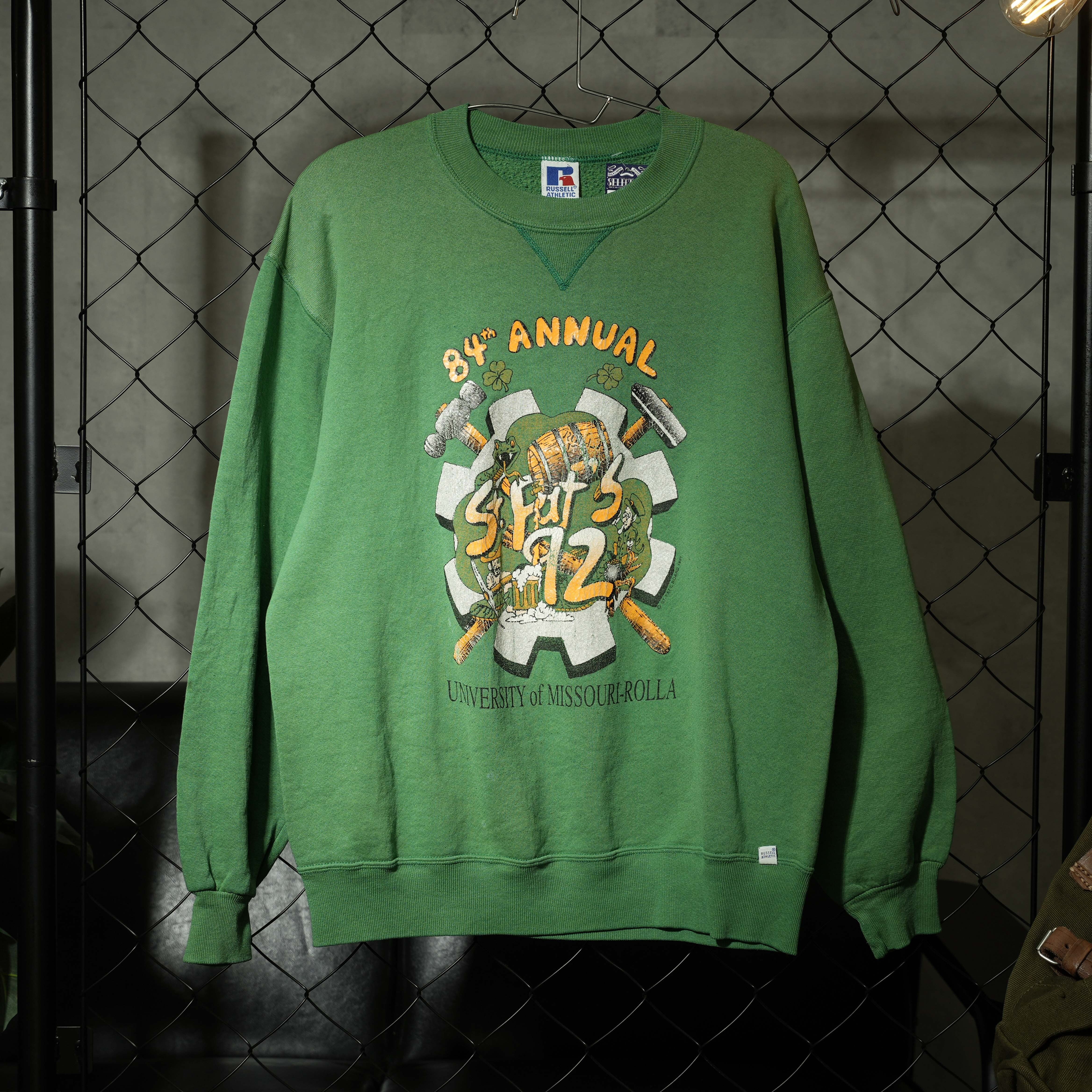 胸元には「84th ANNUAL St. Pat’s ’92(セントパトリックス祭)」を記念したカレッジプリントが施され、アメリカ・ミズーリ工科大学のイベントスウェットとして当時製作された一枚。現地の熱量をそのまま感じられるデザインは、アメカジファンやストリートスタイルにぴったりです。