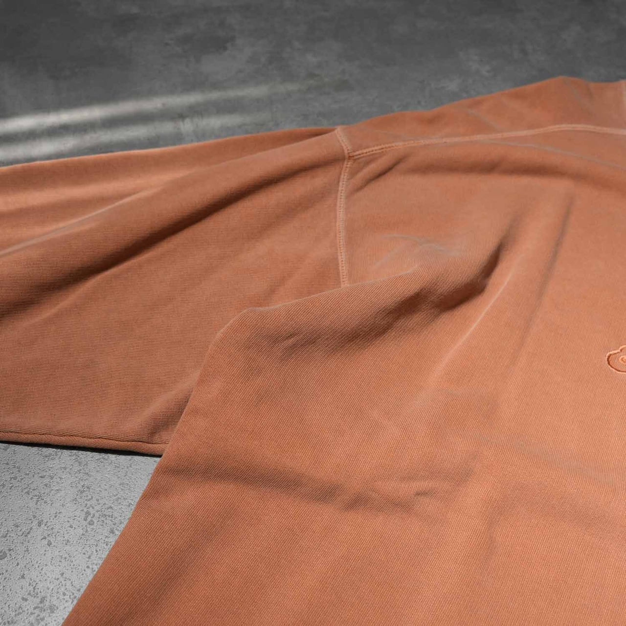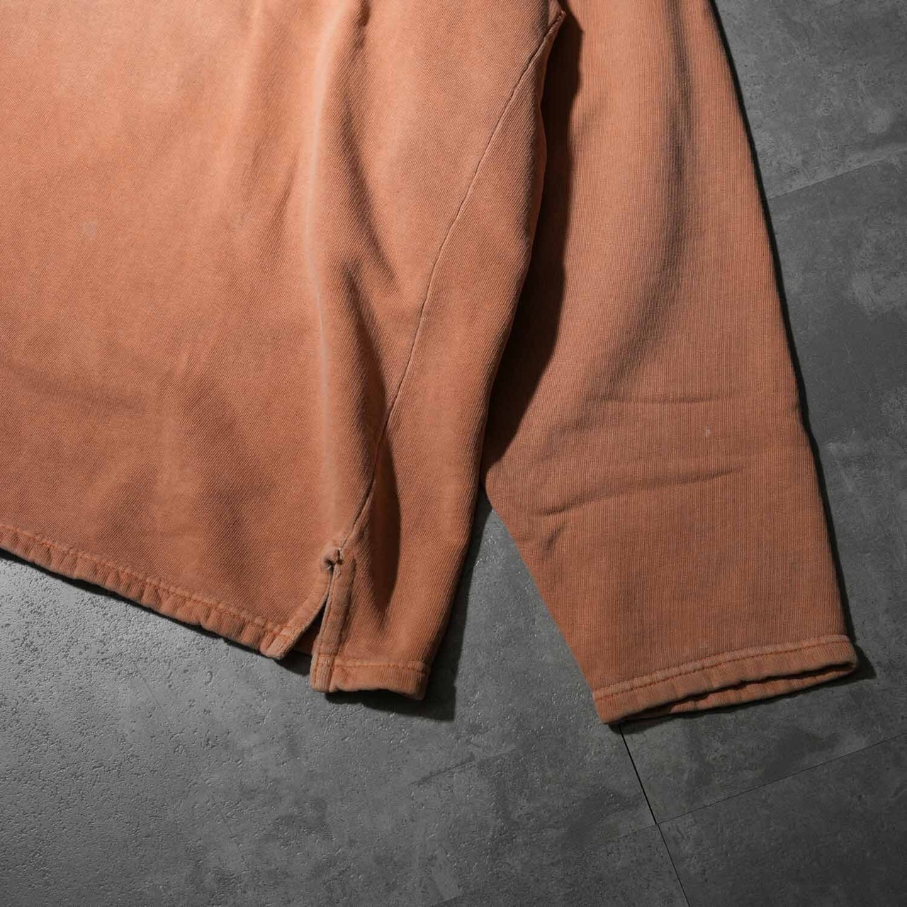 素材は 100%リングスパンコットン。通常のコットンよりも柔らかく、洗い込むほどに体に馴染む質感が魅力。さらに ガーメントウォッシュ & ピグメントダイ加工 が施され、ヴィンテージライクな色ムラとフェード感が表情豊かに仕上げられています。