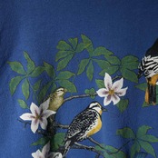 フロントには鮮やかな 花と小鳥のグラフィックプリント が大きく施され、ブルーボディとのコントラストが抜群。アメリカらしい大胆さと繊細な色彩表現を兼ね備えたデザインは、古着ならではの存在感を放ちます。