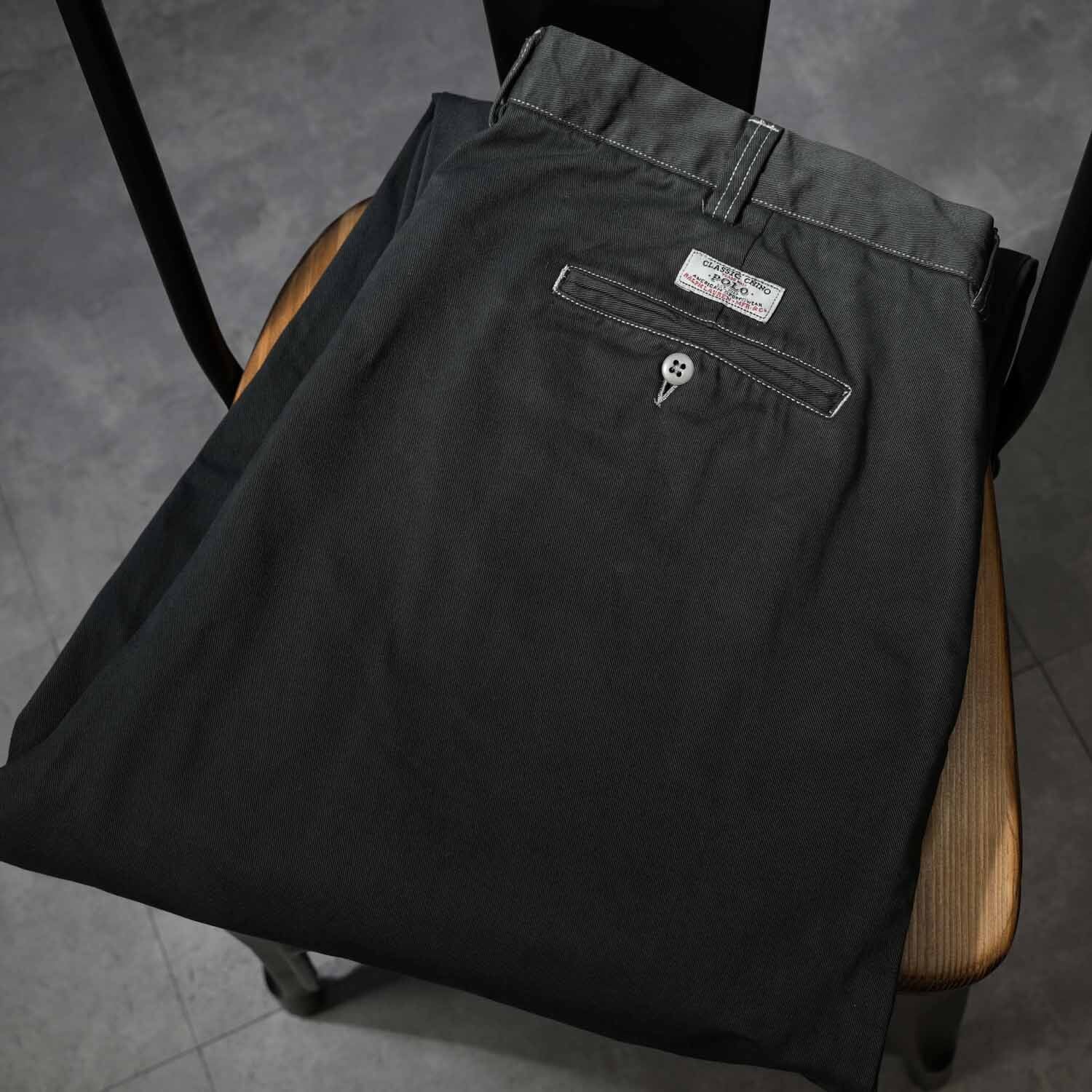 後染めならではの独特な黒の風合いは、ワードローブに新鮮さを与えます。クラシックなチノの存在感とラルフローレンらしい美しいシルエットは、アメカジ・アイビースタイルはもちろん、都会的なコーディネートにもハマる一本。シーズンを問わず着回せる万能なヴィンテージチノです。