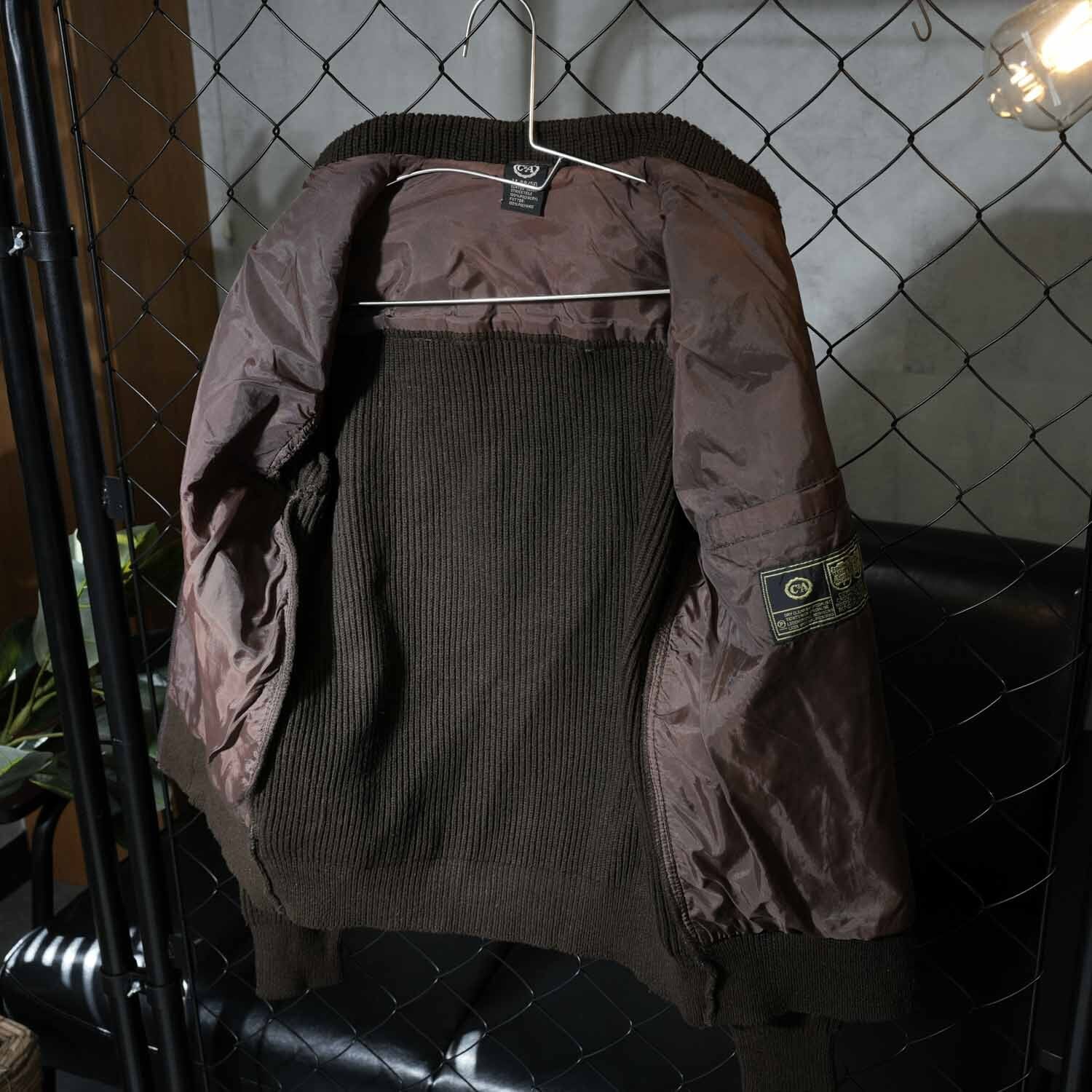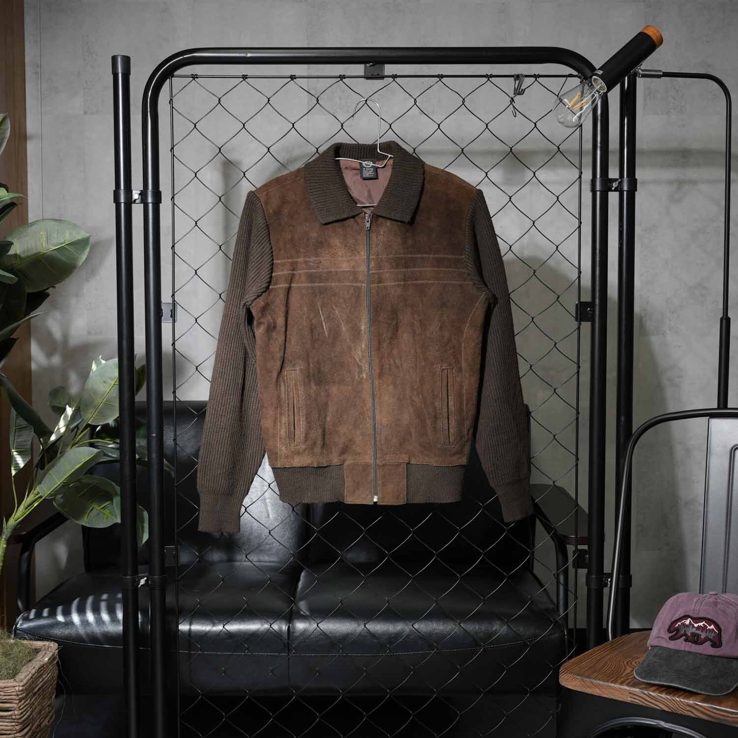 本作は1980〜90年代に生産されたジップアップジャケット。ボディには重厚感ある カウハイドスエード(牛革スエード) を使用し、袖・襟・裾は伸縮性のあるニット素材で切り替えたデザインが特徴です。武骨さと柔らかさのコントラストが際立ち、着用するだけで大人の余裕を漂わせる一着。