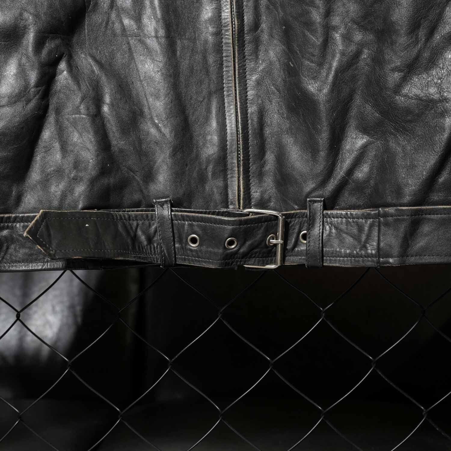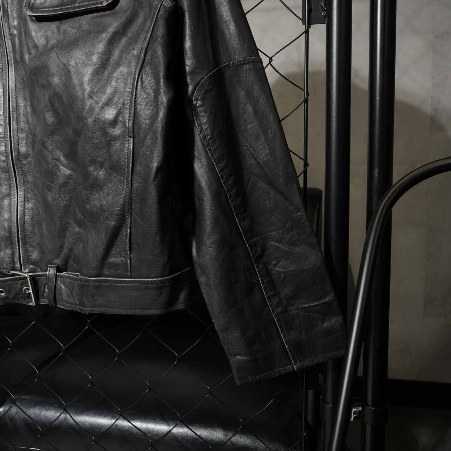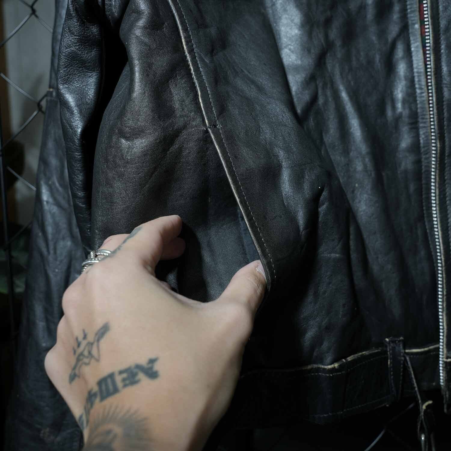 素材はしっとりとした100%本革。着込まれたことで、レザー表面に独特の「アタリ」が浮かび上がり、黒革の下から地がのぞくエイジングが楽しめる逸品です。新品には決して出せない風合いで、着るほどに自分だけの一着へと育ちます。