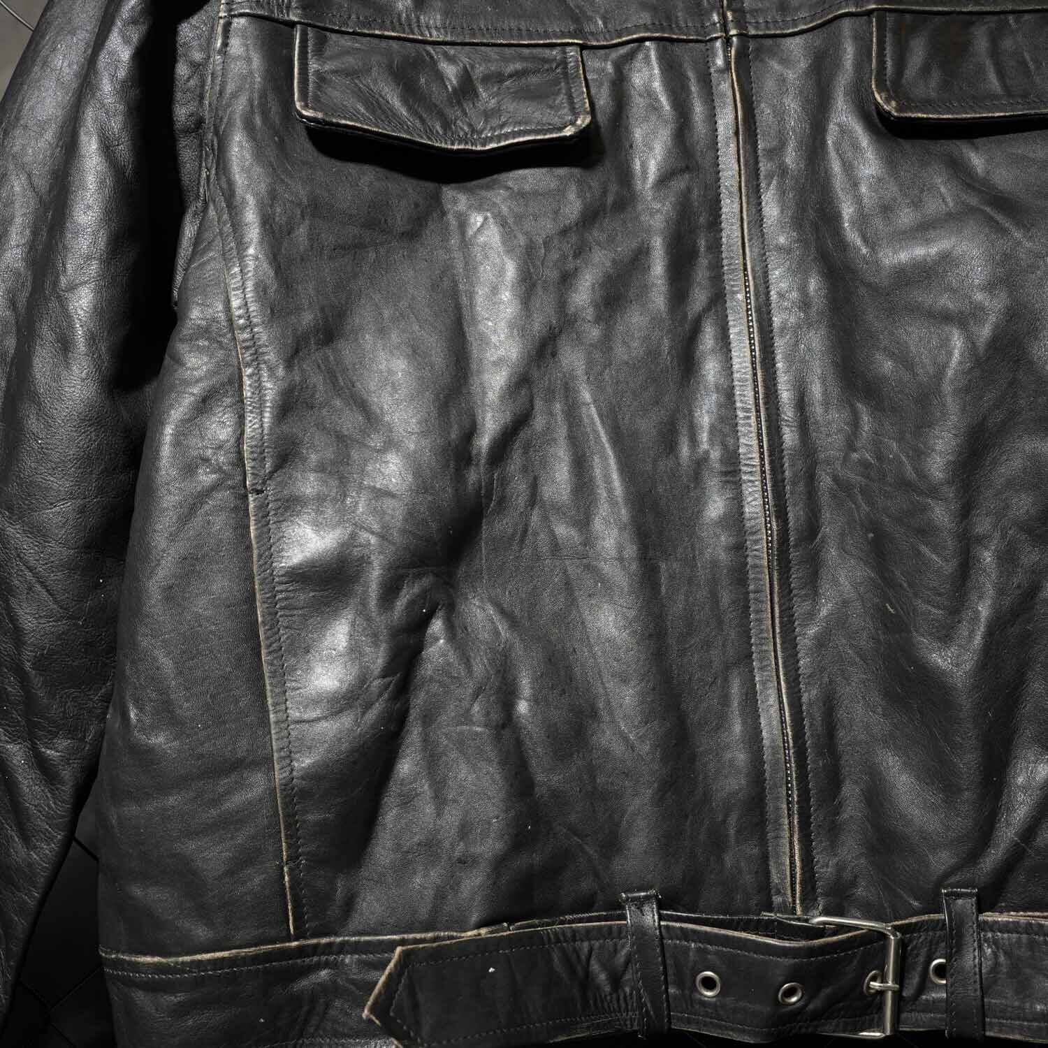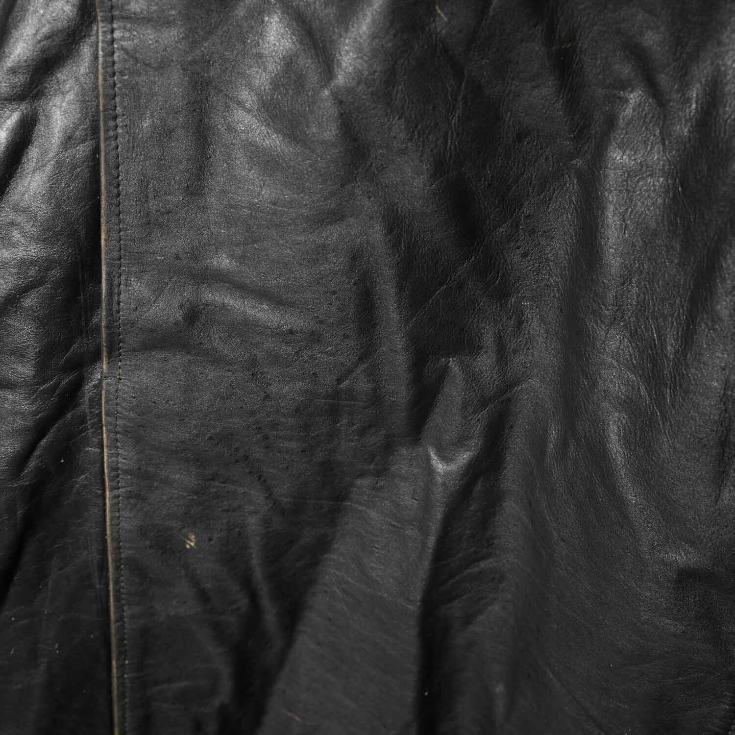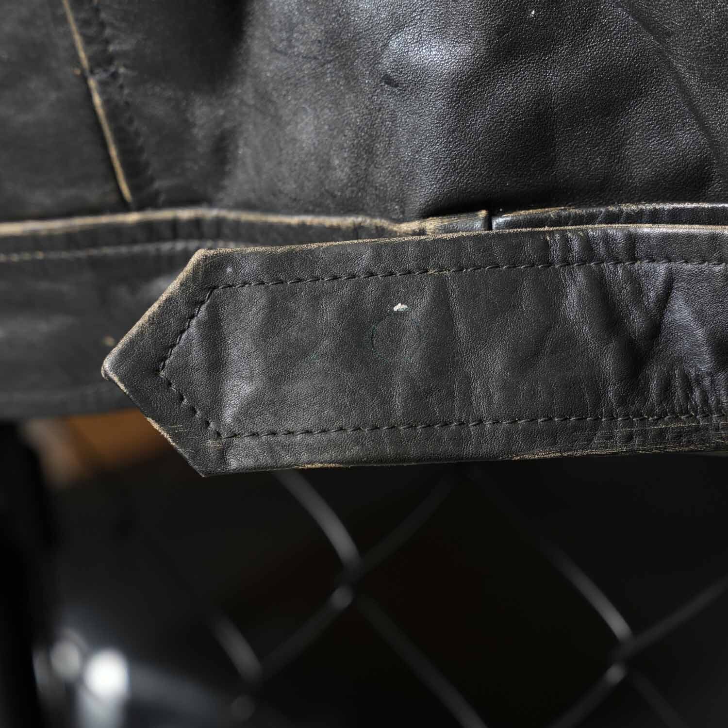 素材はしっとりとした100%本革。着込まれたことで、レザー表面に独特の「アタリ」が浮かび上がり、黒革の下から地がのぞくエイジングが楽しめる逸品です。新品には決して出せない風合いで、着るほどに自分だけの一着へと育ちます。