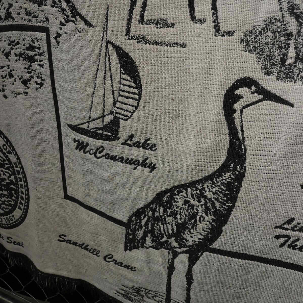 アメリカ・ネブラスカ州をテーマにしたヴィンテージラグ「NEBRASKA ...The Good Life」。州都リンカーンや有名なチムニーロック、砂丘地帯などの名所が織り込まれたクラシカルなデザインです。
