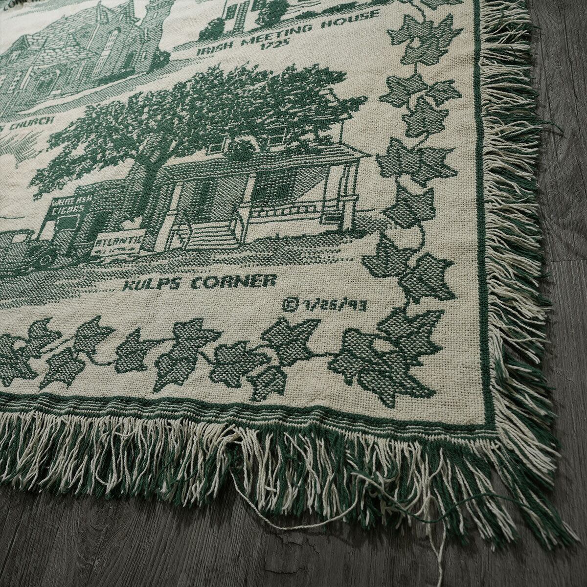 1842年創設の Deep Run School や、1819年建設の Stover Myer Mill、Plumsteadville Hotel など、実在するランドマークが精緻にデザインされています。タペストリーとして壁に飾れば郷愁あふれるアメリカの田園風景を感じられ、ソファーカバーやベッドスロー、ラグとしても活躍。地域コミュニティの歴史をアートとして楽しめる、アメリカン雑貨・インテリア好きにおすすめの逸品です。
