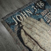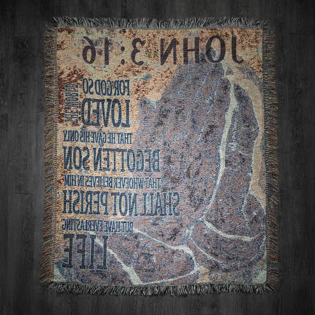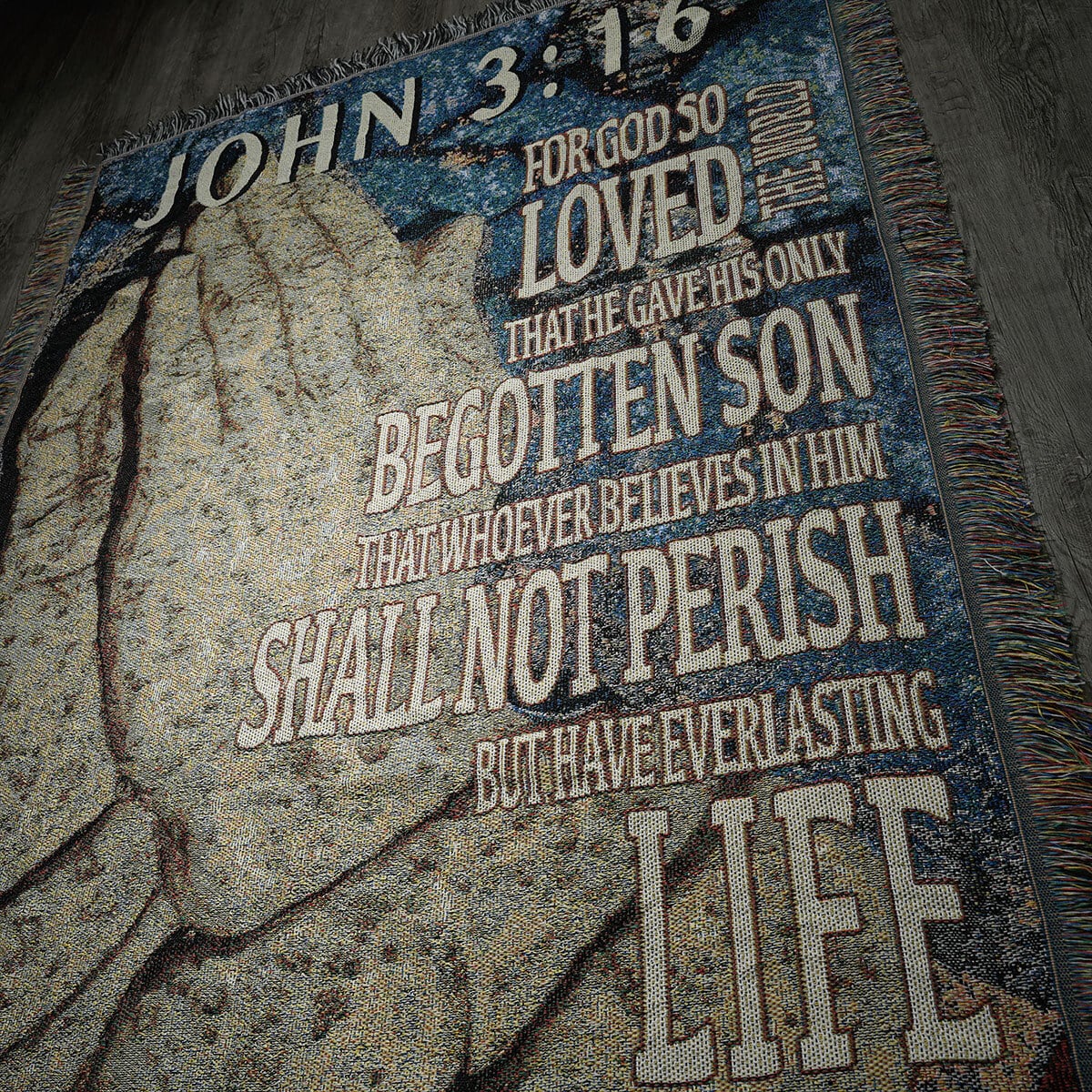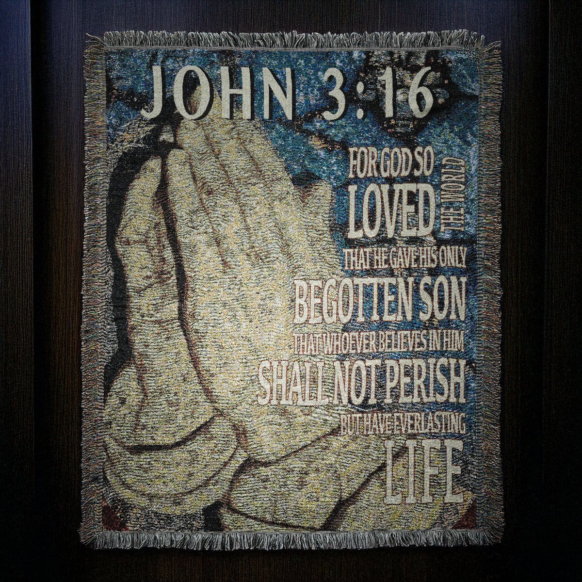 祈りを捧げる両手と、聖書の有名な一節「John 3:16」が織り込まれたヴィンテージラグ。