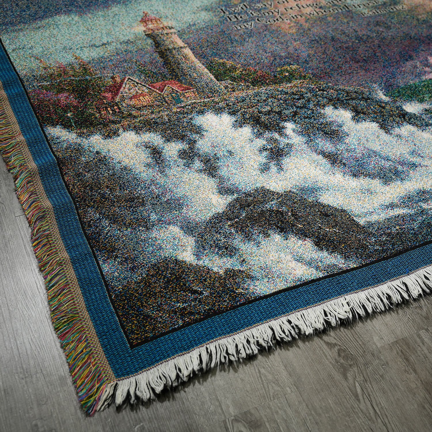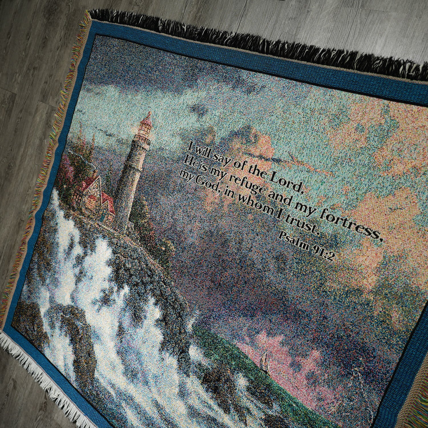 ヴィンテージ ラグ トーマス・キンケード Thomas Kinkade 灯台 Psalm 91:2 タペストリー ソファーカバー 宗教アート インテリア