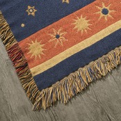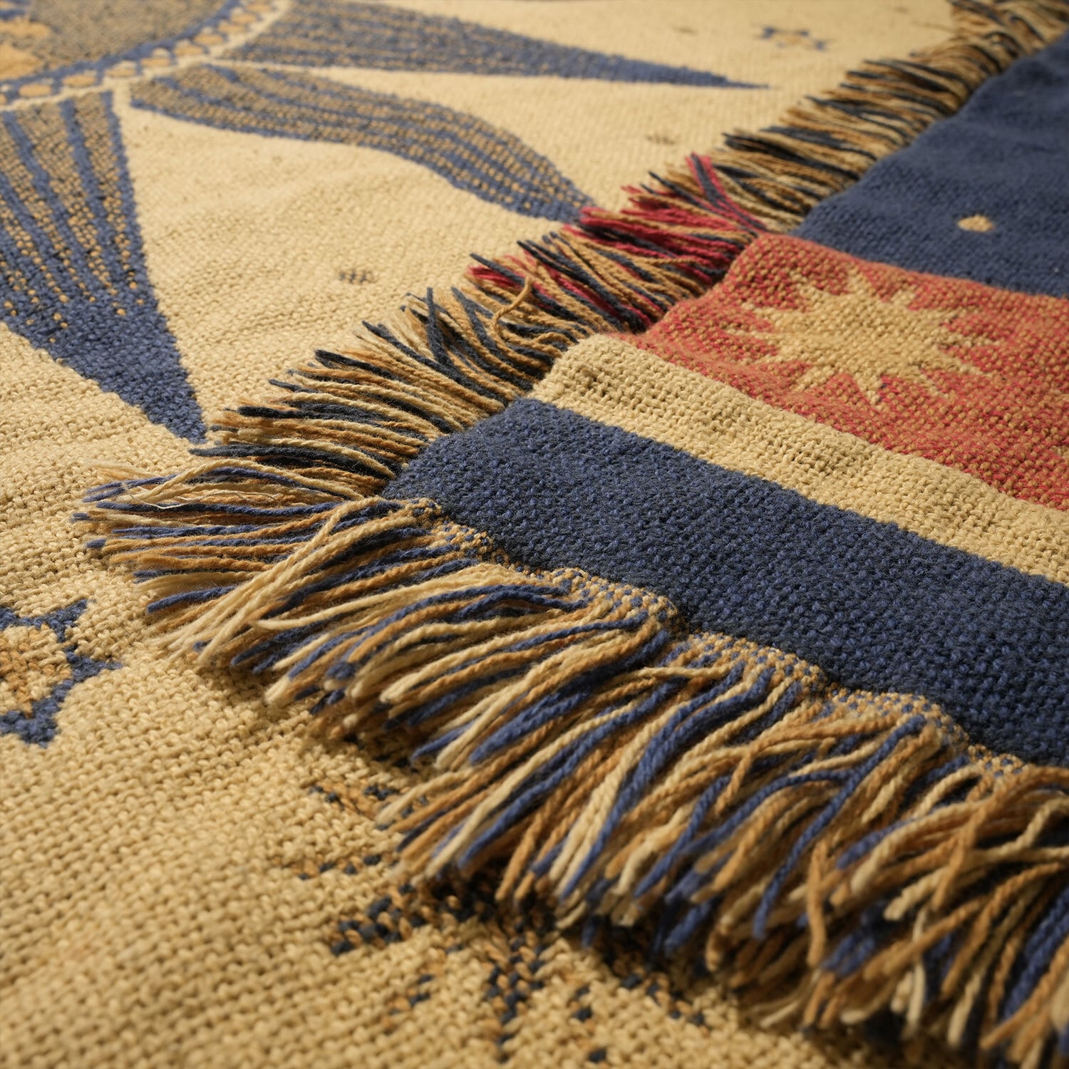 深いネイビーブルーを背景に、ゴールドトーンの太陽が堂々と輝く構図は、インテリアの主役になる美しさ。ジャカード織りの立体感と程よい厚みがあり、ソファカバーやブランケット、壁掛けとしても活躍。