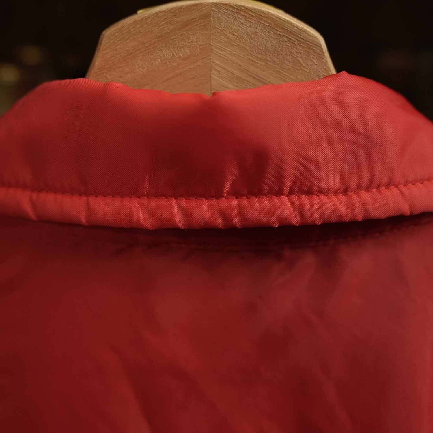 鮮やかなレッド×イエローのコントラストはポップでありながら、経年によって程よく落ち着いたトーンへと変化。ストリートにもヴィンテージスタイルにも馴染む絶妙な存在感を放ちます。袖口のゴムリブやドローコード付きの裾など、シンプルながら完成度の高いデザインバランス。パーカーやスウェットの上からラフに羽織るだけで、アメリカらしい抜け感を演出してくれます。