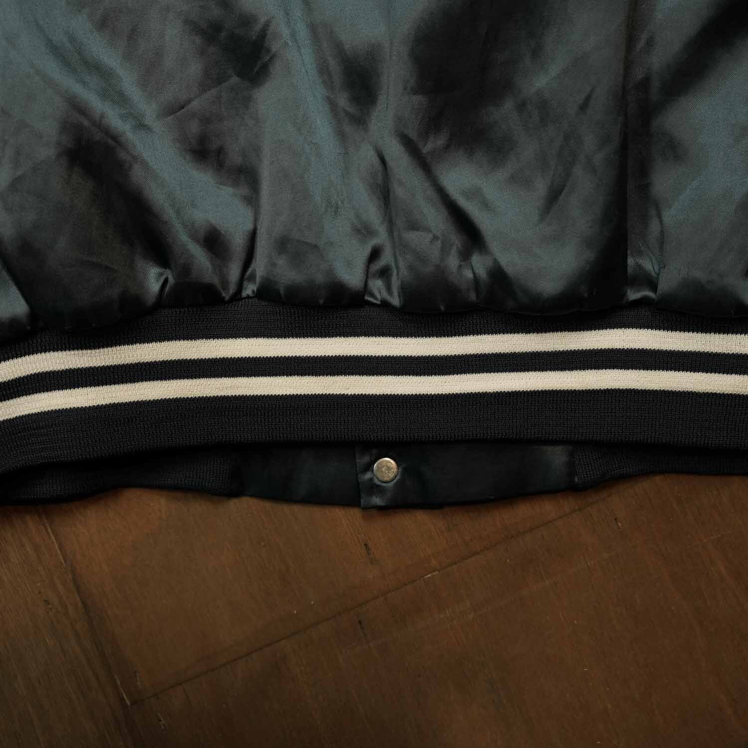 胸にワッペンではなく織りテープで施された“U.S. NAVY”の縦ラインデザインが特徴的で、スポーツスタジャンとは一線を画すミリタリーライクな存在感。艶やかな素材感と無駄のないシルエットが融合し、アメカジはもちろんモードやストリートにも落とし込みやすい仕上がりです。