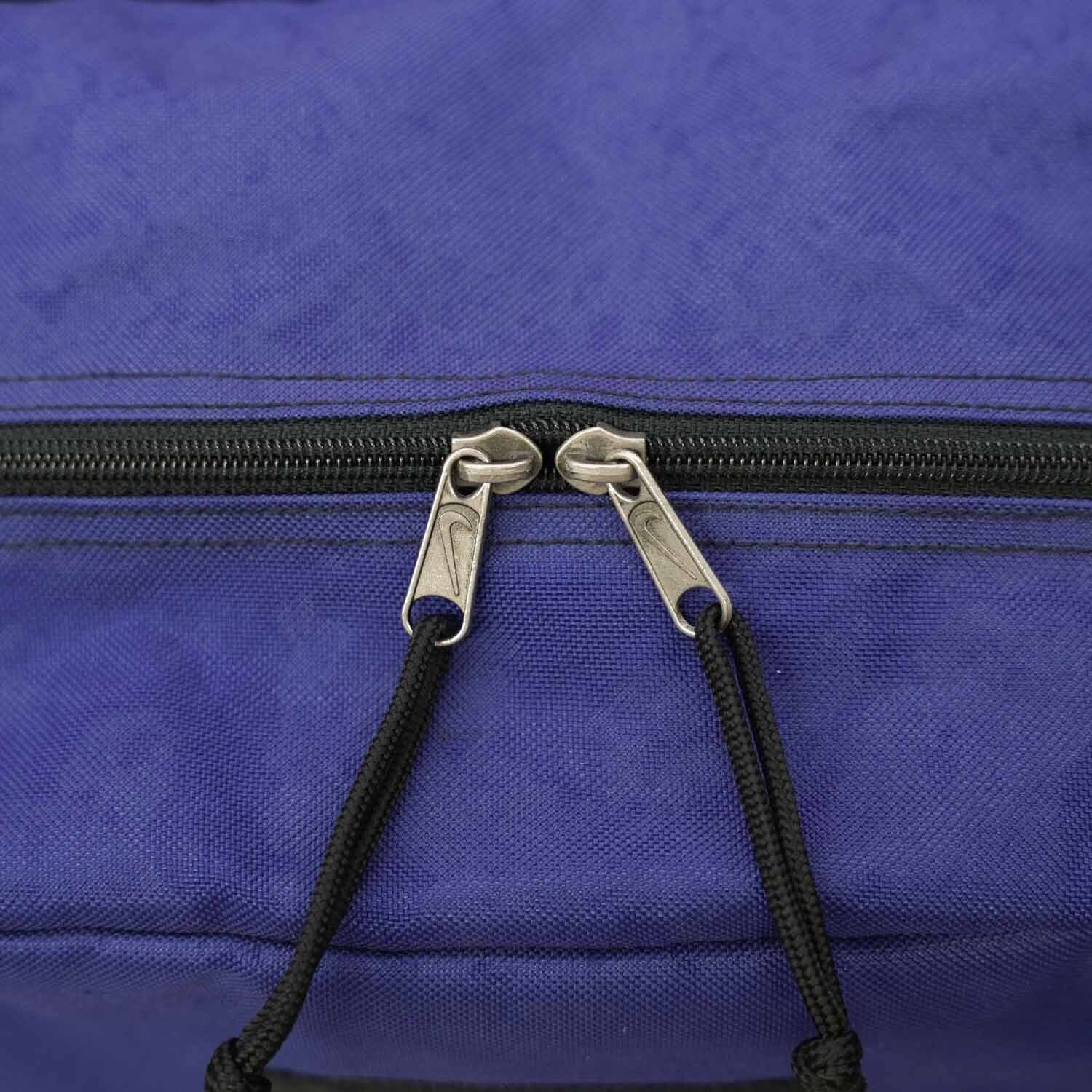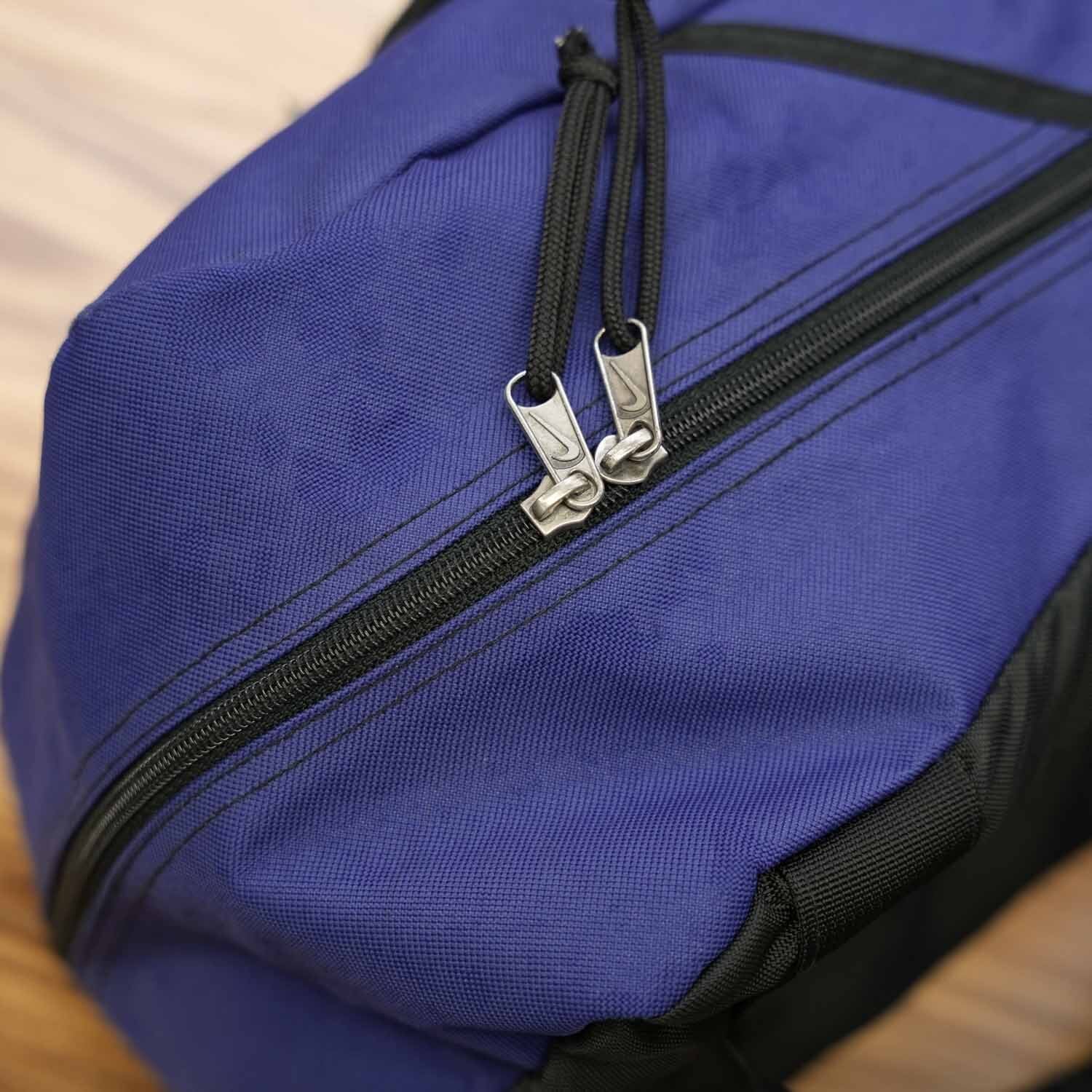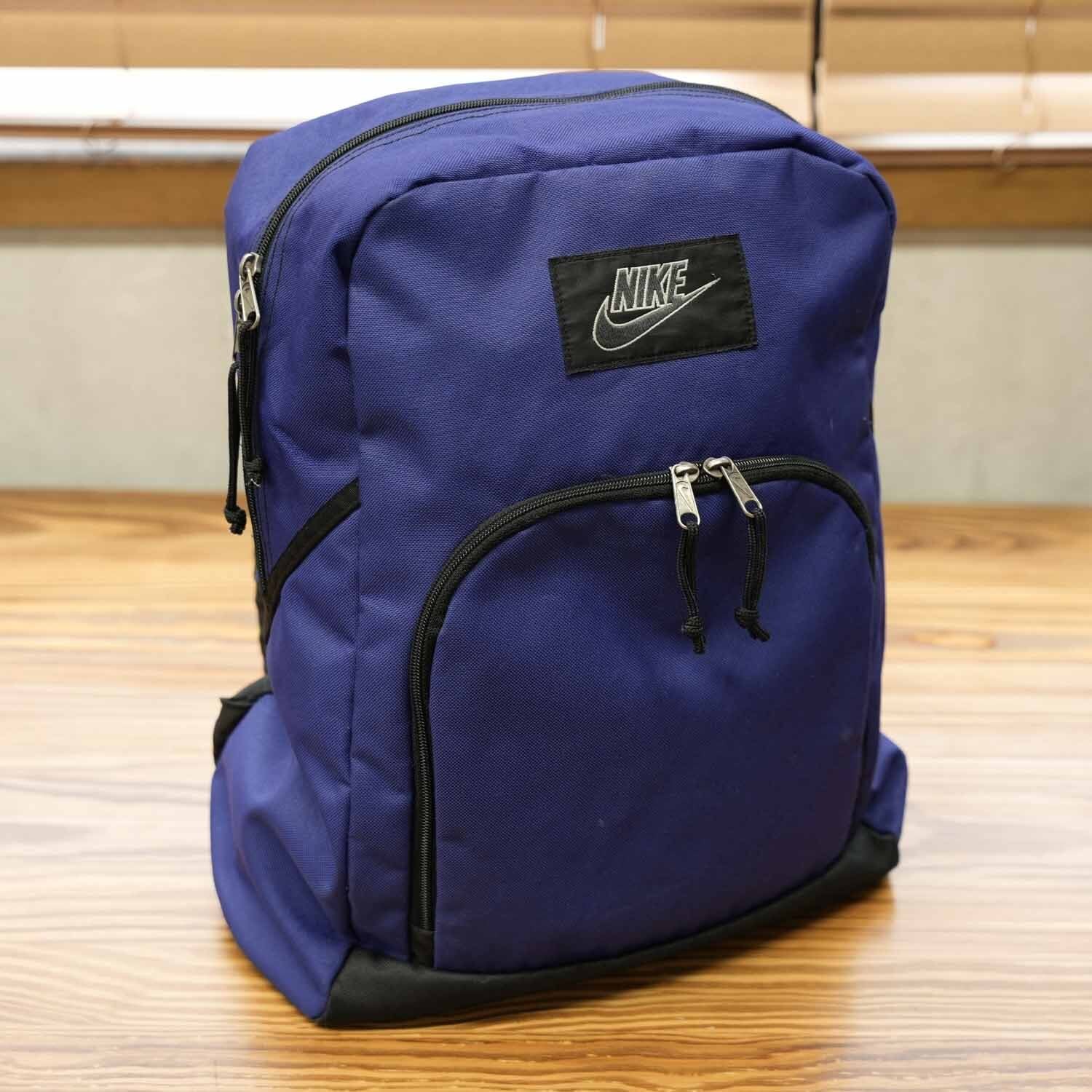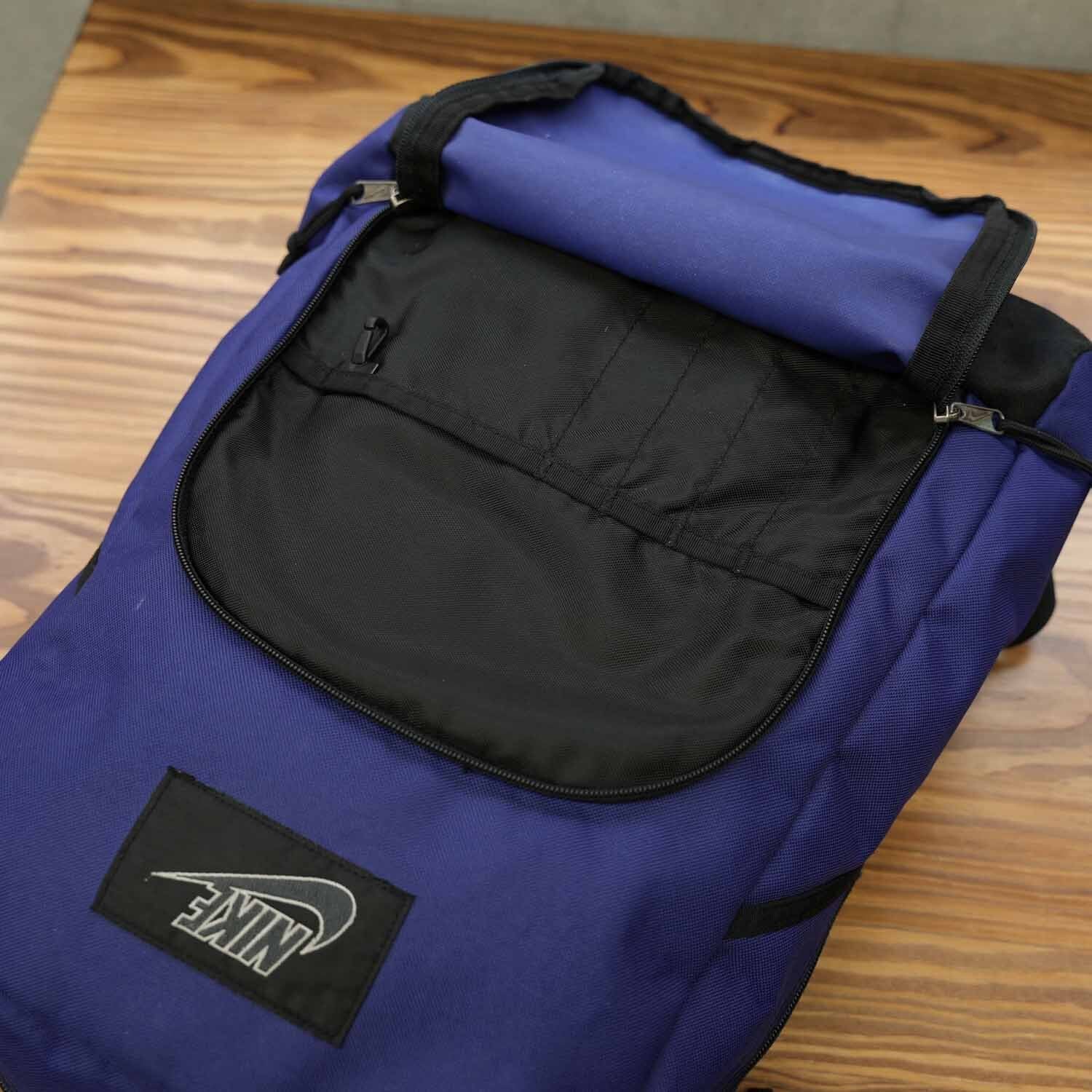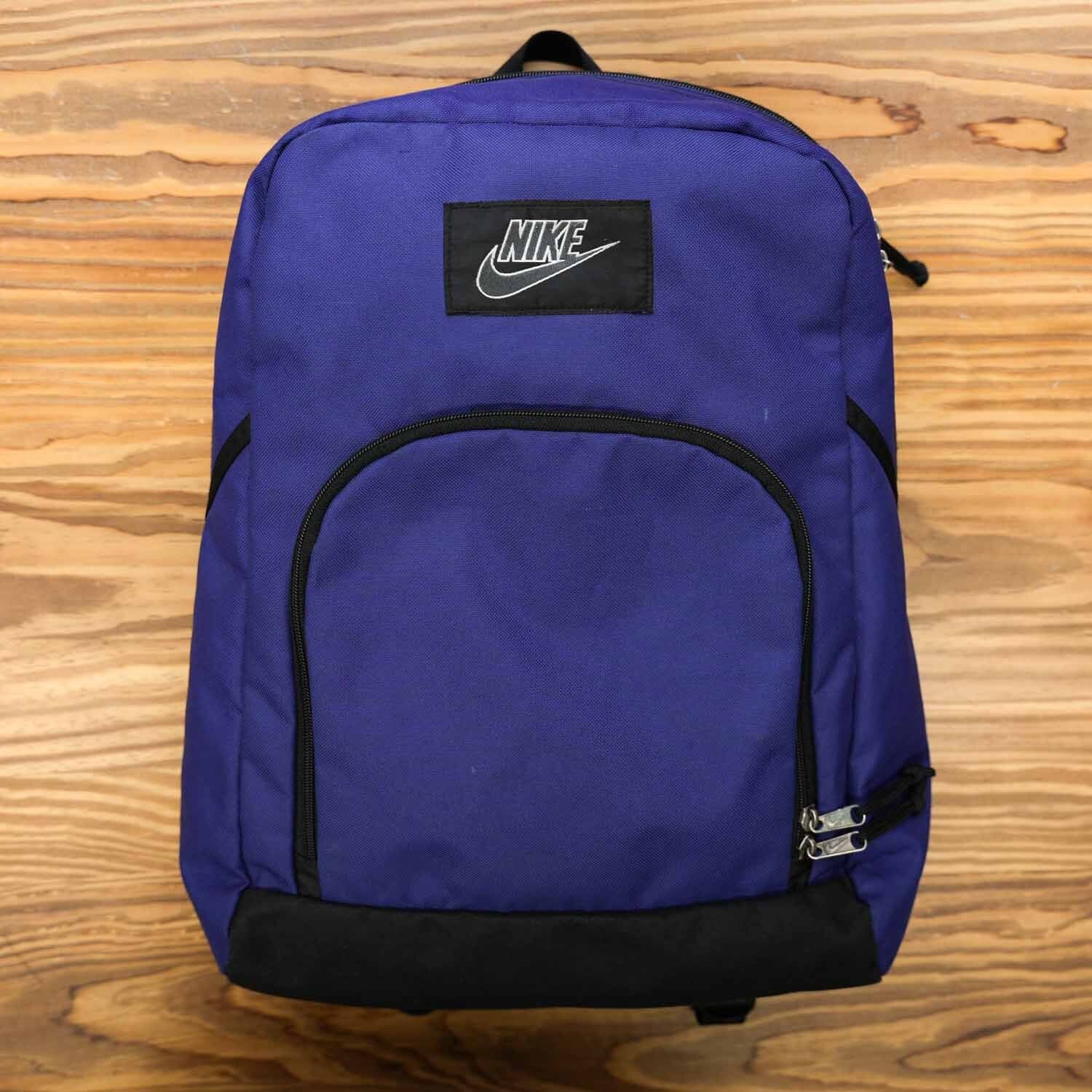 NIKE ナイキ ナイロンバックパック 90s 韓国製 スウッシュ 刻印パーツ × 刺繍ロゴ ブルーパープル×ブラック スクバ オールドナイキ サブバッグ 古着【furugi-1063】