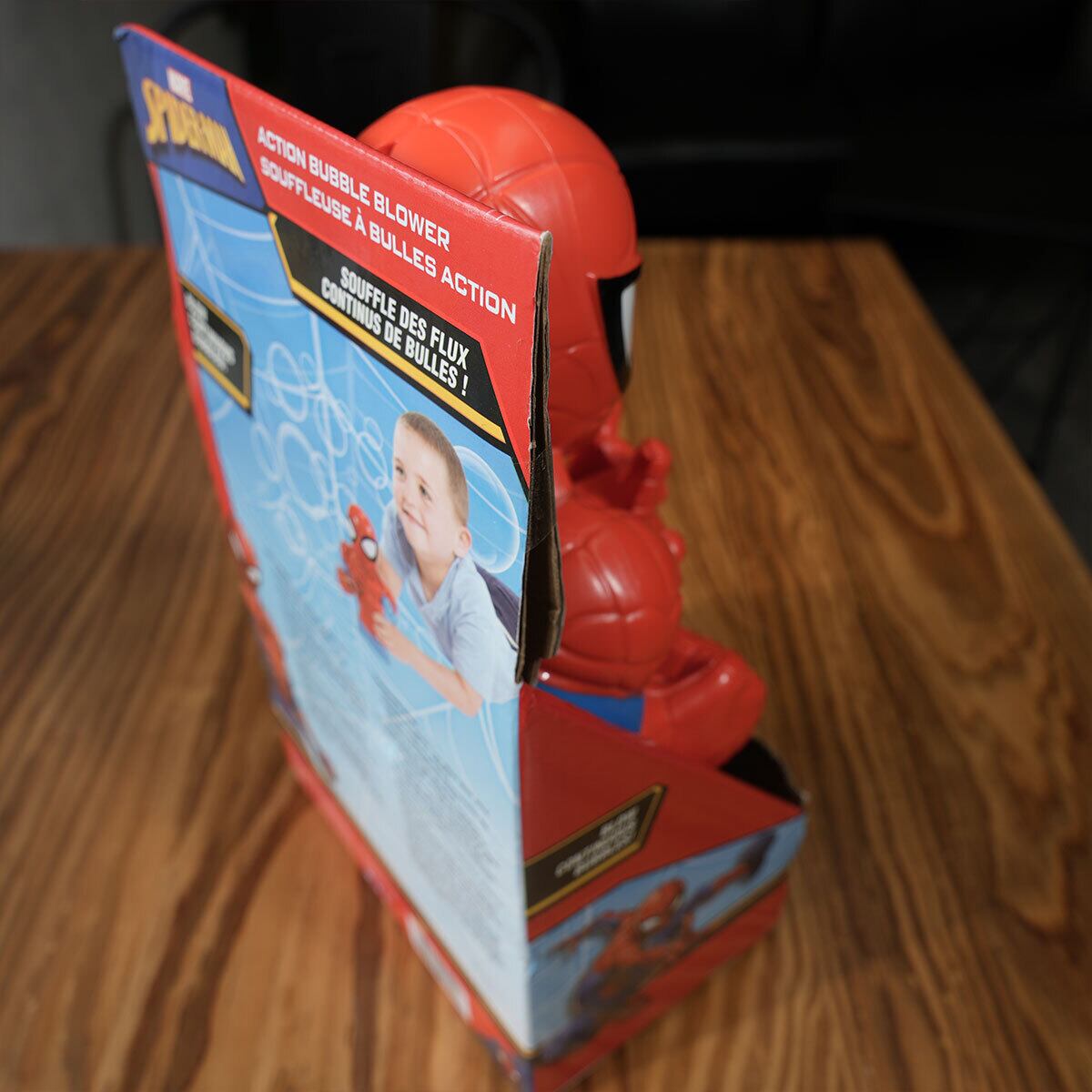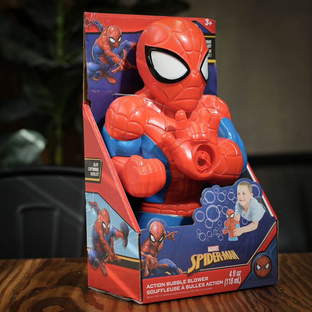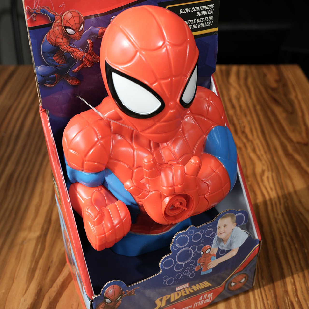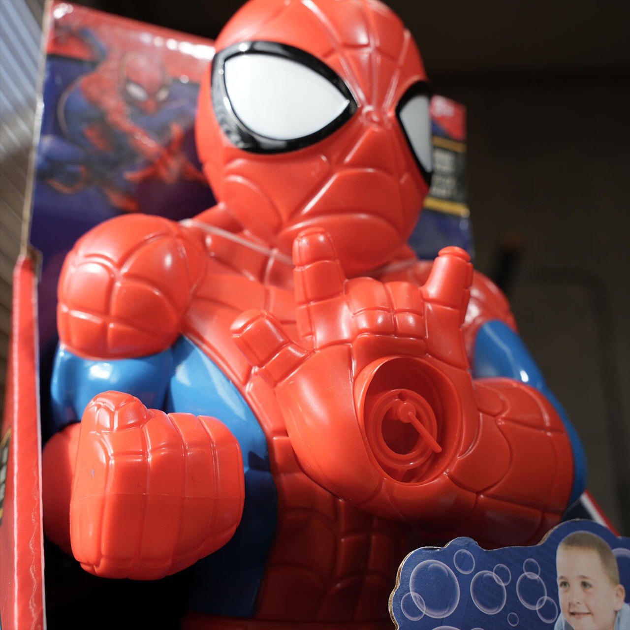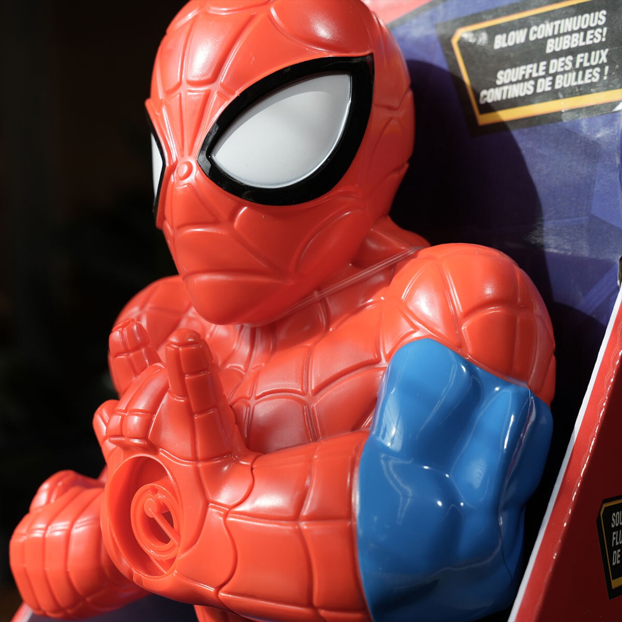 MARVELの人気ヒーロー「スパイダーマン」が、手のひらから“泡”を発射する電動シャボン玉トイ。背中のボタンを押すだけで、糸ではなく“シャボン”が出てくる、ちょっとユーモラスで写真映えも抜群なアクションギミックです。