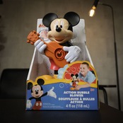 ディズニー ジュニアのミッキーが、ギター(ウクレレ?)を抱えて“音を奏でるように”シャボン玉を噴射!背面ボタンを押すだけで、ポロロン♪とコードを鳴らすようなビジュアルで、泡がふわりと飛び出していく「Action Bubble Blower」です。