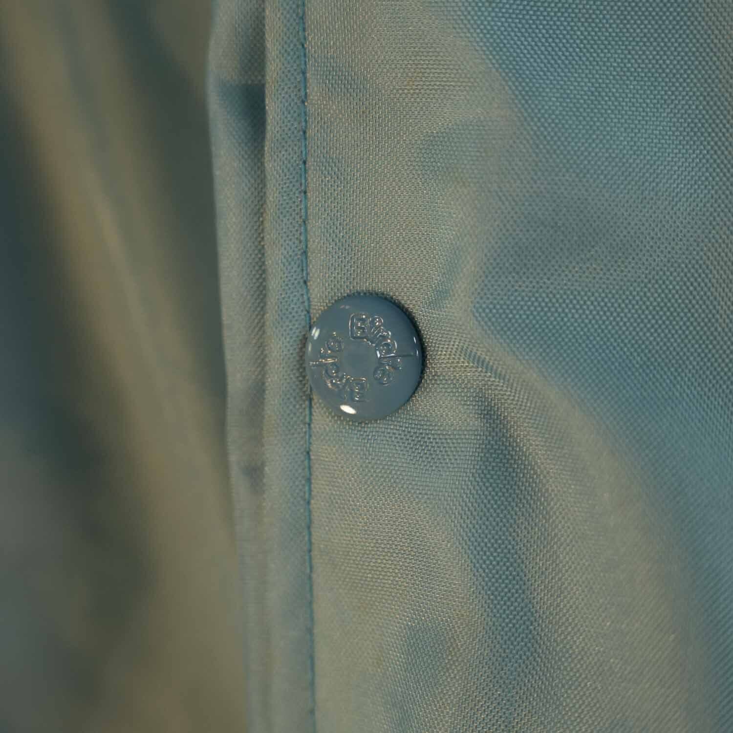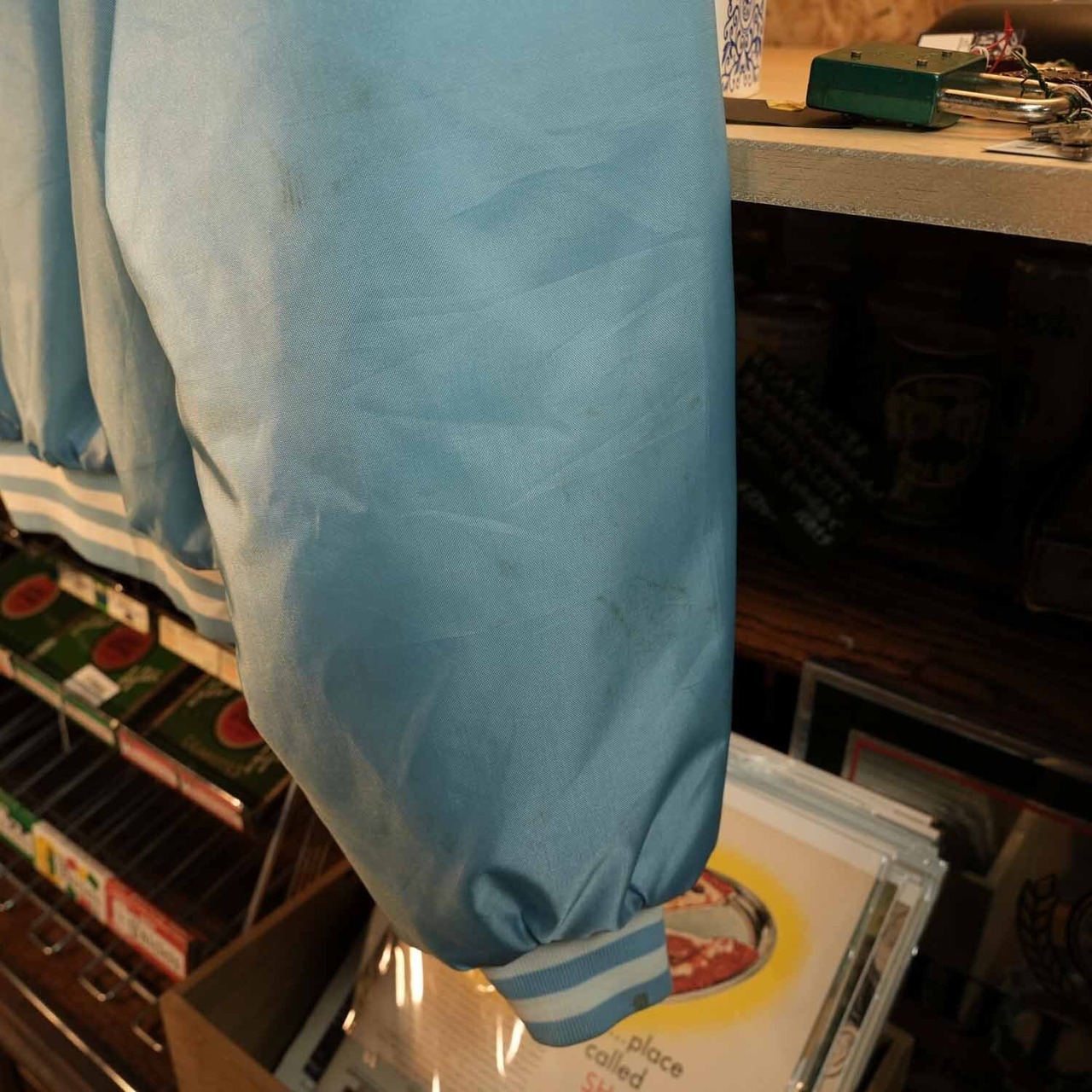 生地はツヤのあるナイロン。中はキルティング仕様で程よいボリュームのシルエットをキープ。袖口と裾の2本ラインリブが全体を引き締め、フロントのスナップボタンやカンガルーポケットなど、当時のスポーツウェアらしいディテールが丁寧に再現されています。