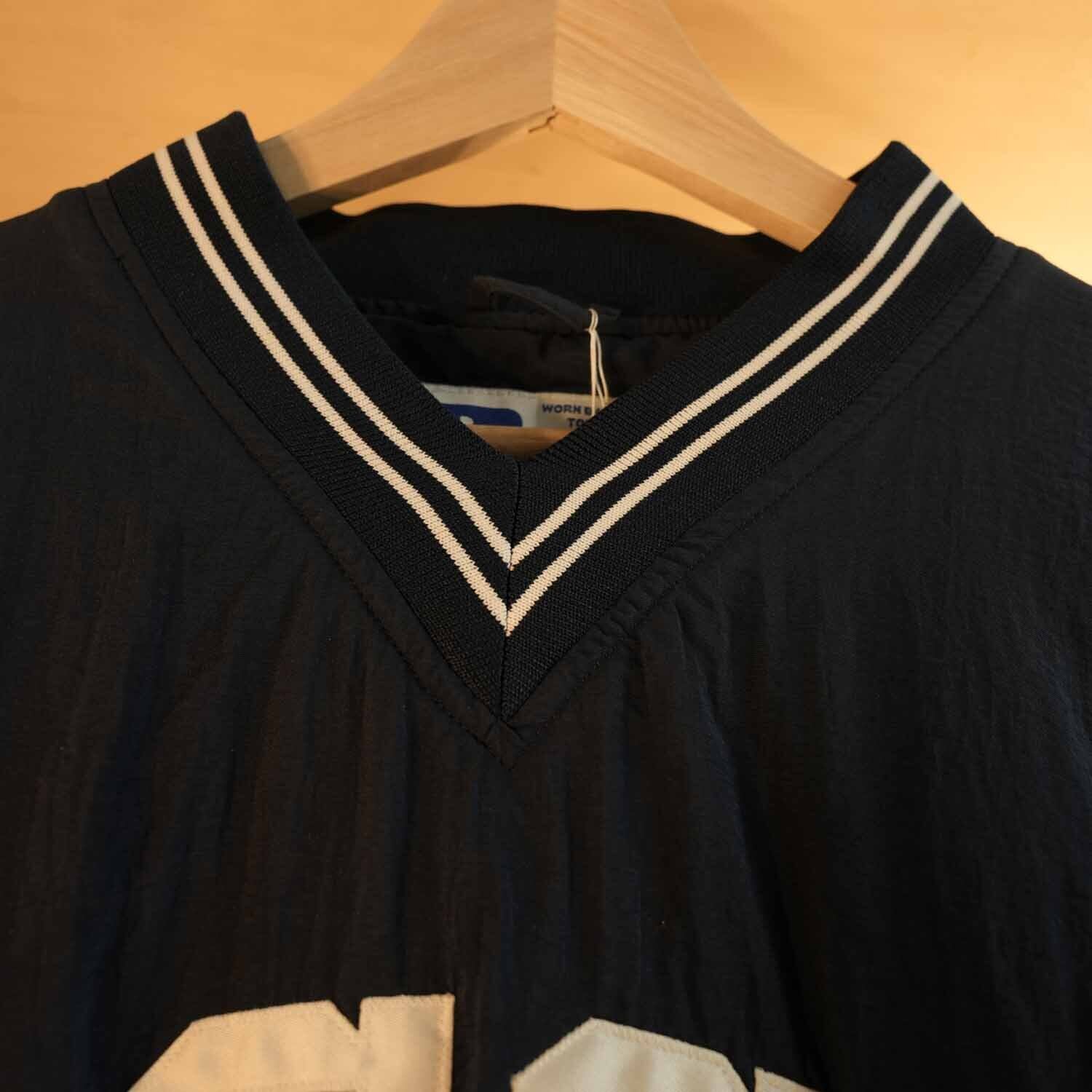 ネイビー×ホワイトの好配色に、リブライン入りのVネック&裾リブ仕様。裾はジップ付きでシルエットの調整も可能。ラグランスリーブで肩まわりにゆとりがあり、インナーにスウェットやフーディーを重ねてもストレスなく着用できます。