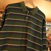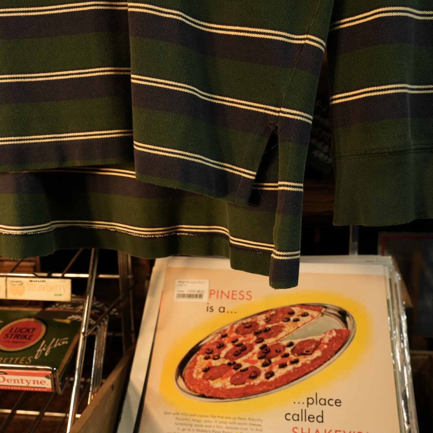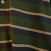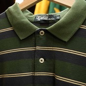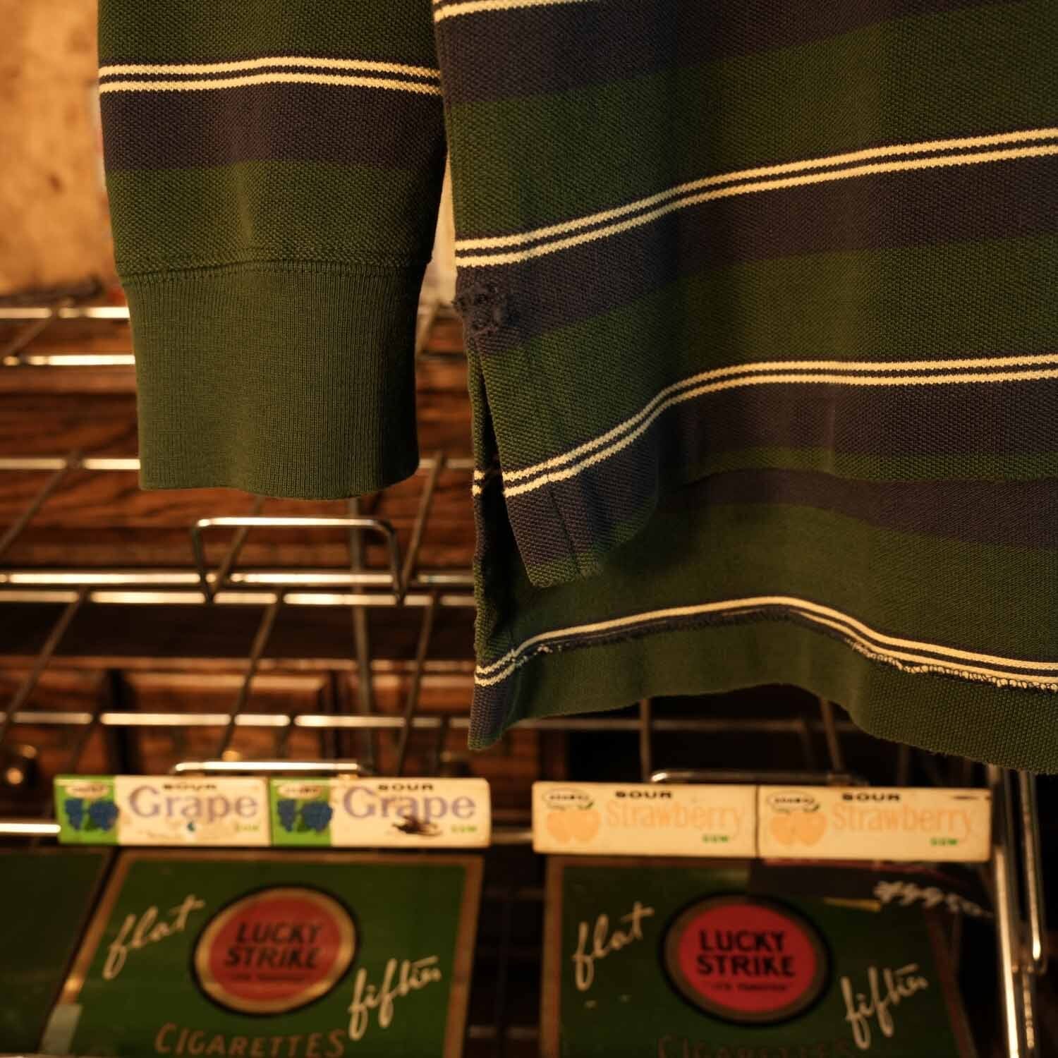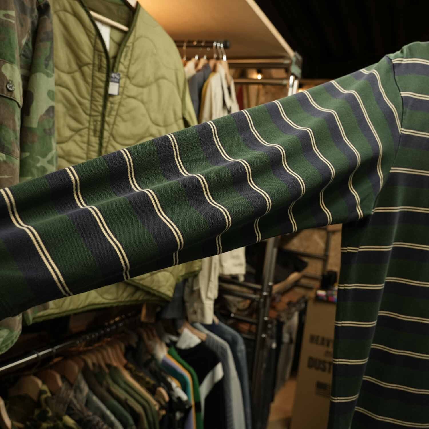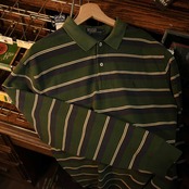 こちらは、オールドポロらしい風合いが魅力のボーダーラガーシャツ/長袖ポロシャツ。深みのあるグリーン×ネイビーに、生成りのラインを走らせた品のある配色。トラッドな雰囲気とアメカジのラフさを絶妙に両立しています。