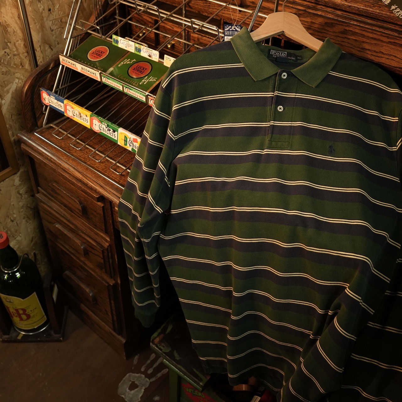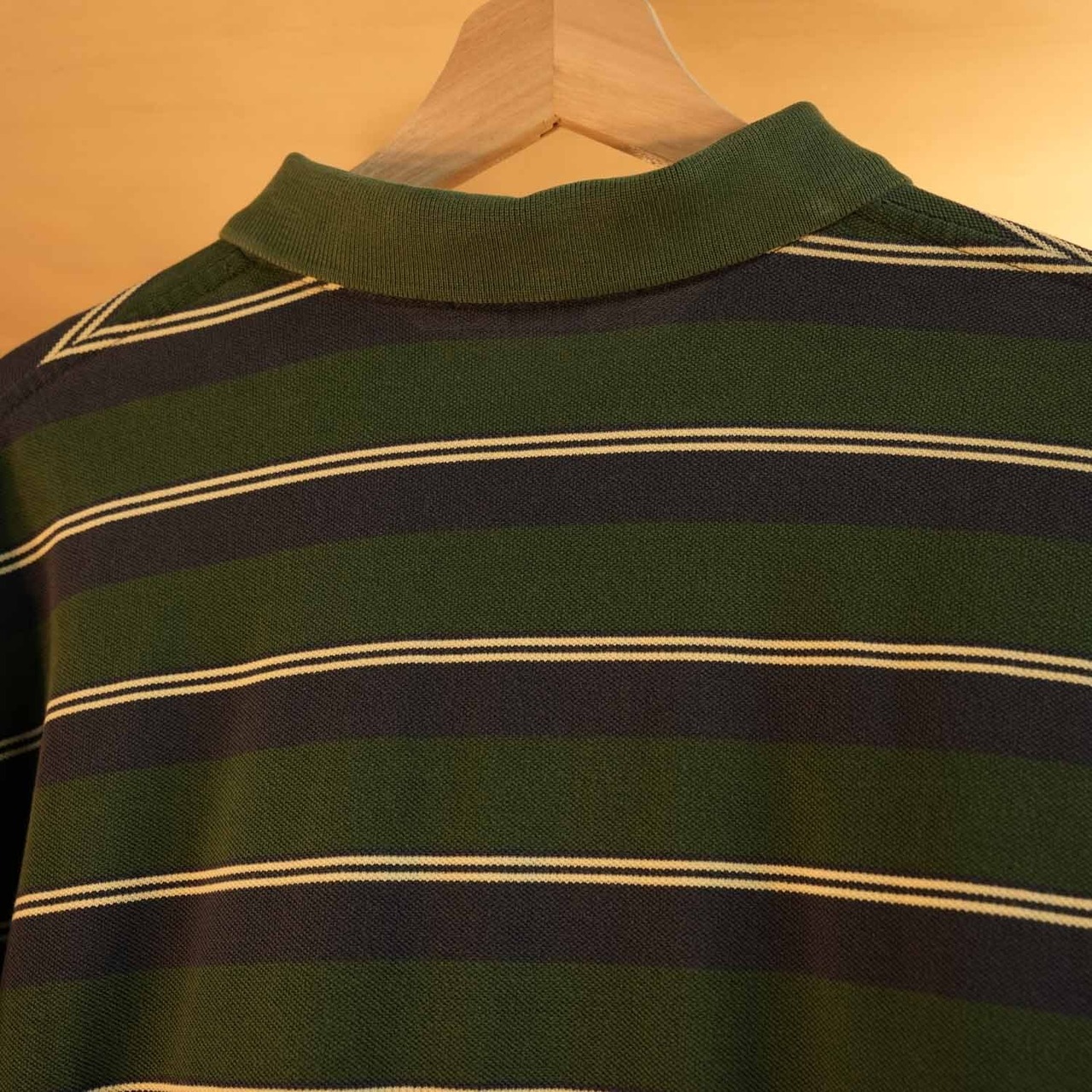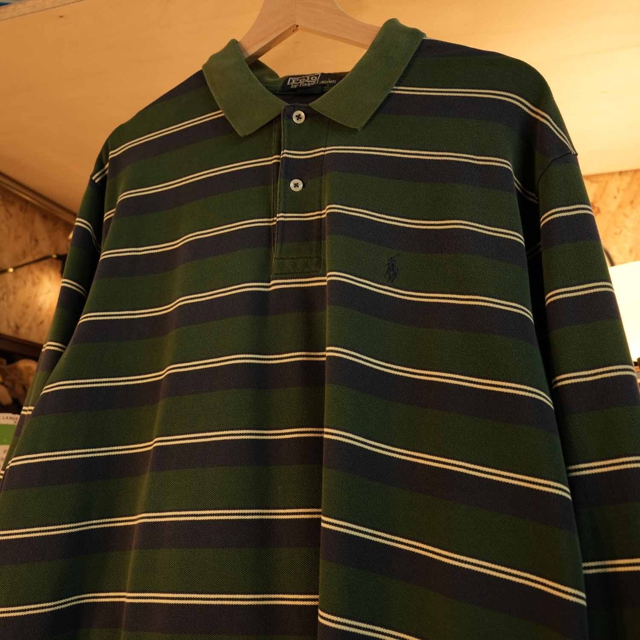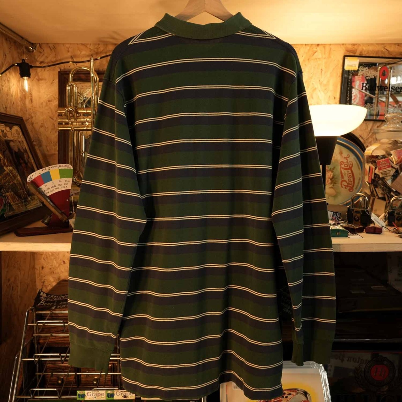 こちらは、オールドポロらしい風合いが魅力のボーダーラガーシャツ/長袖ポロシャツ。深みのあるグリーン×ネイビーに、生成りのラインを走らせた品のある配色。トラッドな雰囲気とアメカジのラフさを絶妙に両立しています。