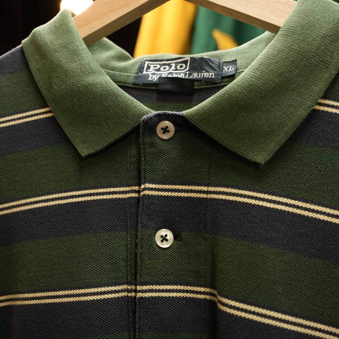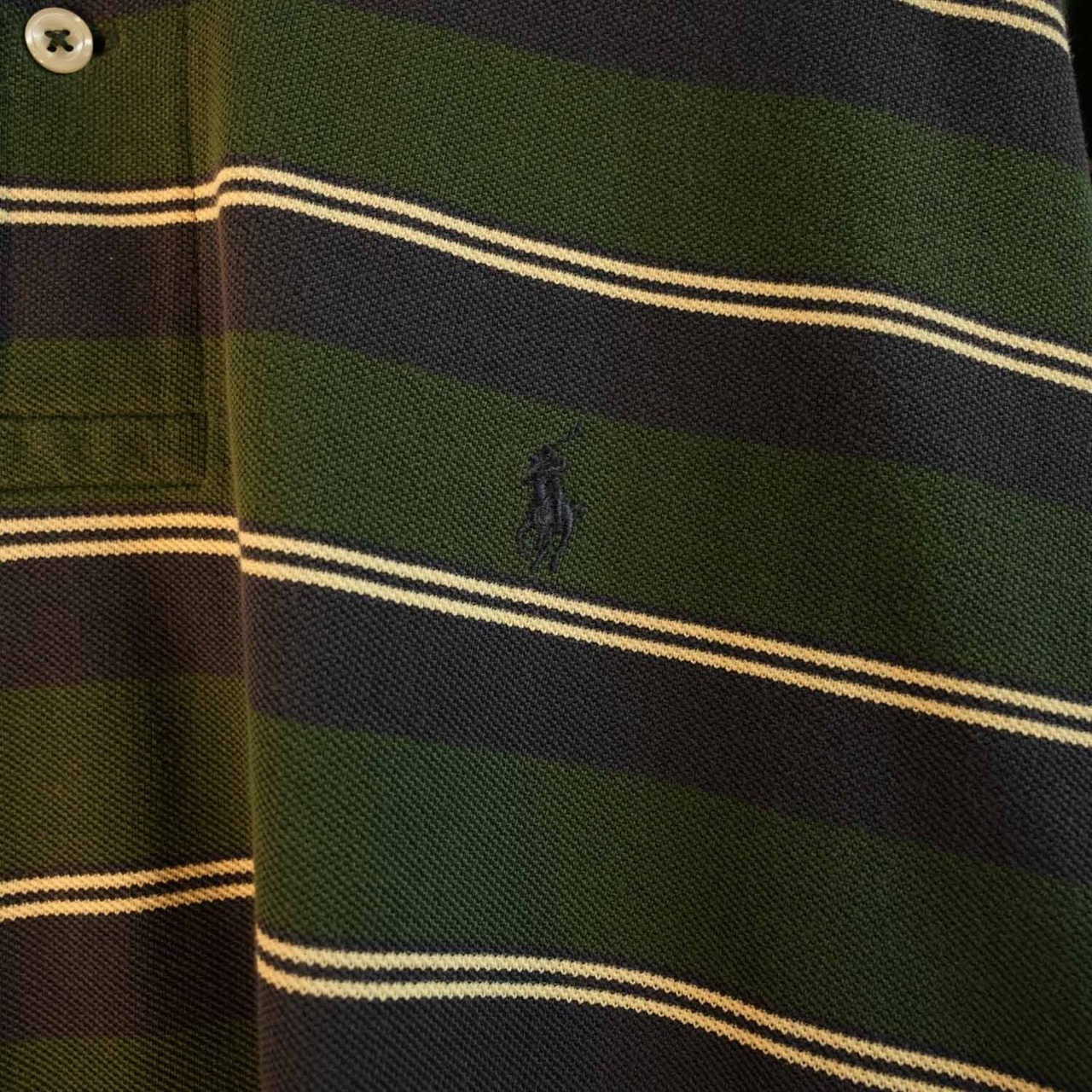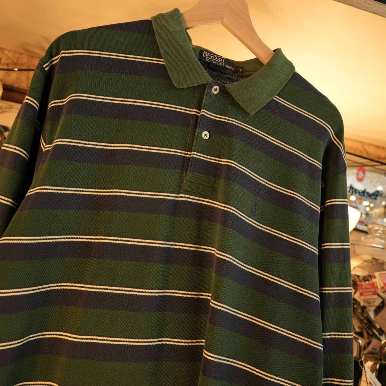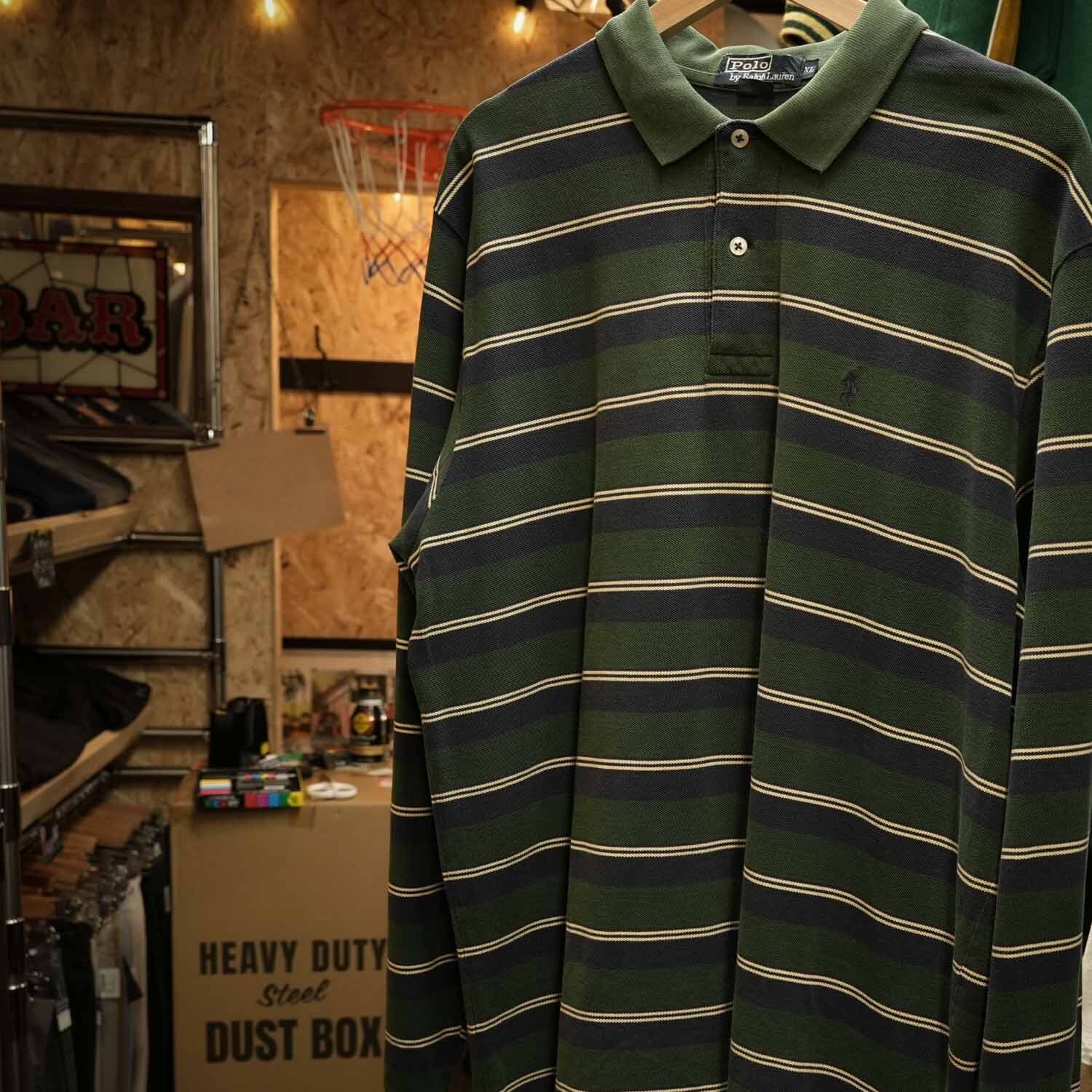 Polo by Ralph Lauren 90s〜00s ボーダー ラガーシャツ XL コットン 長袖ポロ グリーン×ネイビー オールド ポロ ラルフローレン 古着【furugi-0724】
