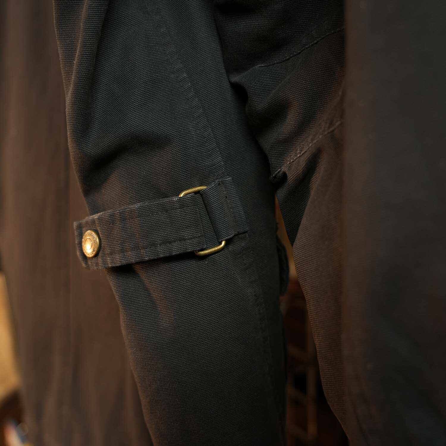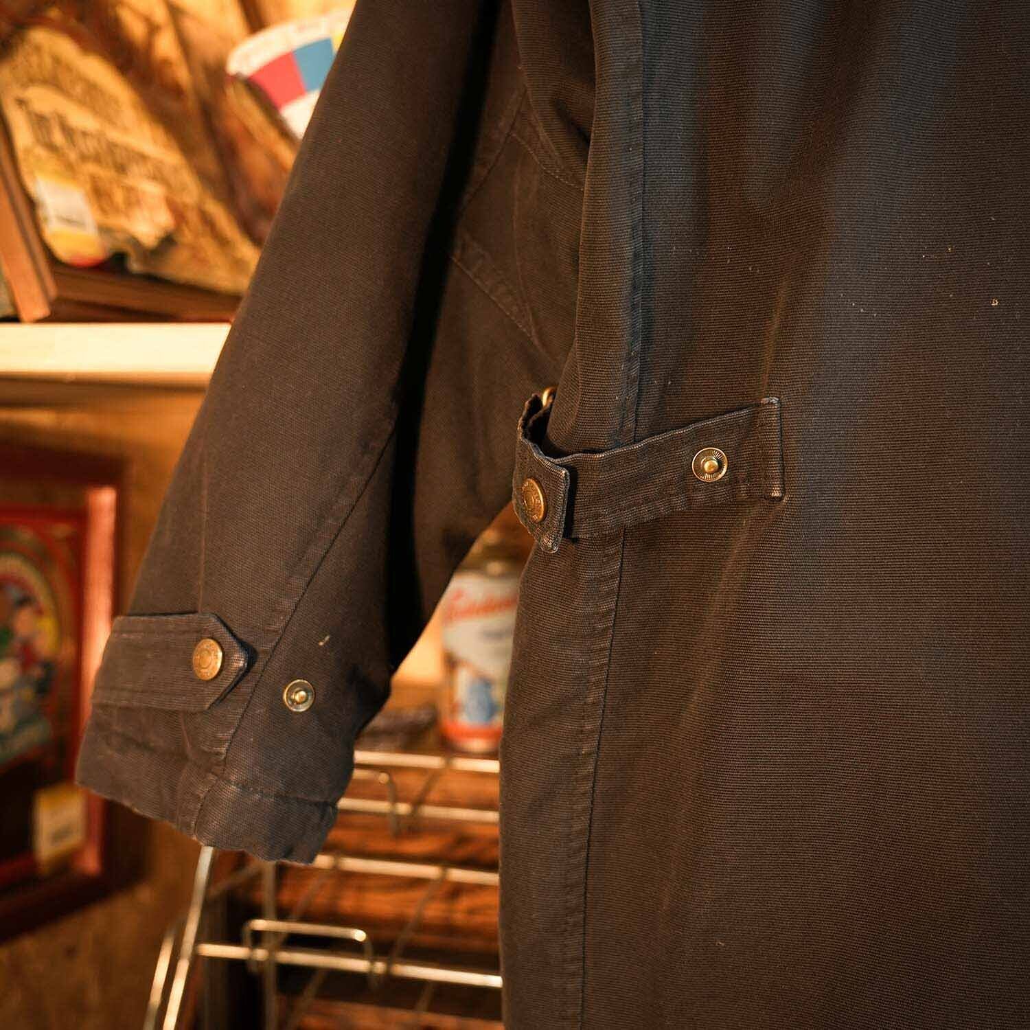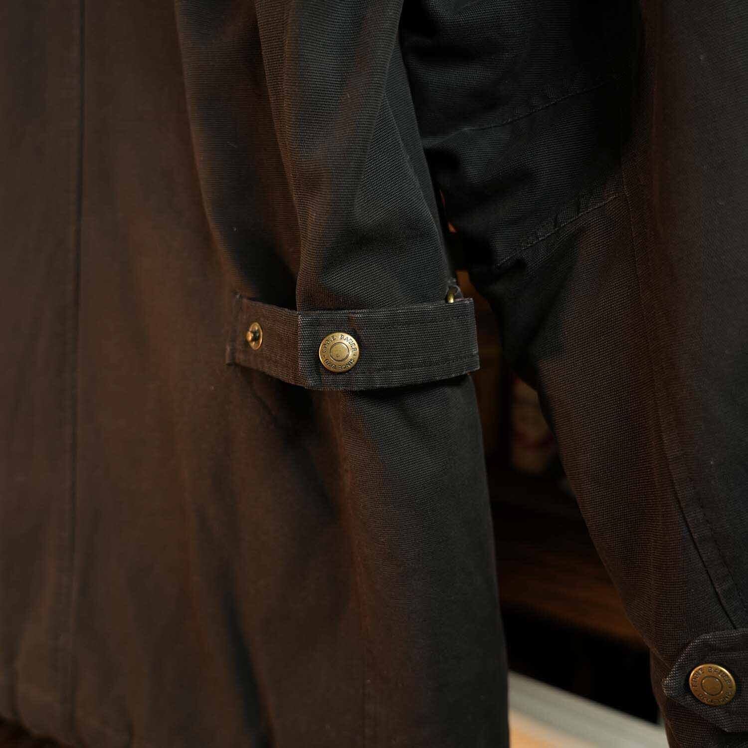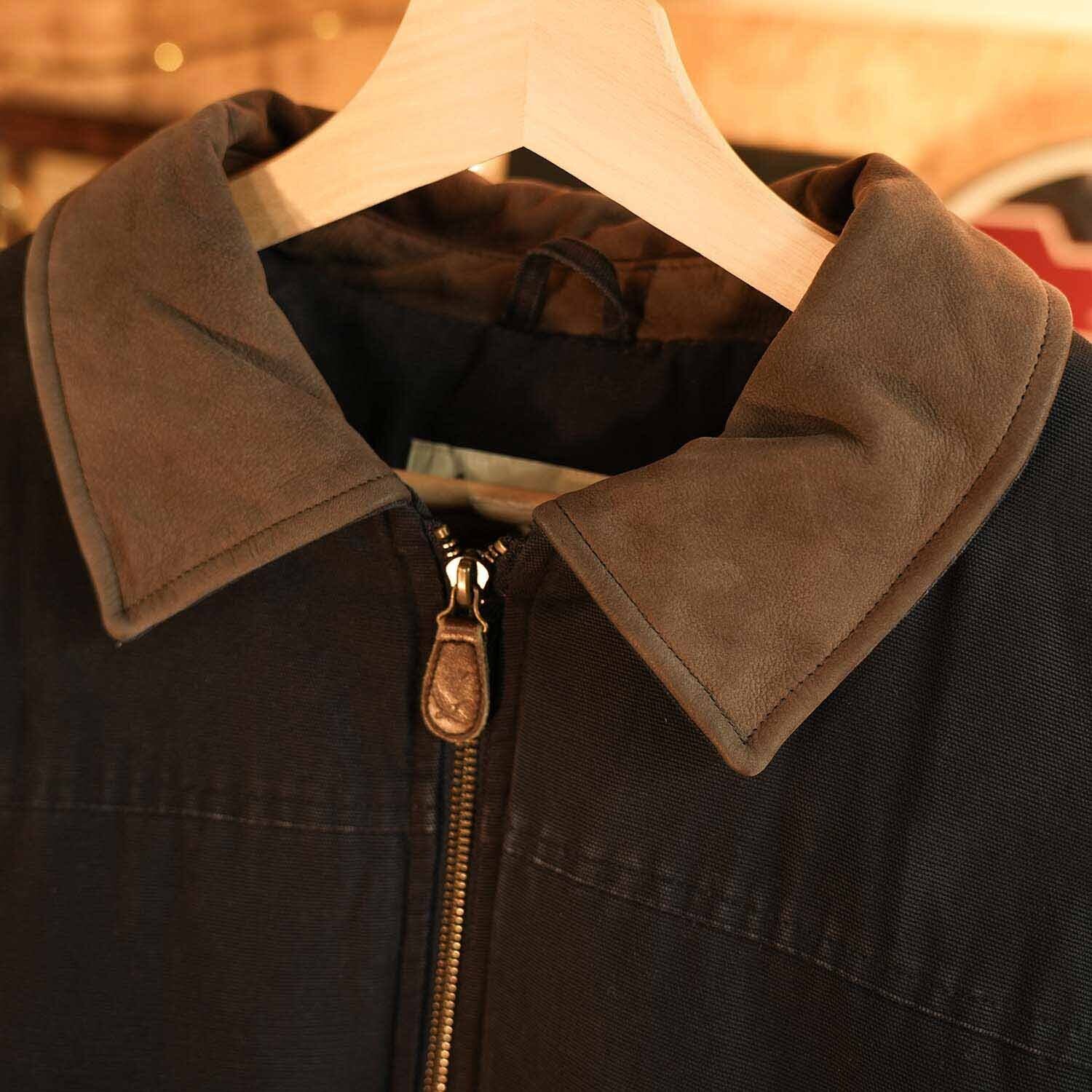 襟には**本革スエード(Genuine Leather)**を使用し、無骨なワークテイストの中にも上品なアクセントをプラス。サイドにはウエストアジャスター、袖口にはメタルスナップボタンを装備し、防風性・防寒性・機能性のすべてを兼ね備えています。