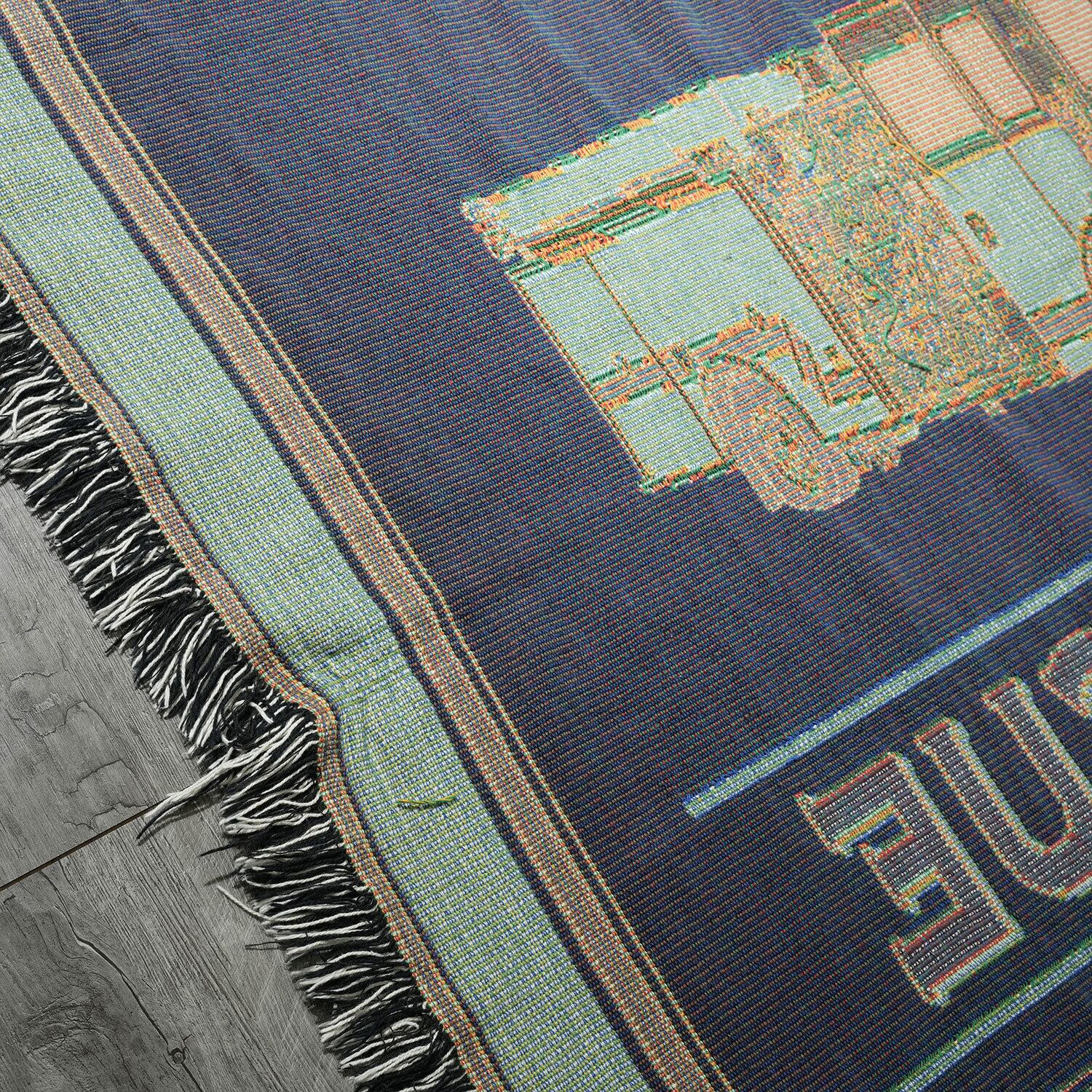中央に堂々と描かれたアメリカンな消防車と、消防士の誇りであるマルチーズ・クロス(記章)。そして「EST. 1953 GEORGIA」の文字が、1953年に設立された同消防署の歴史と伝統を物語っています。 プリントではなく、太めの糸でしっかりと織り込まれた「ジャガード織り」仕様のため、立体感のあるリッチな手触りと、使い込むほどに馴染む風合いが楽しめます。生成り色のベースに、深みのあるバーガンディ(ワインレッド)の縁取りが、クラシックかつ重厚な雰囲気を醸し出しています。