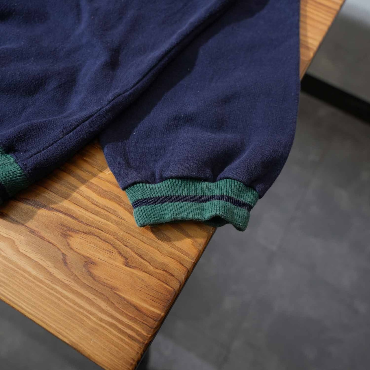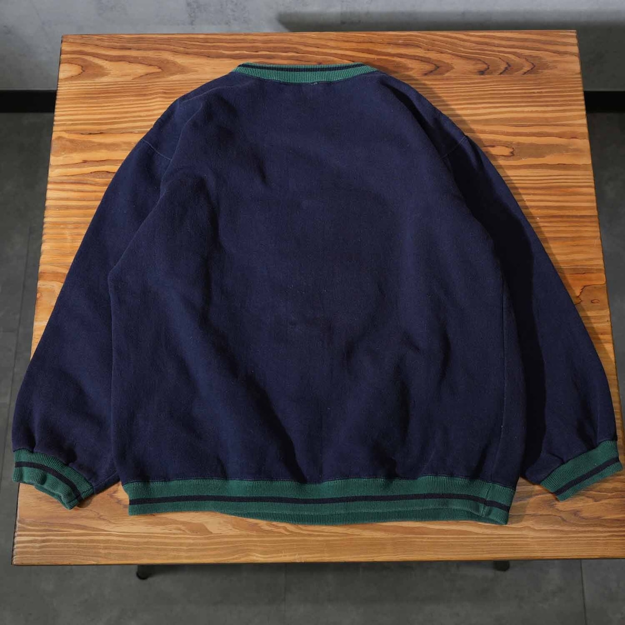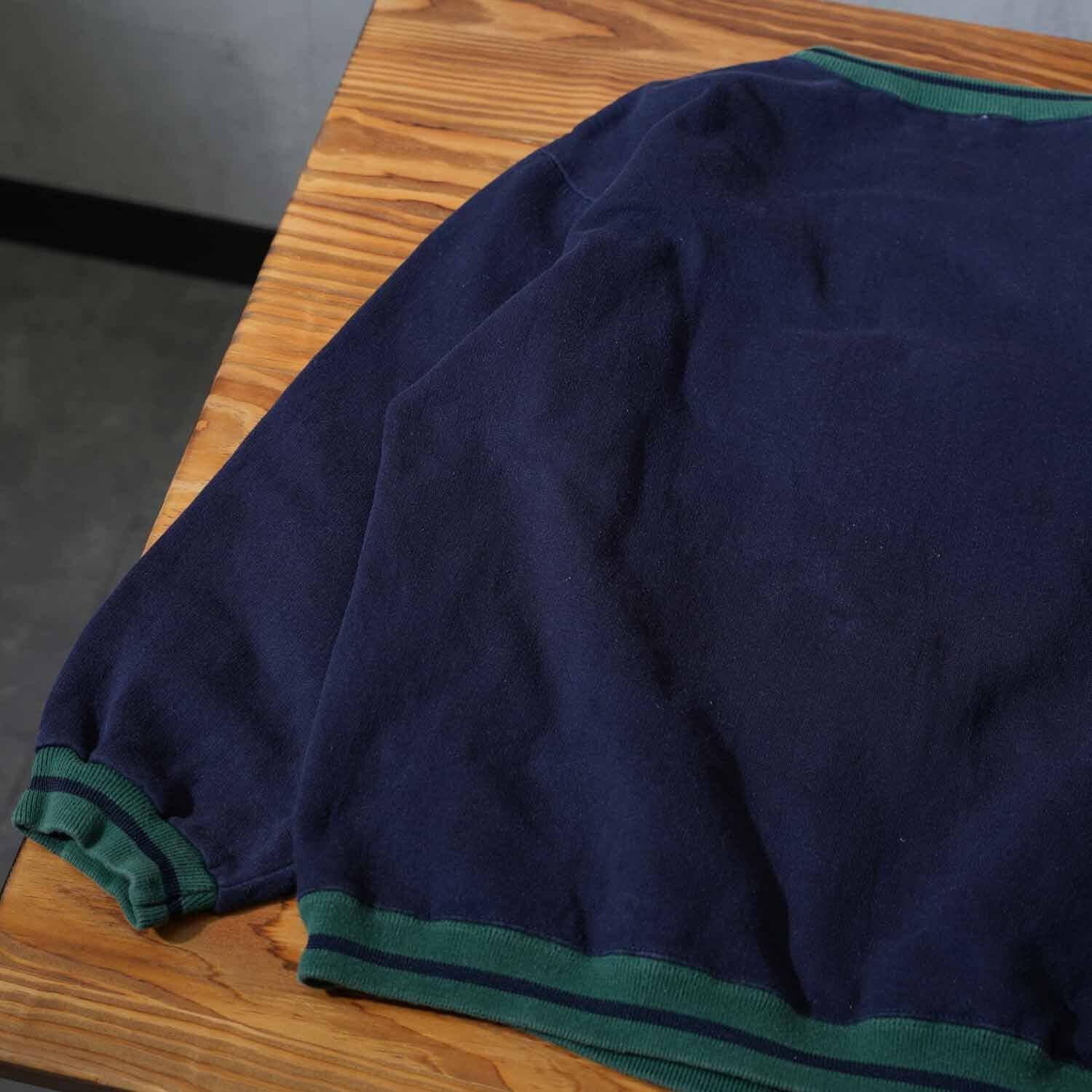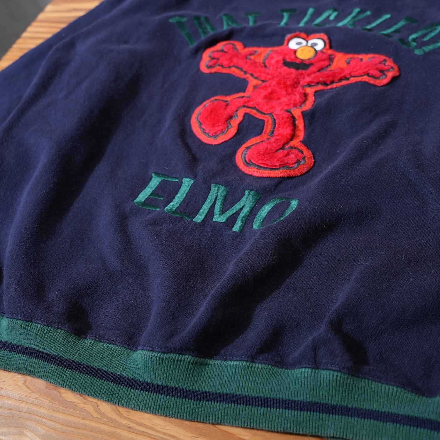 ボディはネイビーカラーにグリーンリブの配色。フロントには「THAT TICKLES! ELMO」の刺繍ロゴと、エルモをワッペン表現した存在感抜群のデザイン。90年代ならではの贅沢な仕様です。