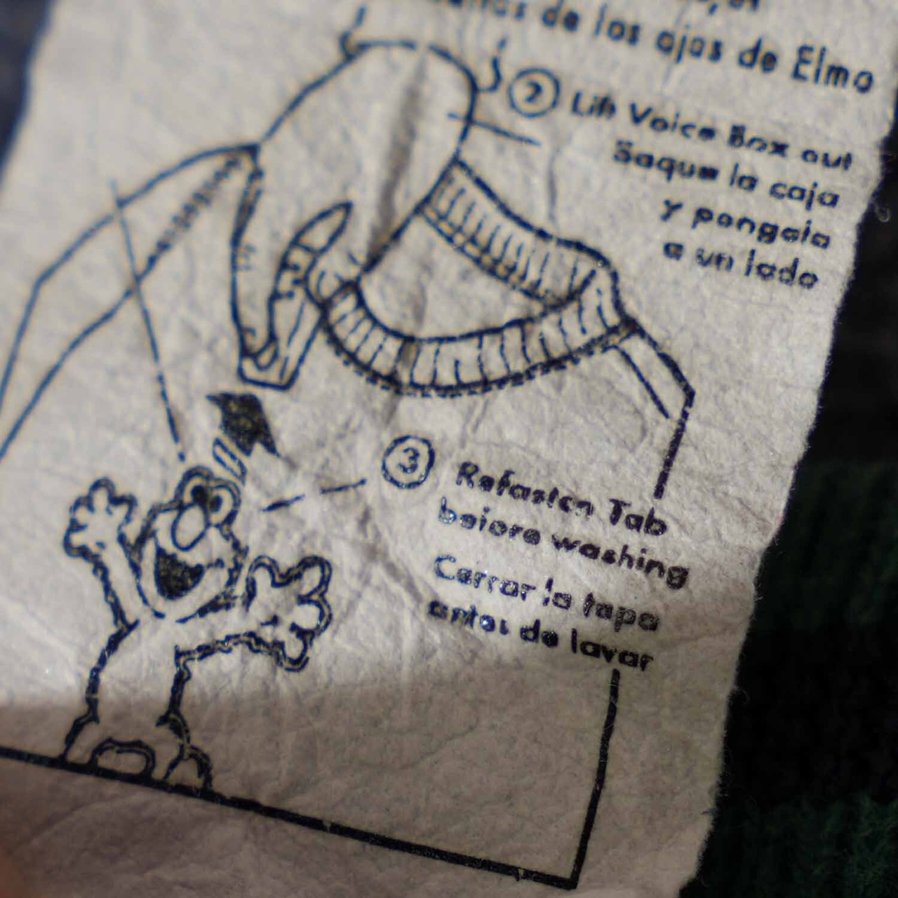 本来は胸部分にボイスボックスを内蔵し、触ると音が鳴るギミック付きモデルで、内側タグには「洗濯前にボイスボックスを取り外す」ための図解入り注意書きが縫い付けられています。本品はボイスボックス欠品となりますが、こうした遊び心ある背景こそが当時のセサミストリート公式アイテムらしさを物語るポイント。(ボイスギミックは欠損)