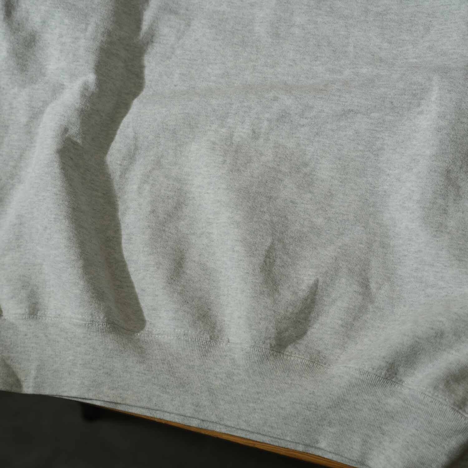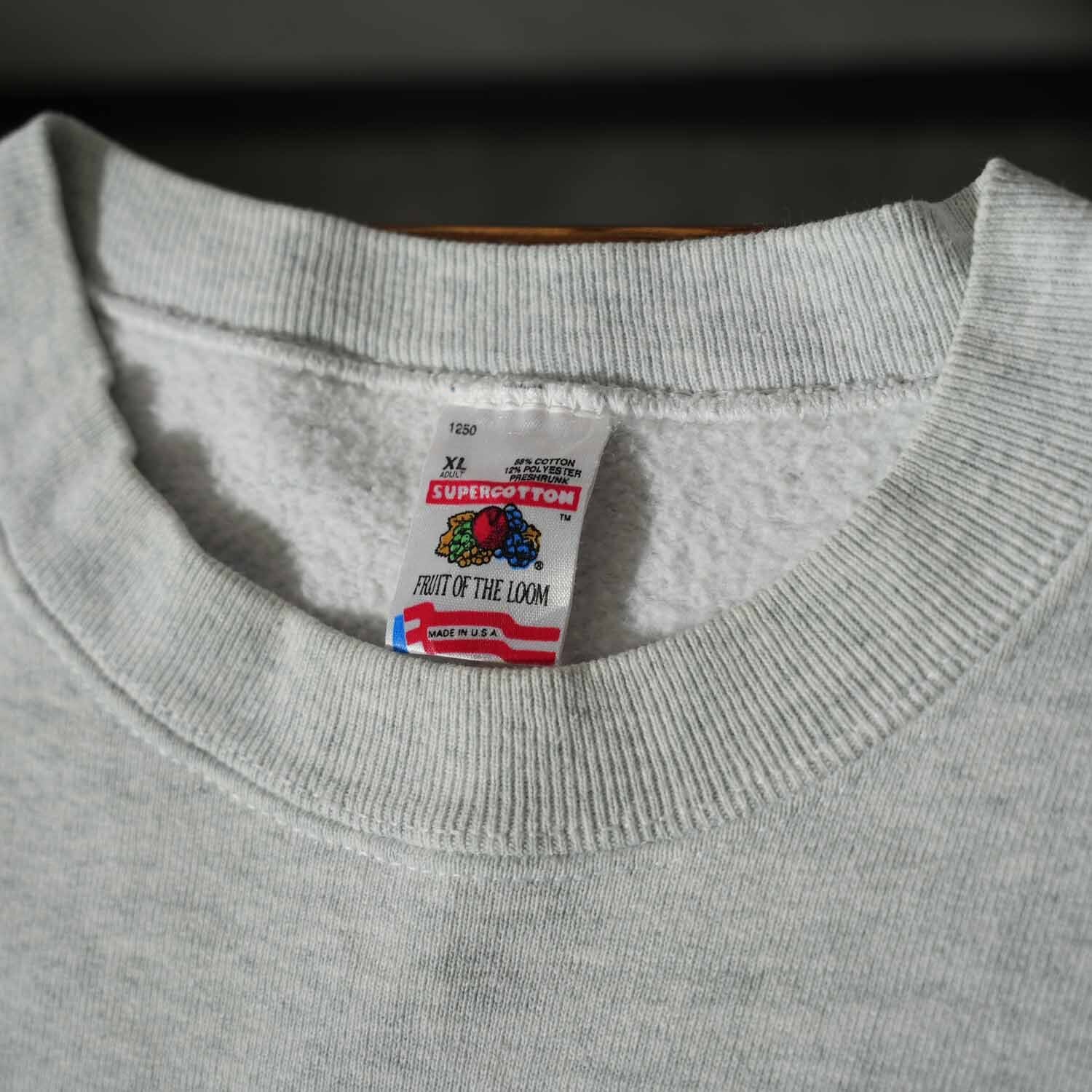 アメリカを代表するボディメーカー、フルーツオブザルームの「SUPER COTTON」シリーズを使用した、90年代前半〜中頃の一着です。USA製ならではの縫製と、コットン比率の高いヘビーオンス生地が特徴で、手に取った瞬間に分かるしっかりとした重量感。裏起毛も密度があり、軽さ重視の現行品とは異なる、無骨でアメリカンな雰囲気を存分に楽しめます。