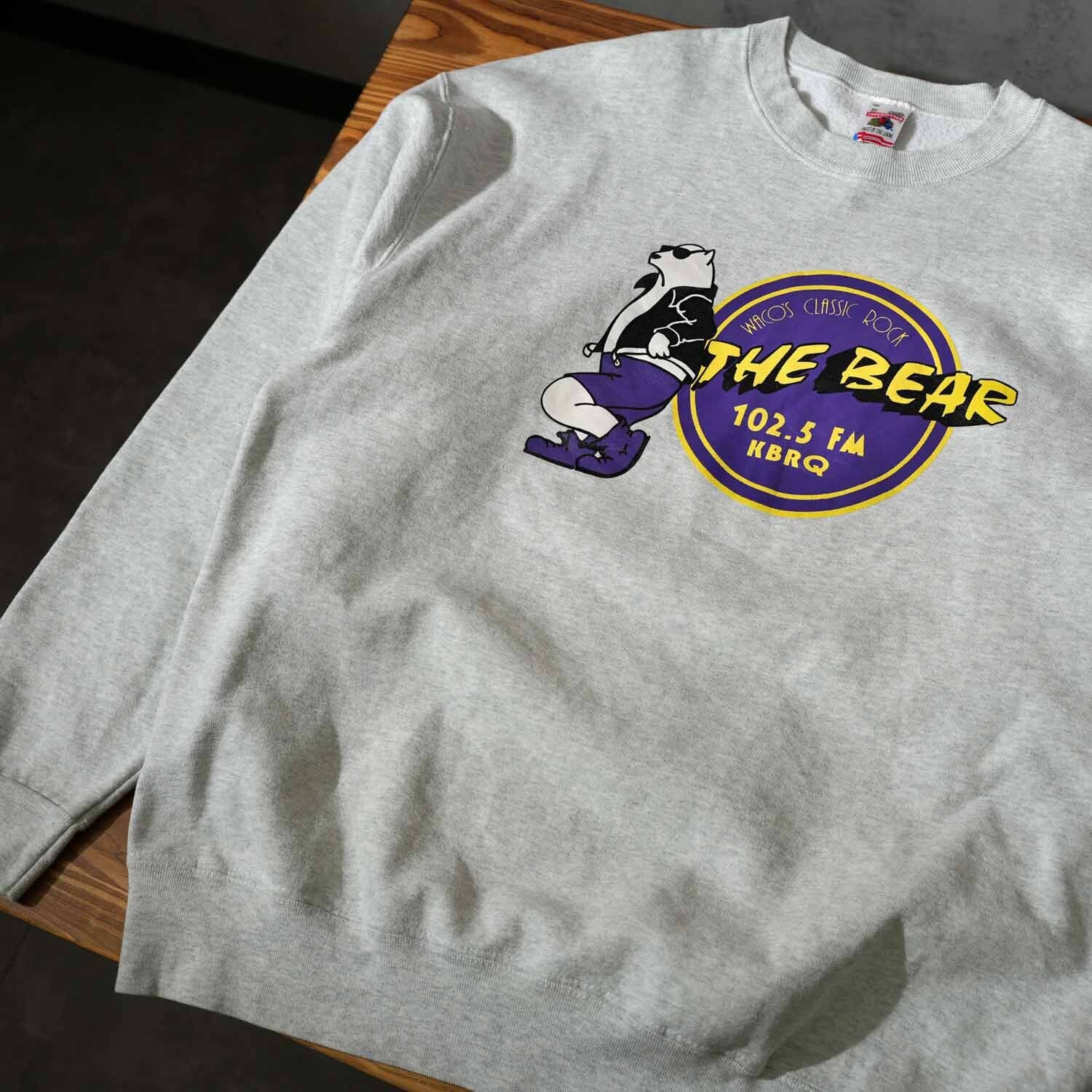 90s USA製 FRUIT OF THE LOOM・ヘビーオンス】THE BEAR 102.5 FM KBRQ ラジオ局プリント スウェット 熊グラフィック 古着【furugi-1824】