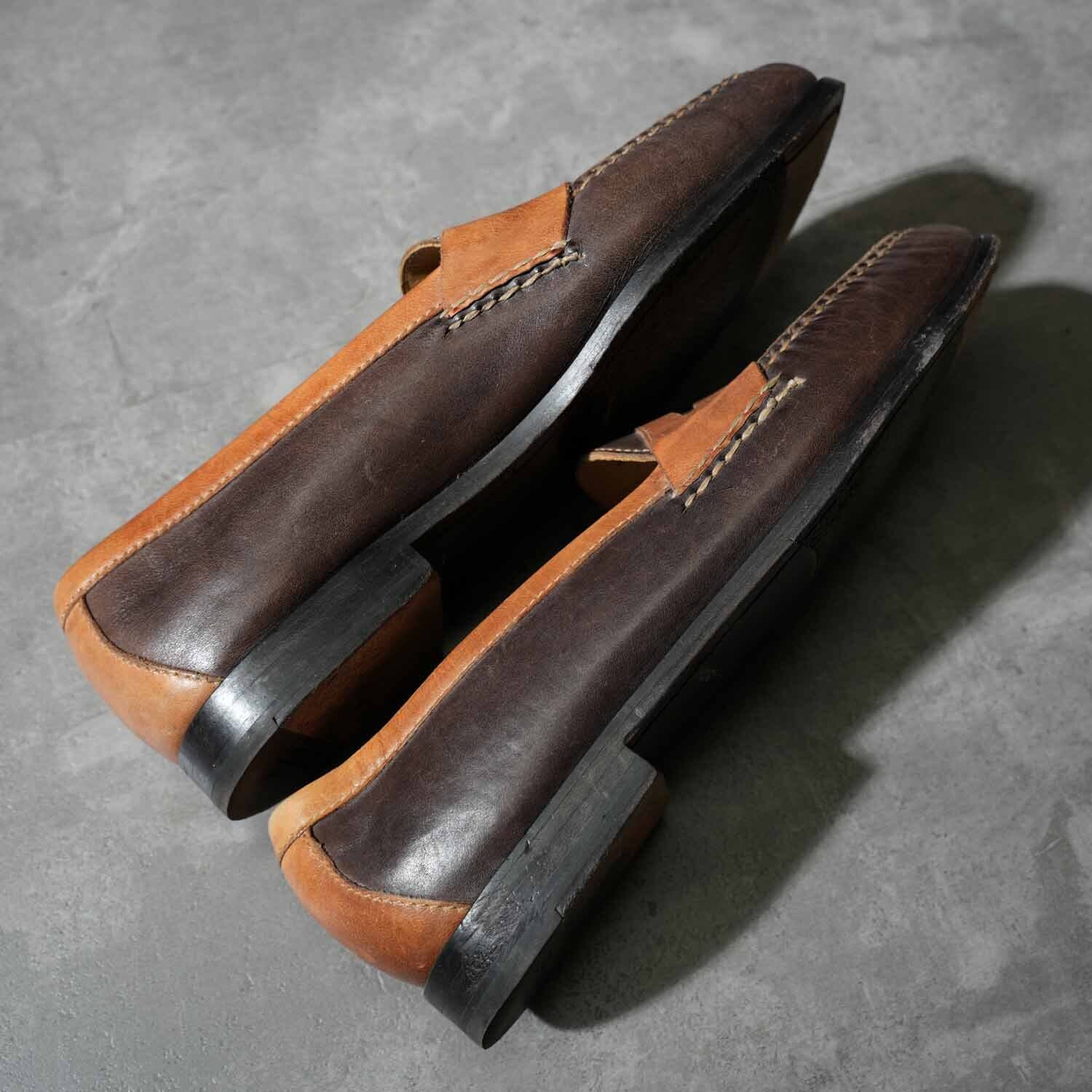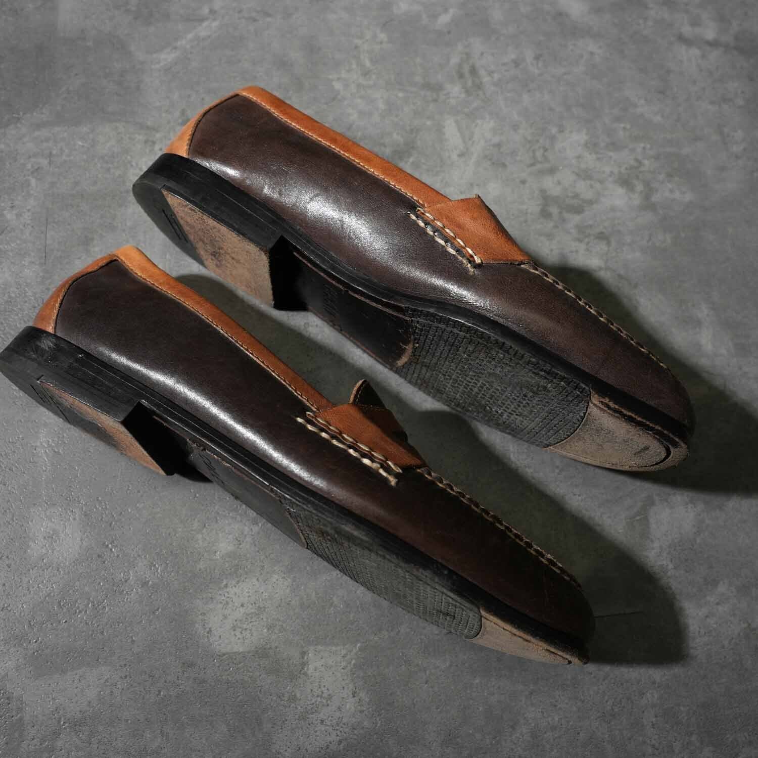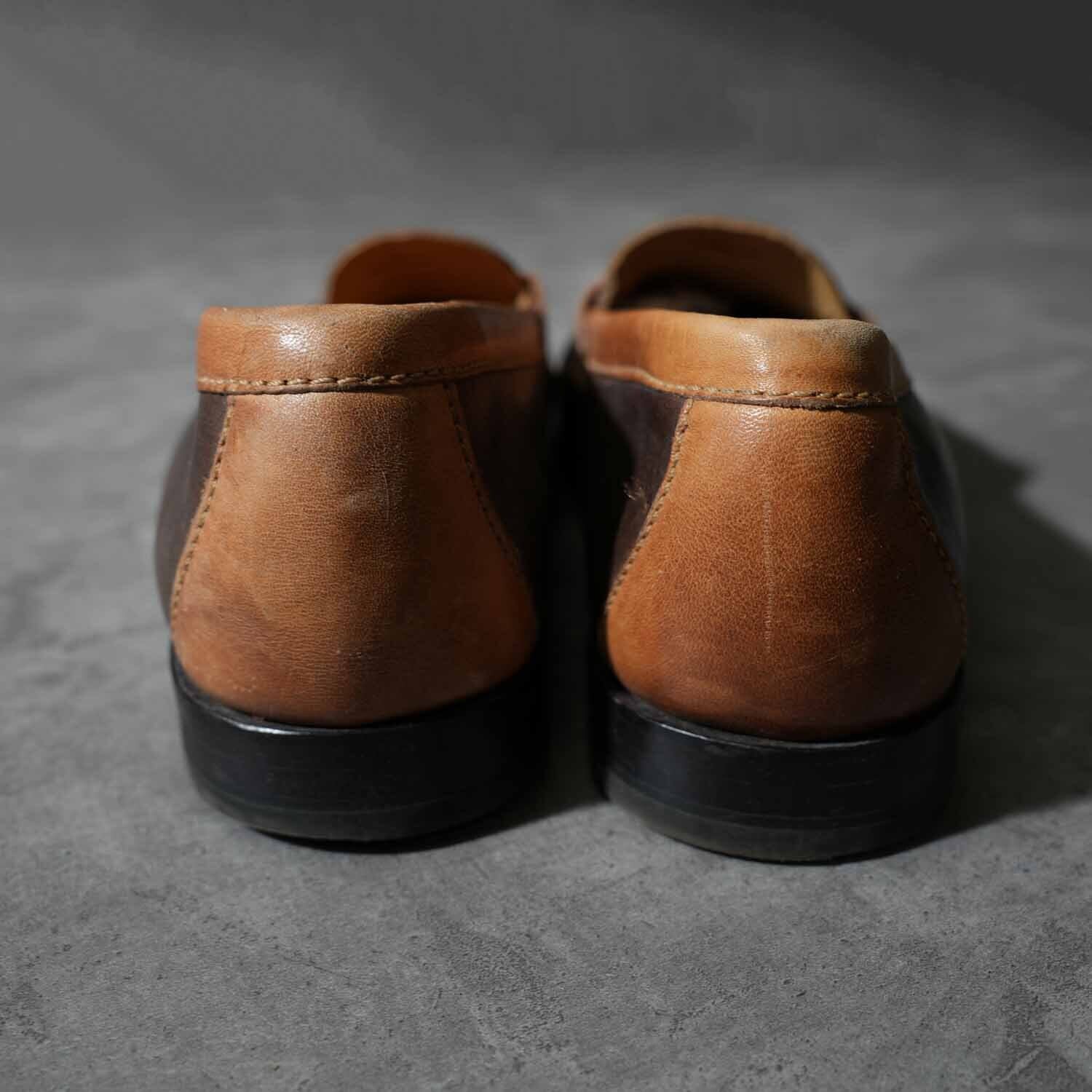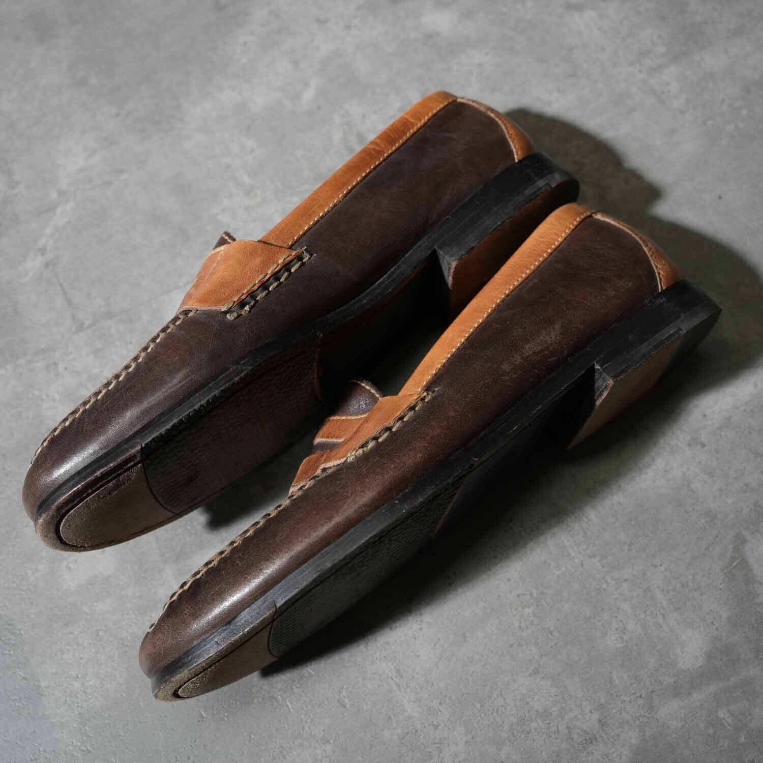 アッパーにはブラウン系レザーを使用。履き込みによる自然なシワや艶の変化が見られ、古着ならではの表情がしっかりと育った個体。ローファーらしいスマートなトゥラインと、程よくカジュアルなバランス感は、デニムやチノパンはもちろん、スラックス外しにも相性良好。